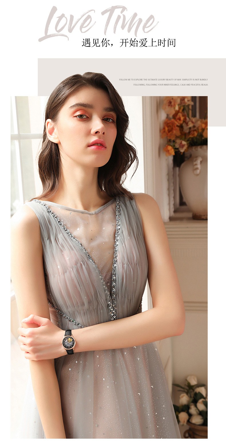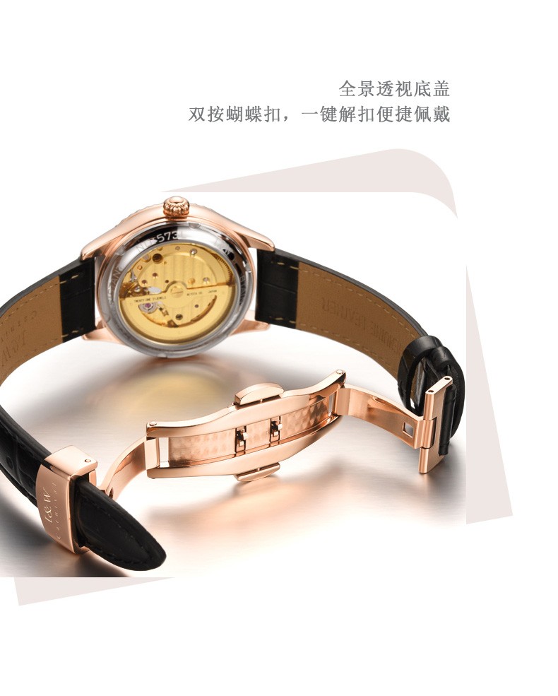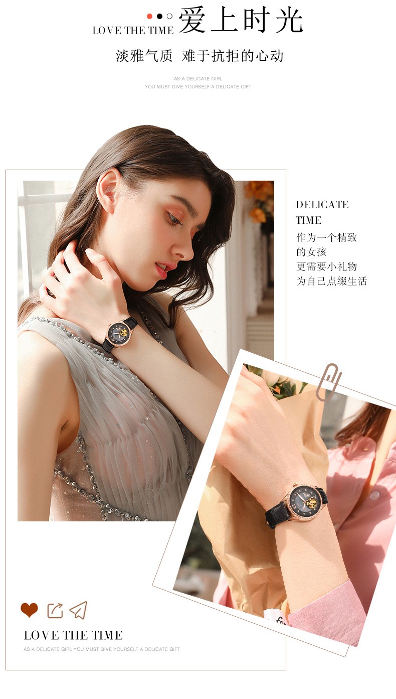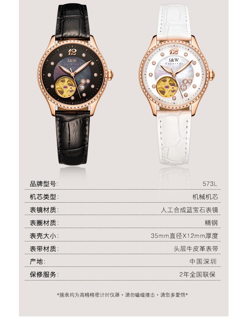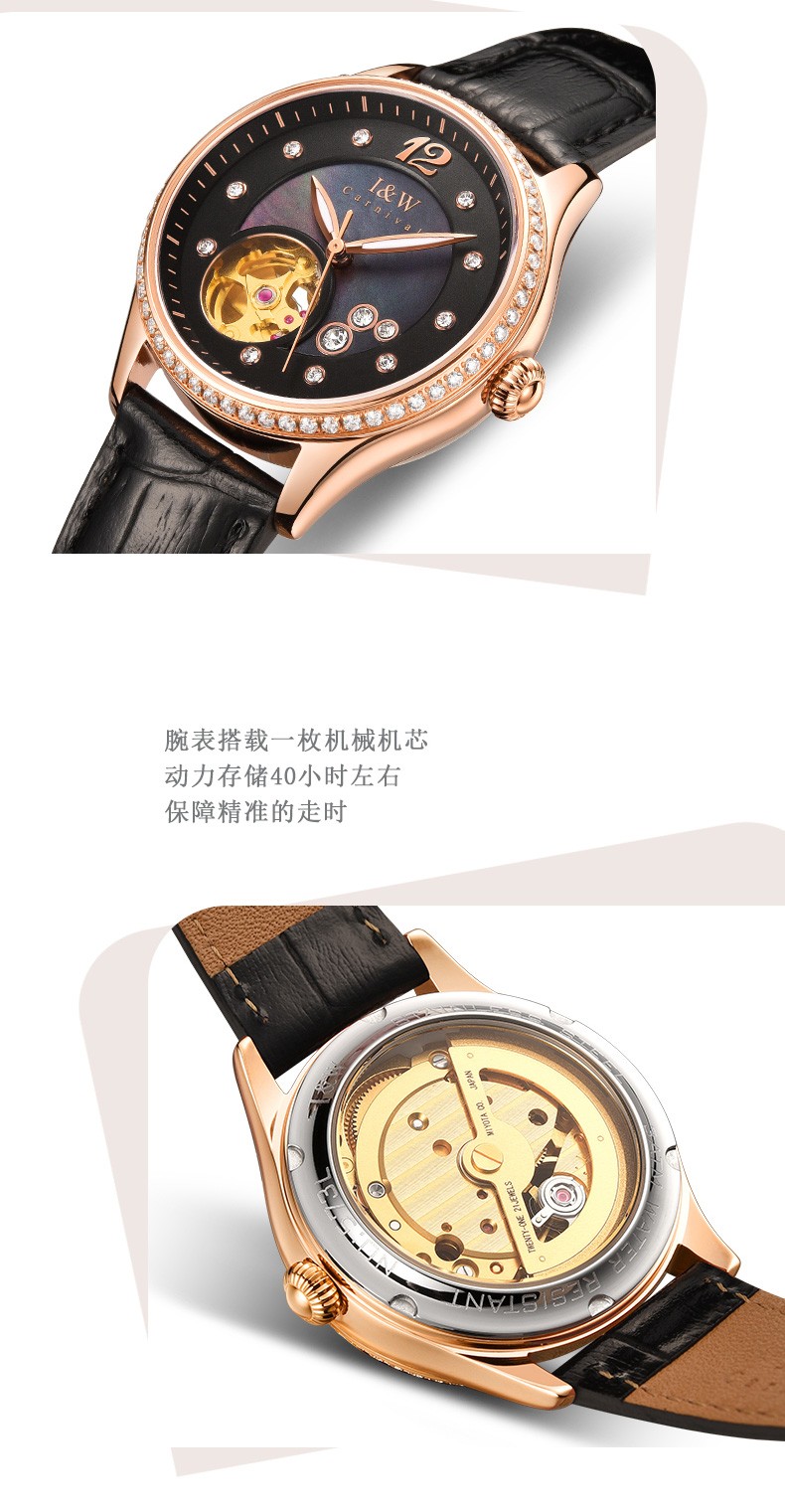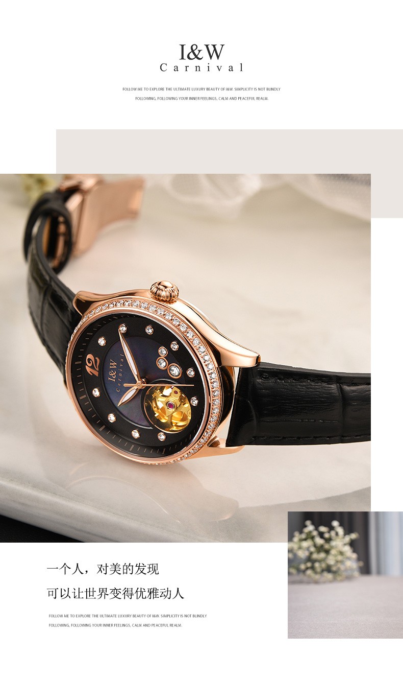 爱沃驰瑞士星座系列时尚镂空防水全自动机械手表女士表七夕生日礼物送女 玫壳白盘黑皮|进口机芯