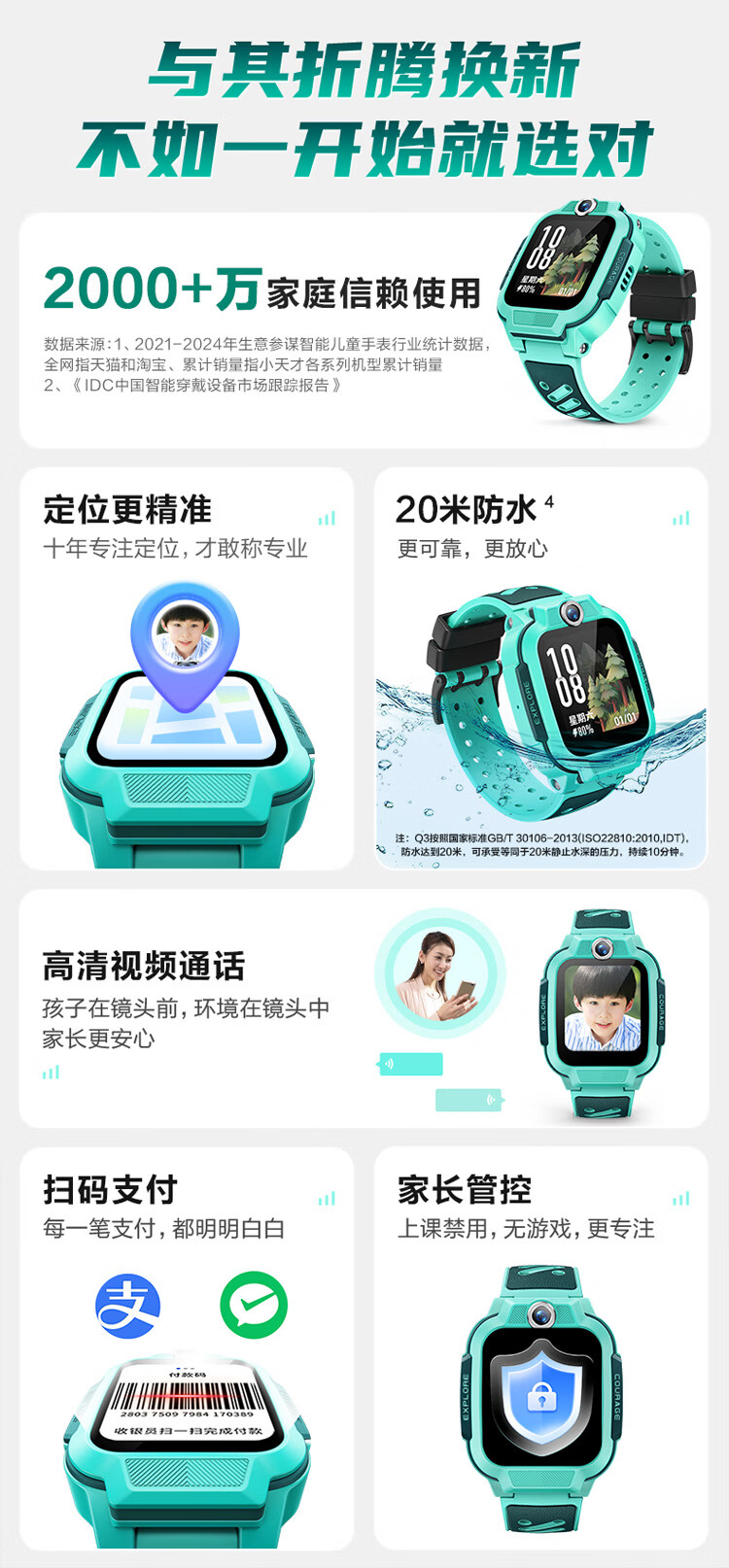 小天才儿童电话手表Q3玉髓绿AI精准定位防水大屏视频通话学生儿童智能手表爆款升级移动支付男孩女孩