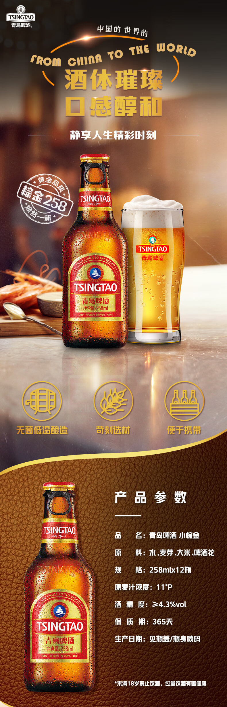 青岛啤酒原麦汁浓度11°P啤酒 拉环小棕金箱啤 258mL 12瓶
