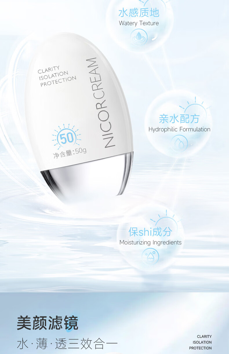 NICOR清透隔离长效防护霜spf50防水防汗紫外学生女生水润保湿轻薄 冰爽美肌防护霜60g(1盒装)