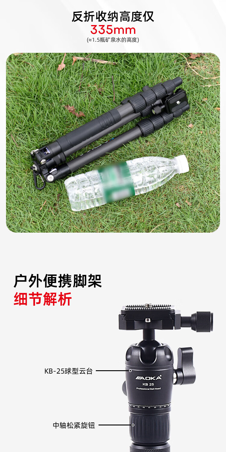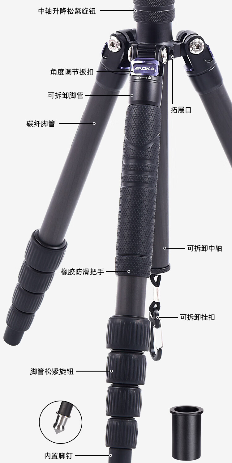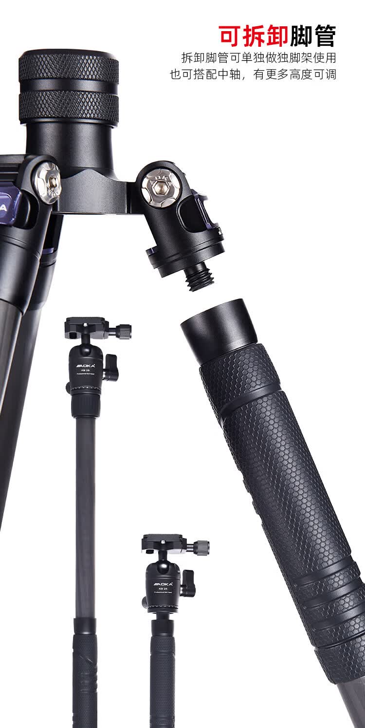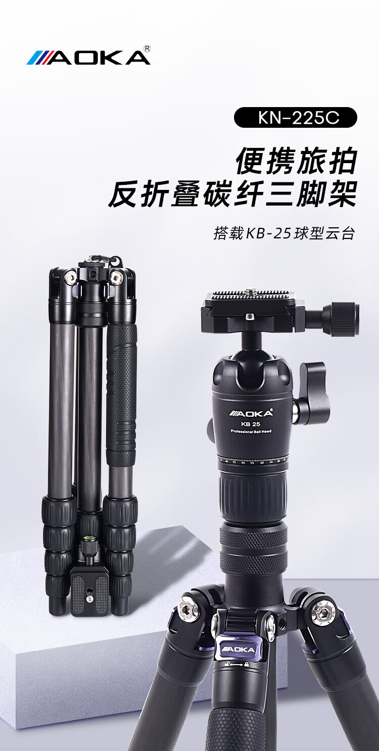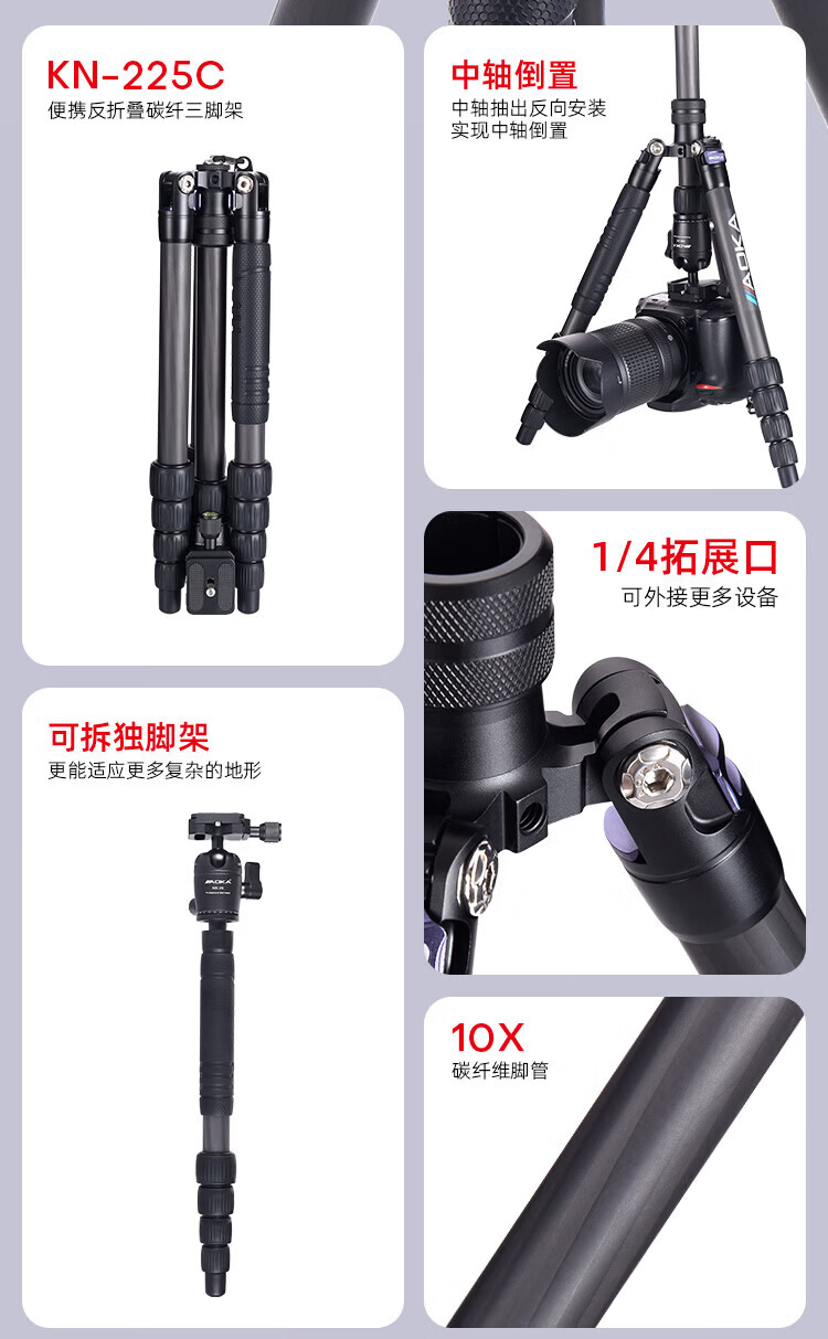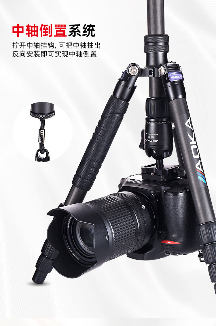 AOKA奥咔KN225C碳纤维便携轻型单反 微单三脚架三角架 手机拍照自拍户外摄影 【KN225C三脚架+云台+中轴套装可拆独脚架】 佳能 尼康 索尼 富士相机专用