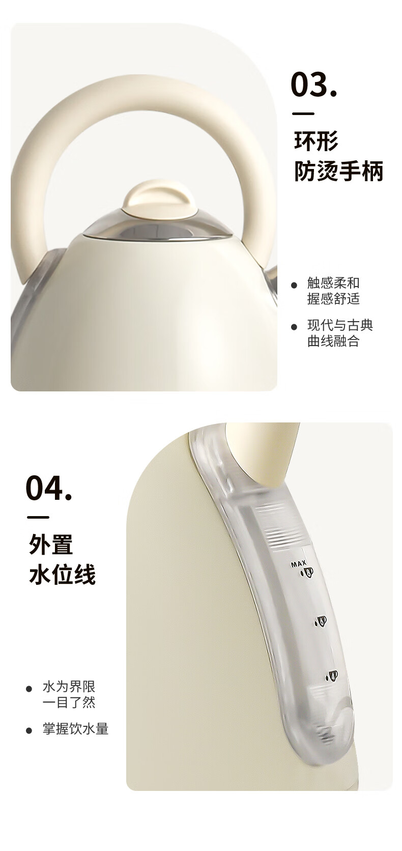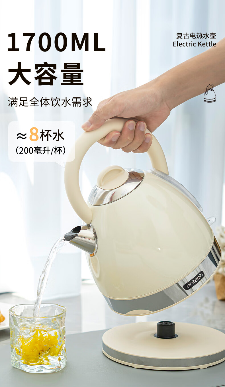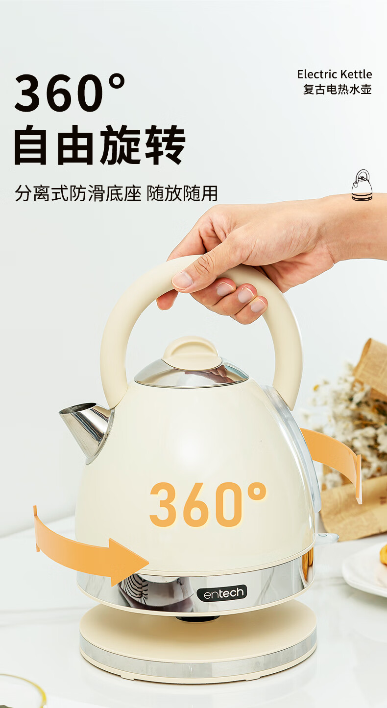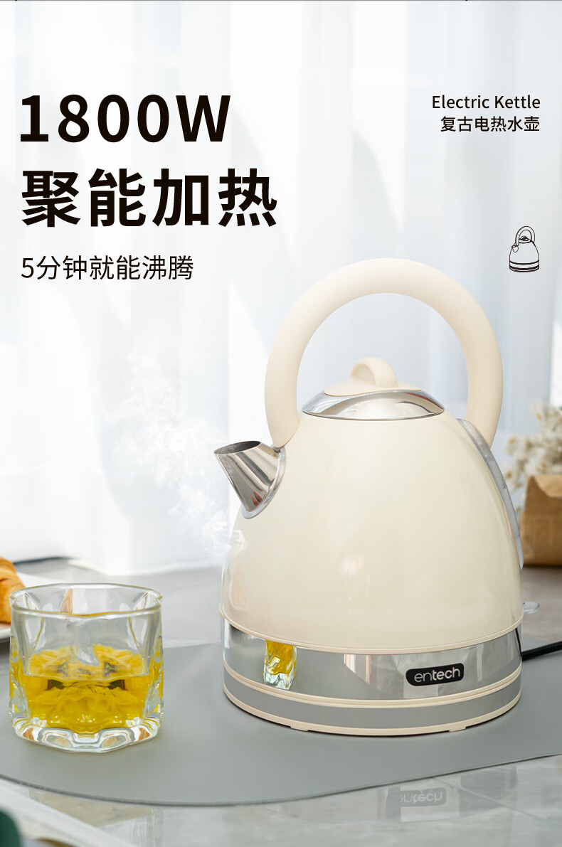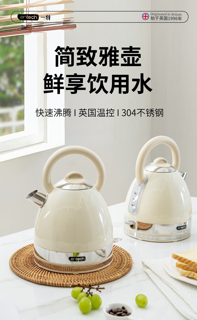 一特(EnTech)英伦复古1800W快速烧水壶家用高颜值高端电热水壶大容量分体式加厚304不锈钢电烧水自动断电防干烧 1.7L 专柜款-奶油白(带水窗)