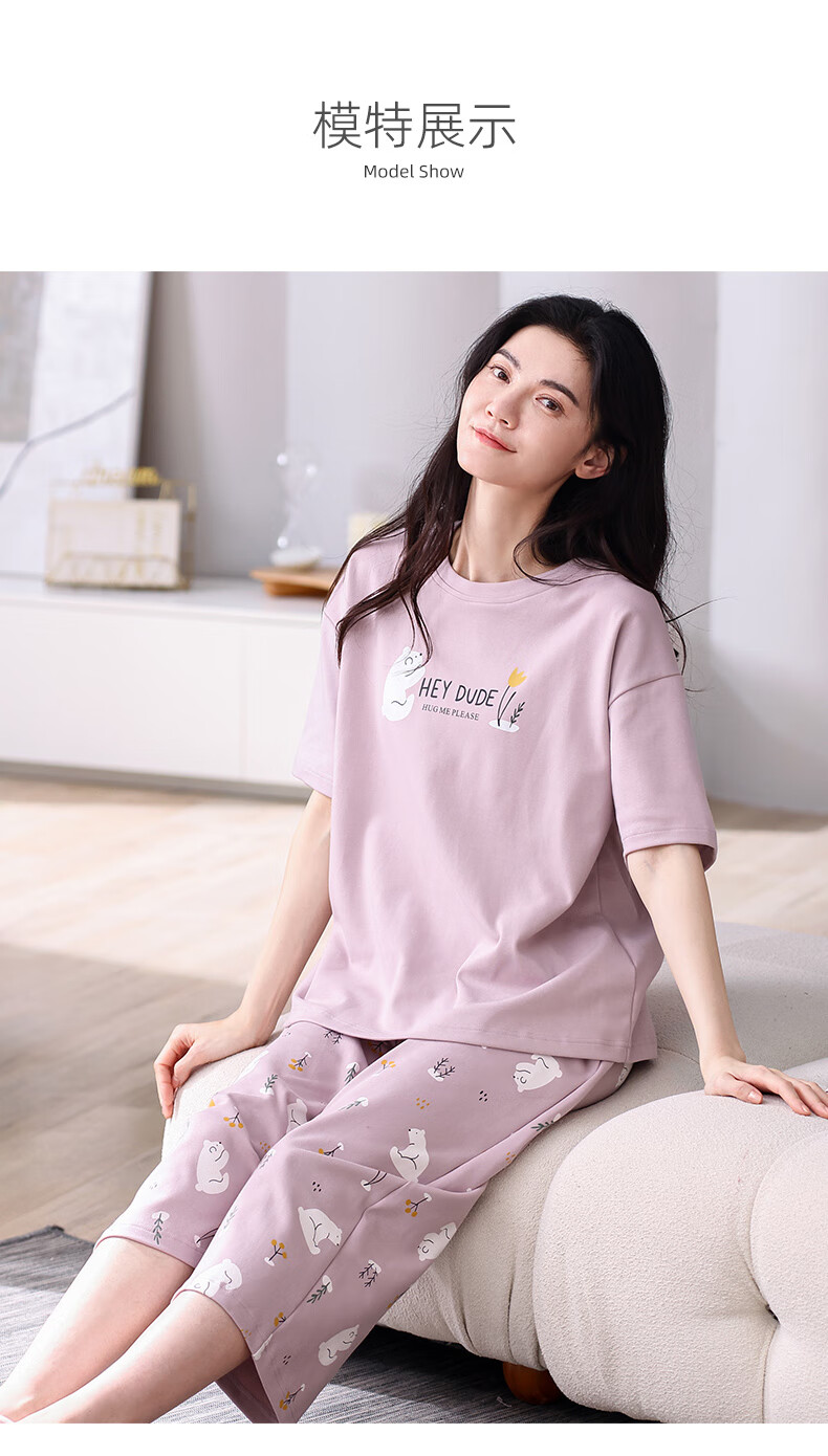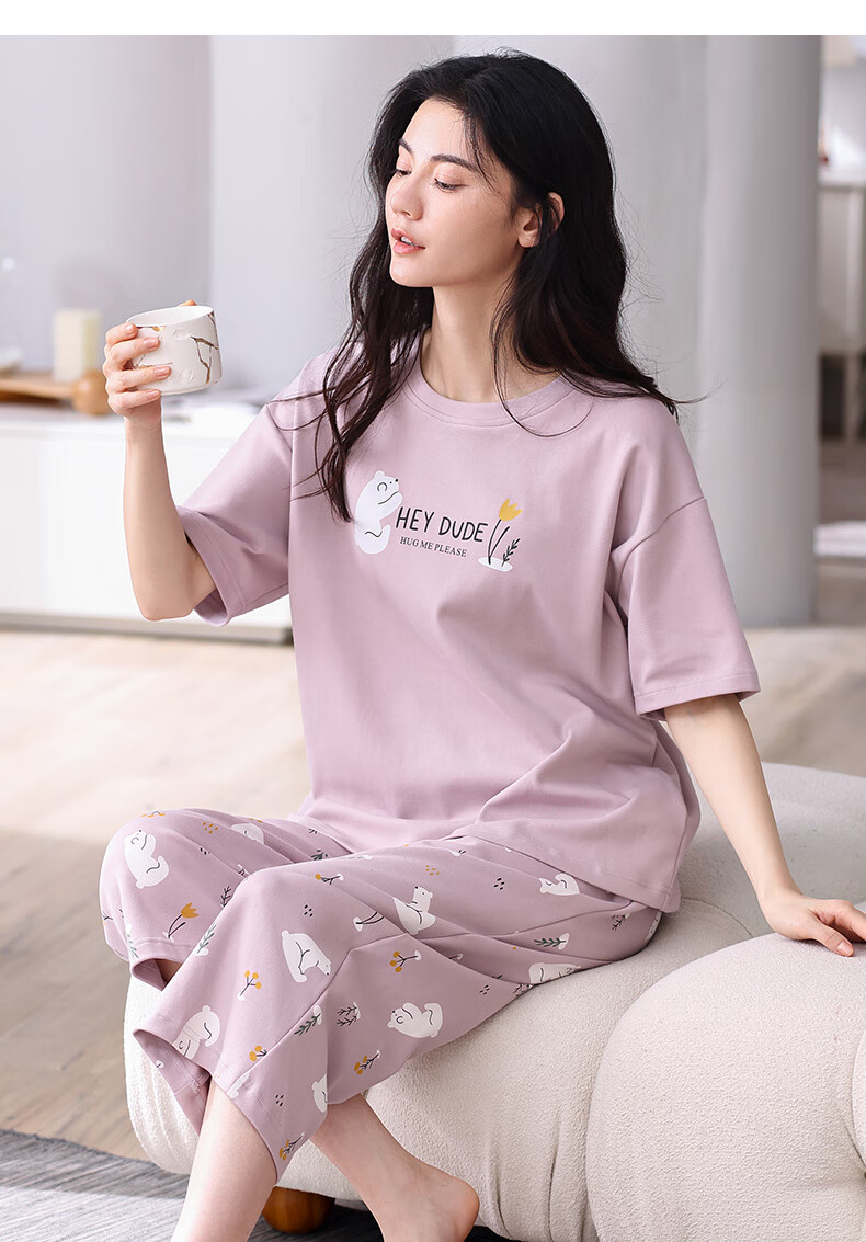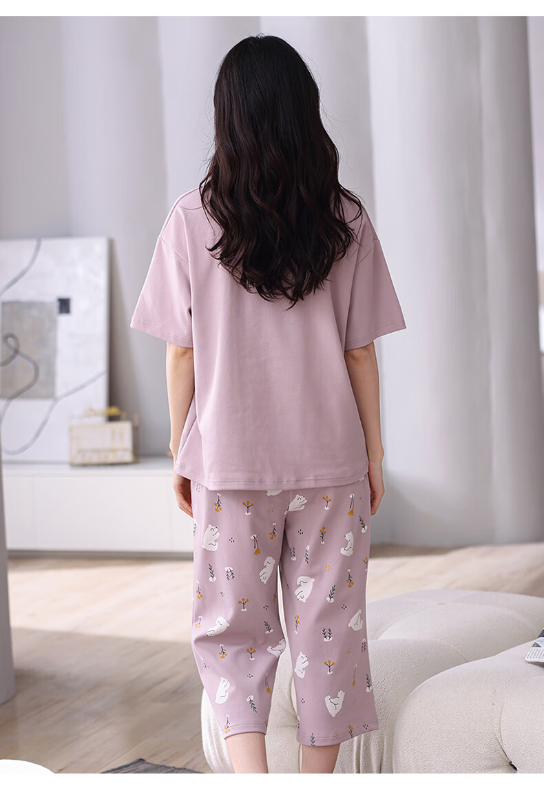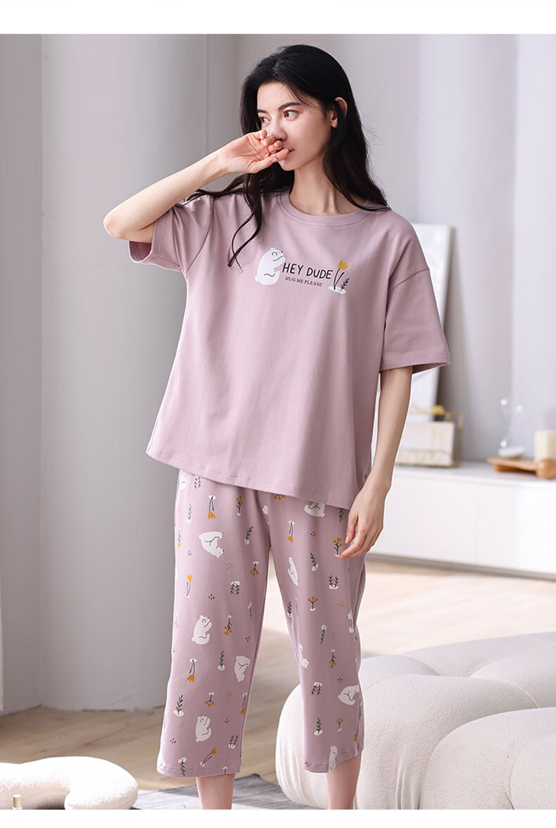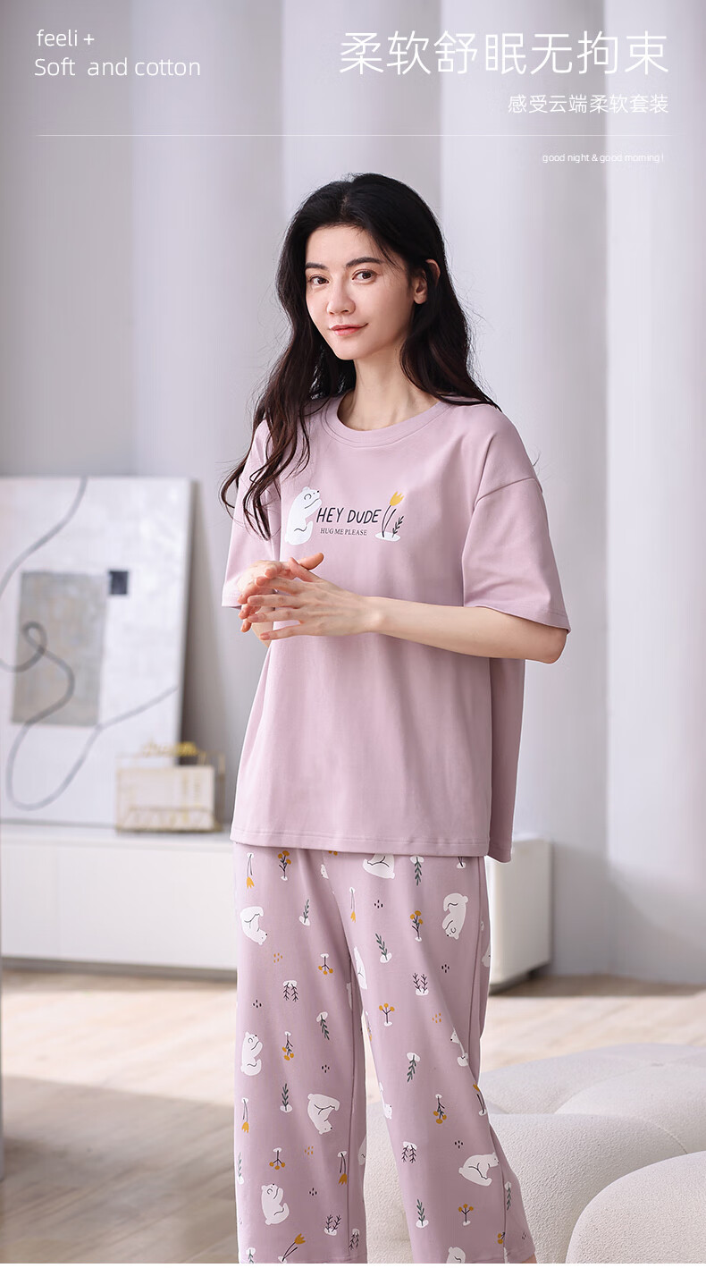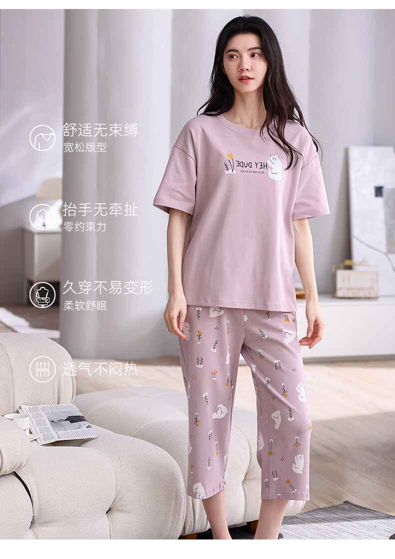 芬腾夏季纯棉睡衣女士薄款短袖七分裤休闲宽松夏天家居服套装 FX25920071粉红 L (建议110-125斤)
