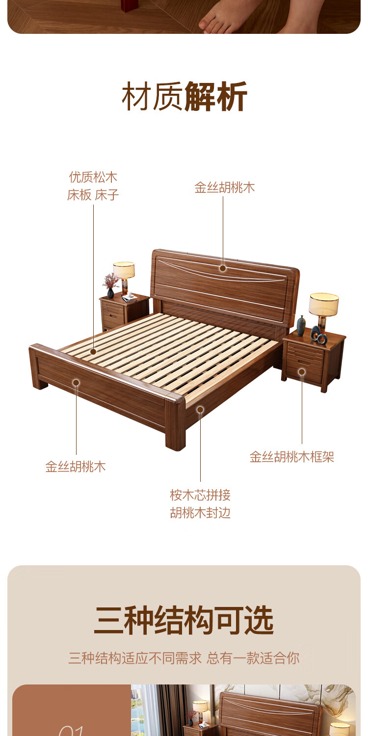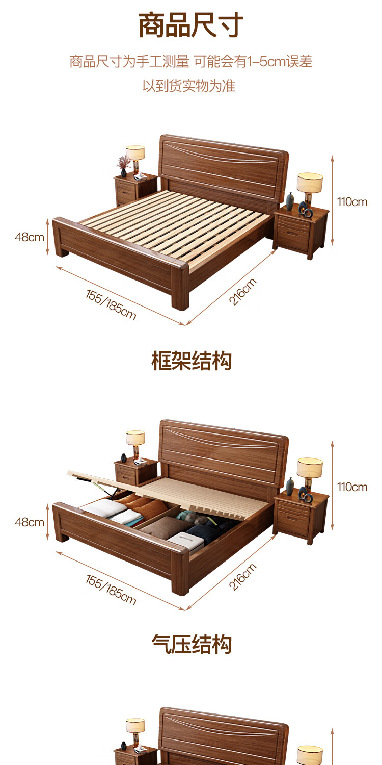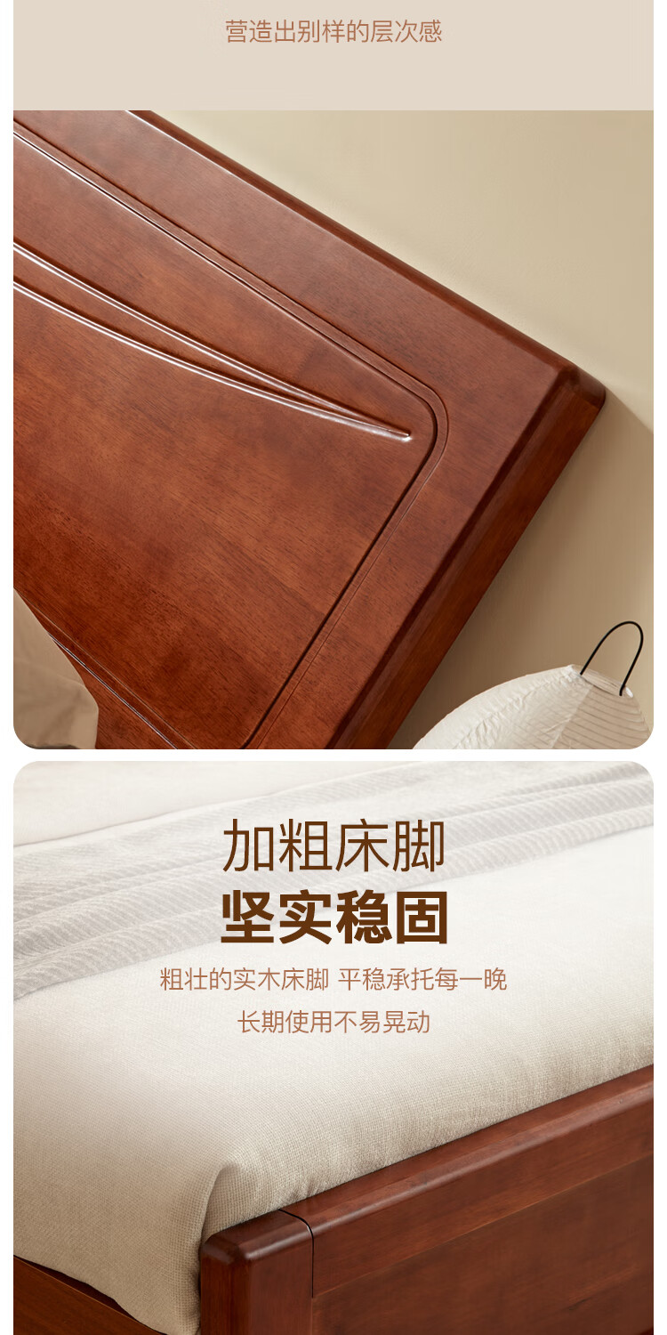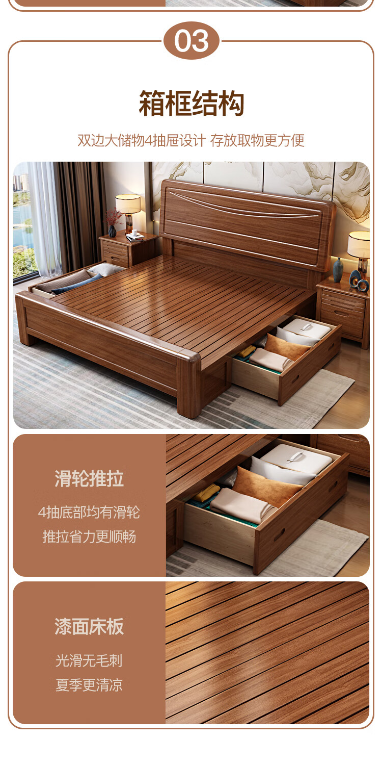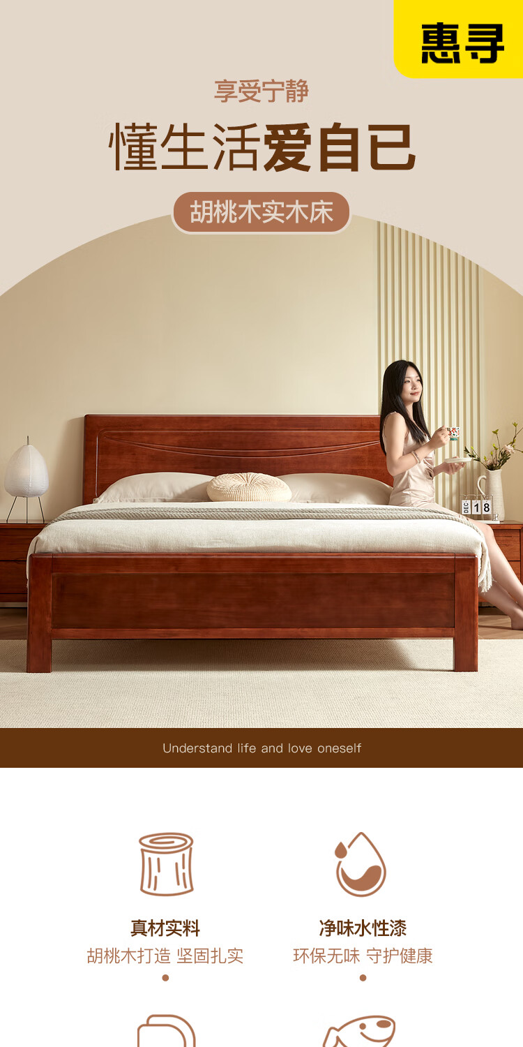 惠寻 京东自有品牌 全实木实木床中式1.5米床1.8米x2米双人床床家具 胡桃木单床 1500mm*2000mm框架结构