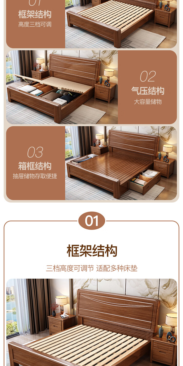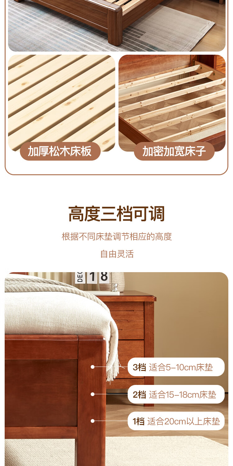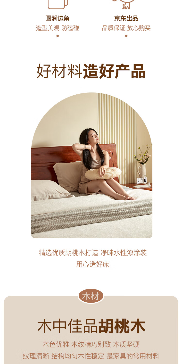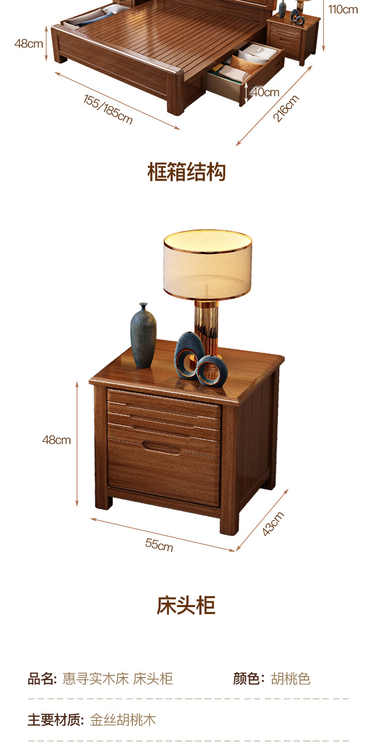 惠寻 京东自有品牌 全实木实木床中式1.5米床1.8米x2米双人床床家具 胡桃木单床 1500mm*2000mm框架结构