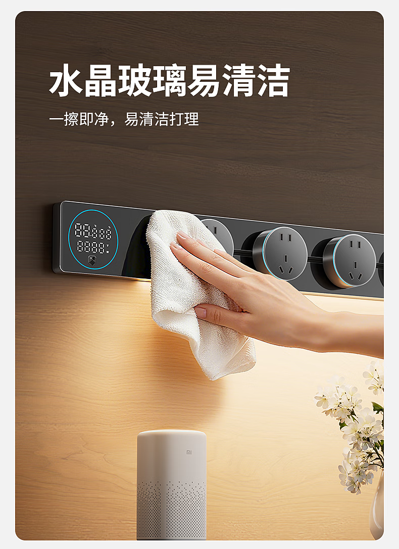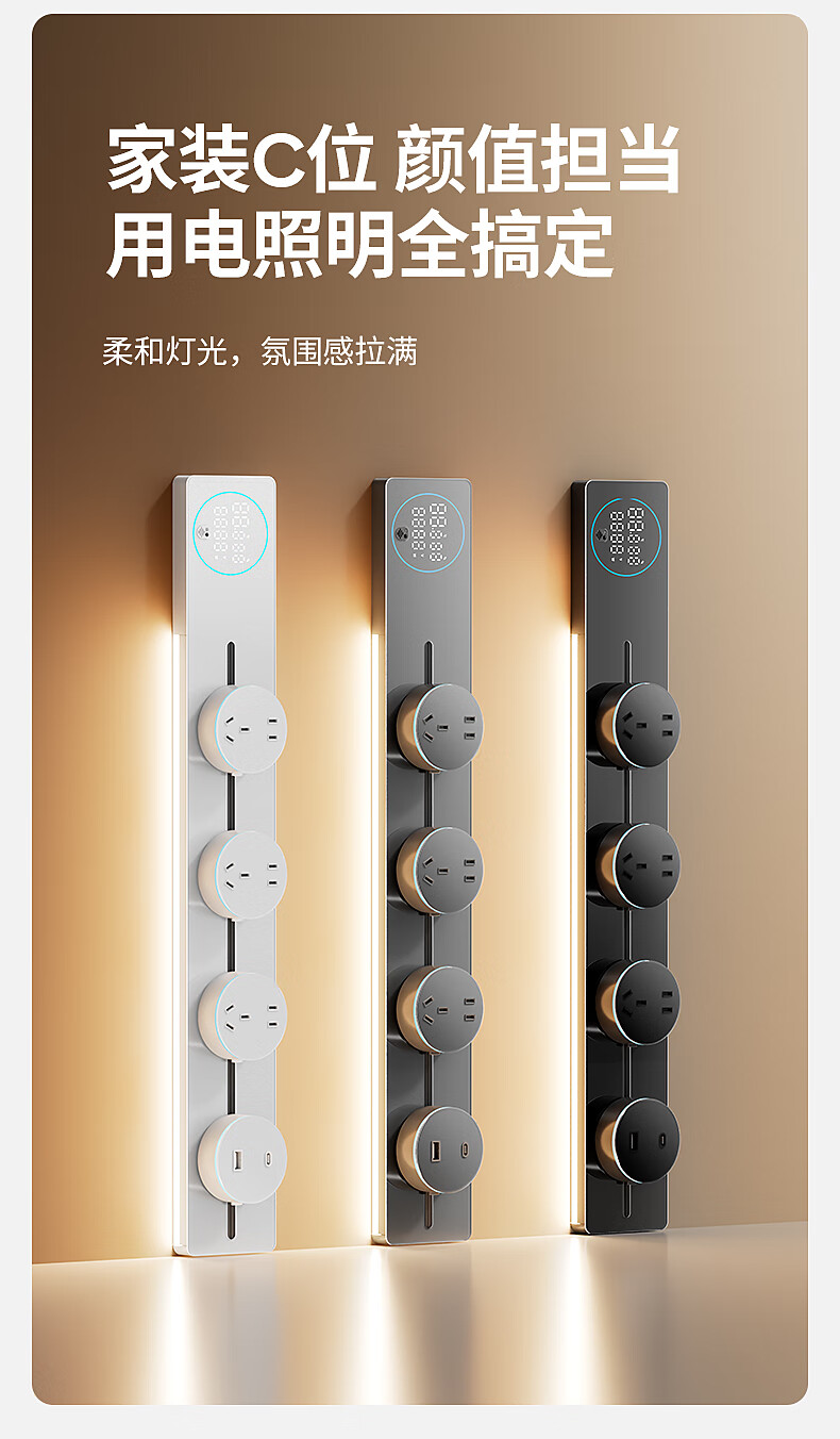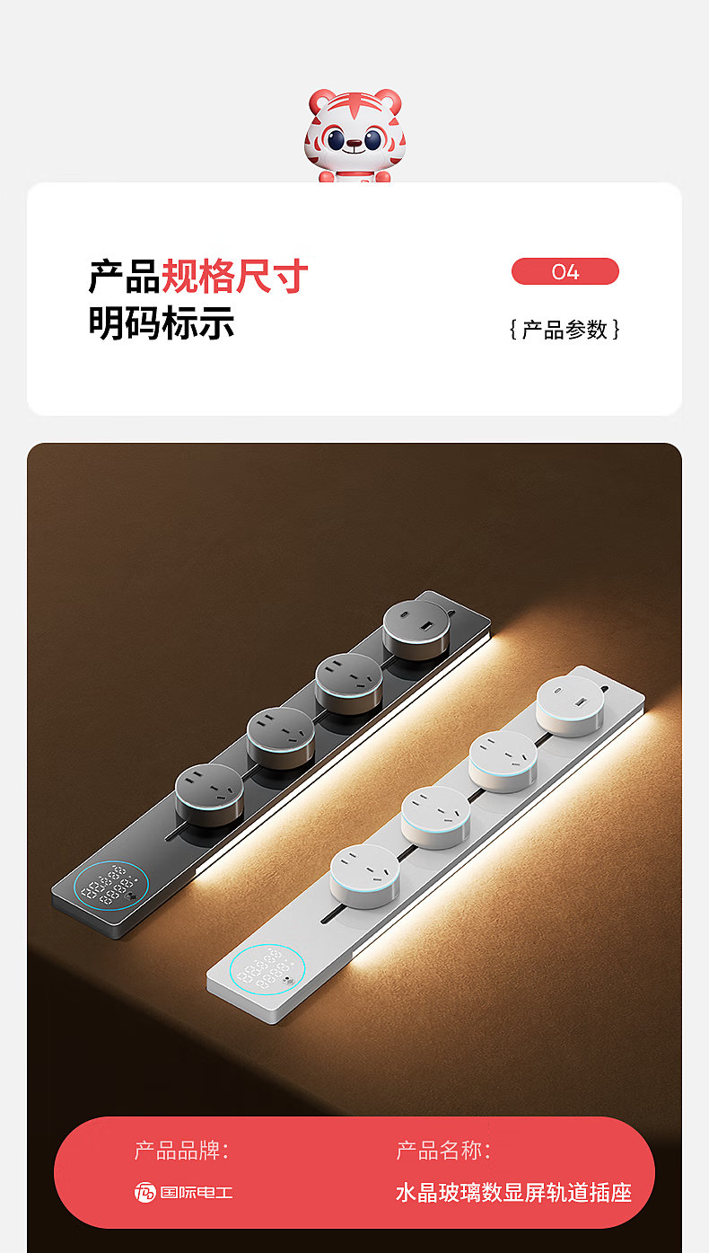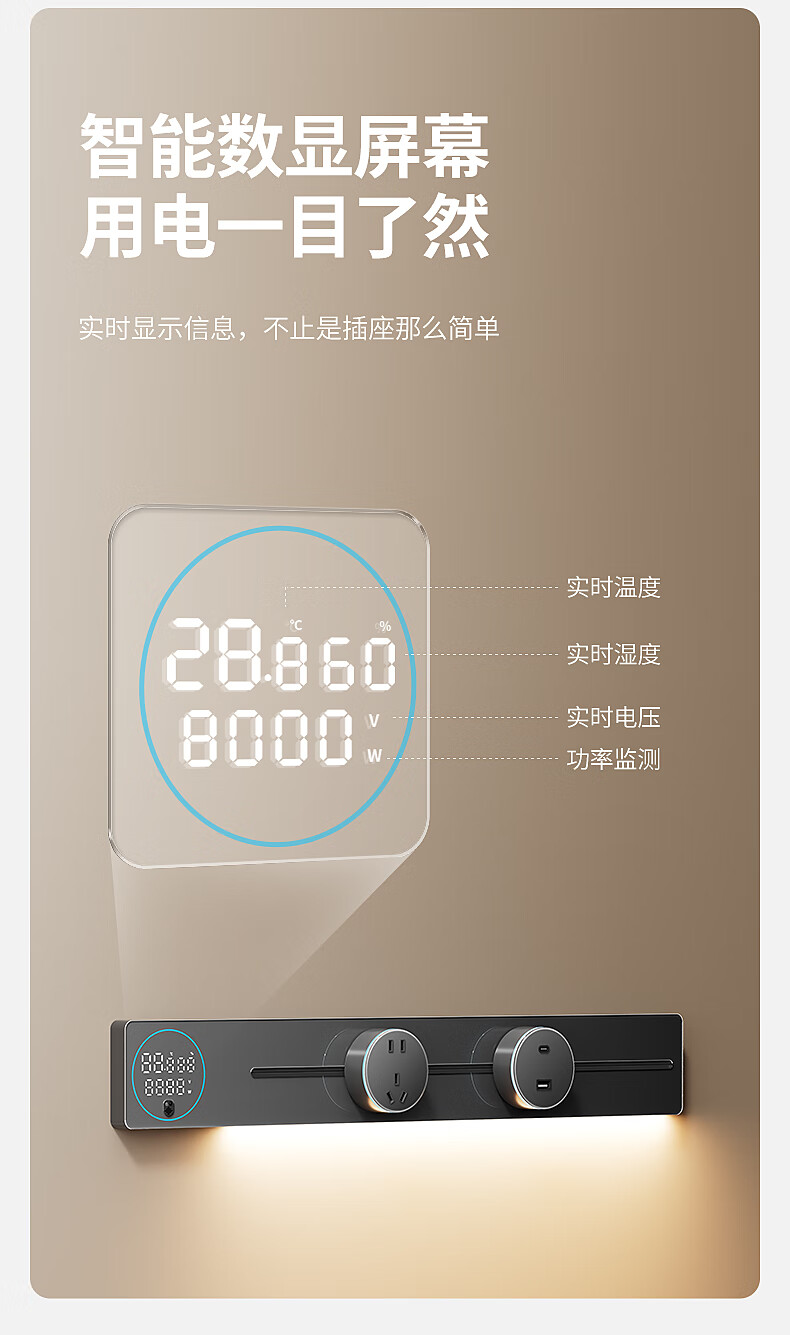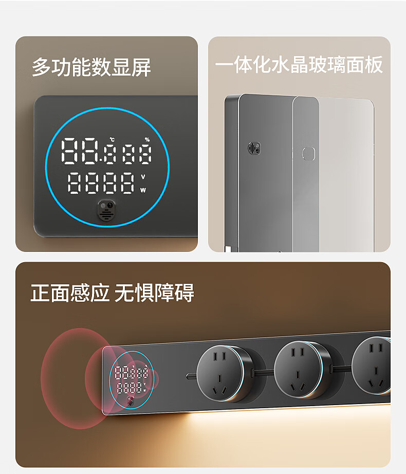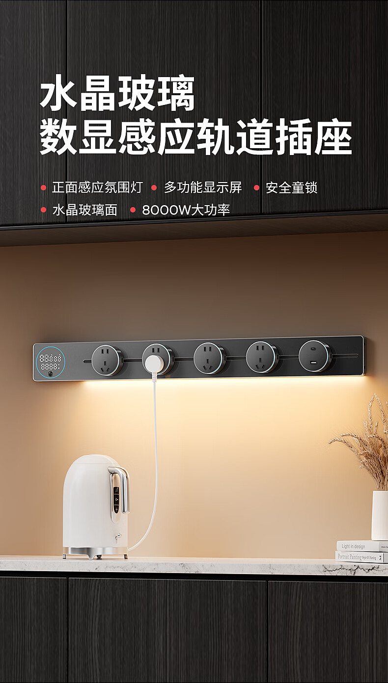 国际电工智能数显玻璃轨道插座感应灯可移动厨房餐边柜显示屏电力滑动插排 【智能数显屏】灰色80cm感应灯轨道+5个大五孔