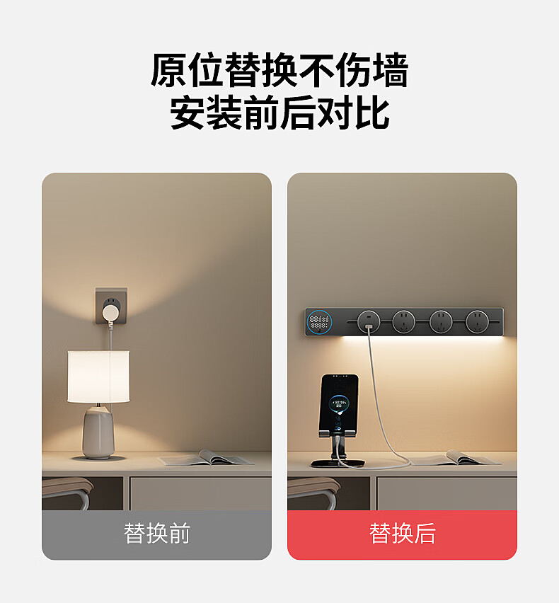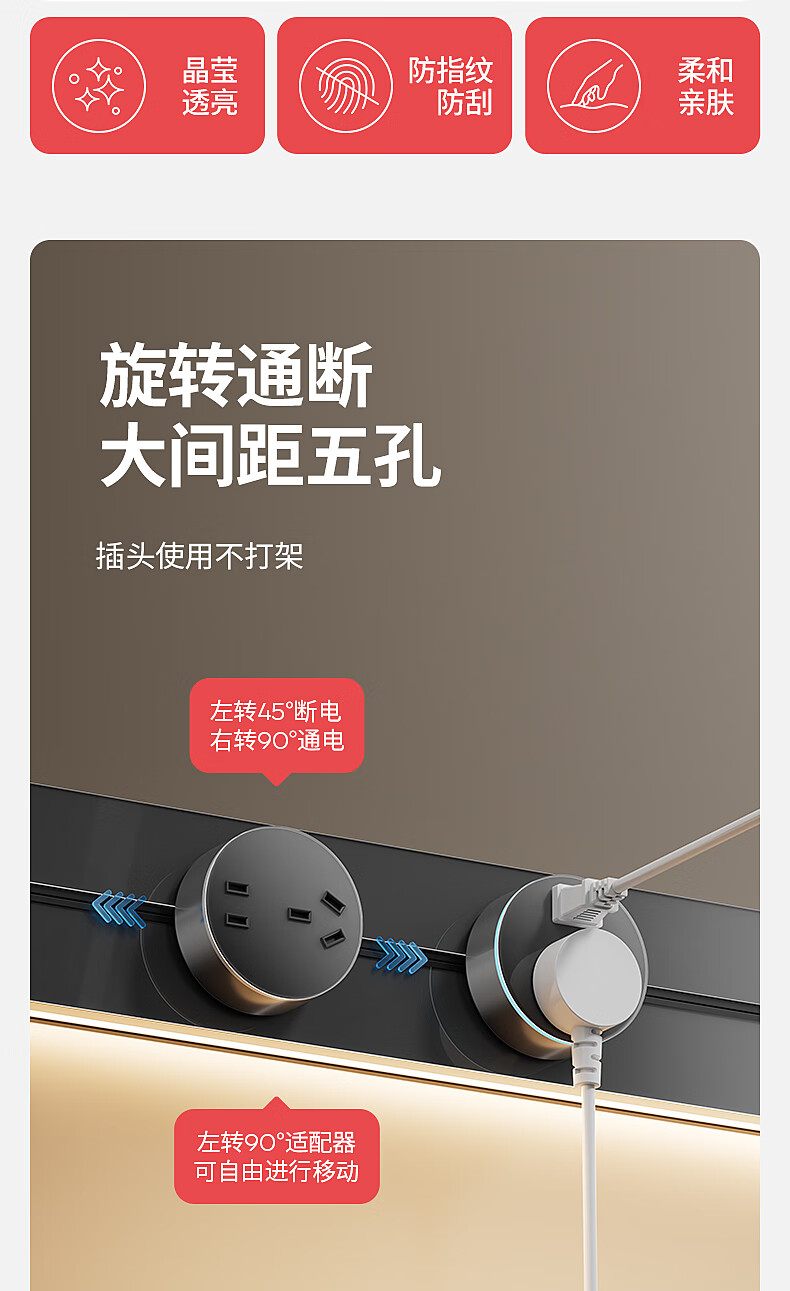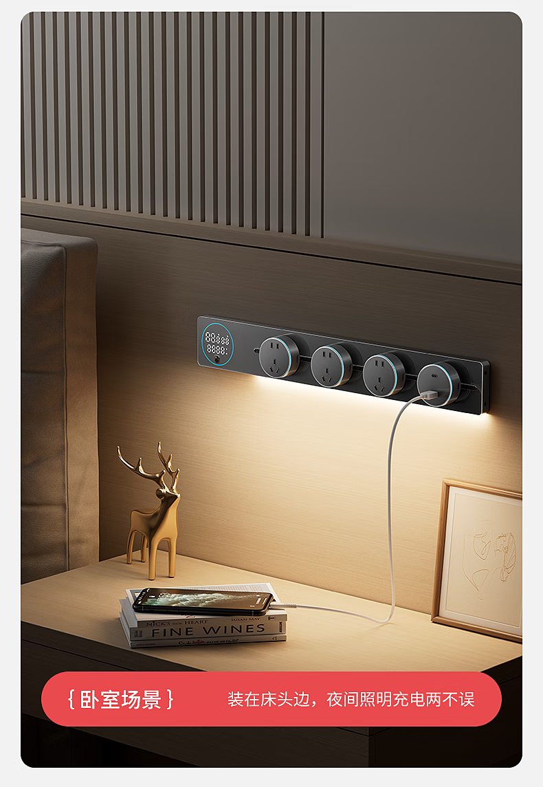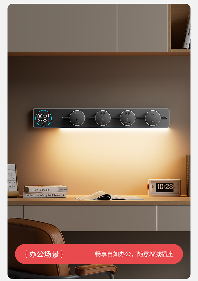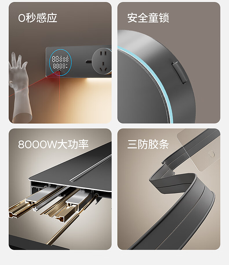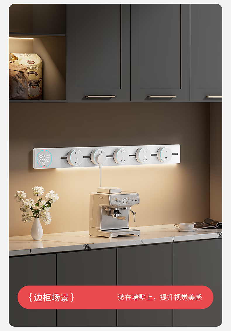 国际电工智能数显玻璃轨道插座感应灯可移动厨房餐边柜显示屏电力滑动插排 【智能数显屏】灰色80cm感应灯轨道+5个大五孔