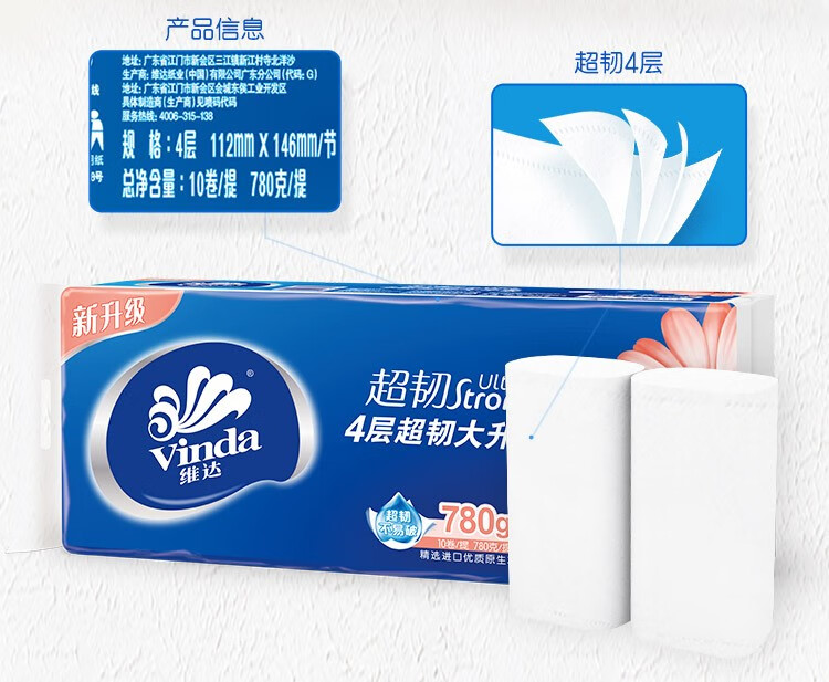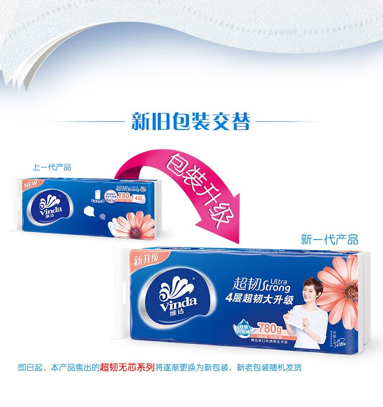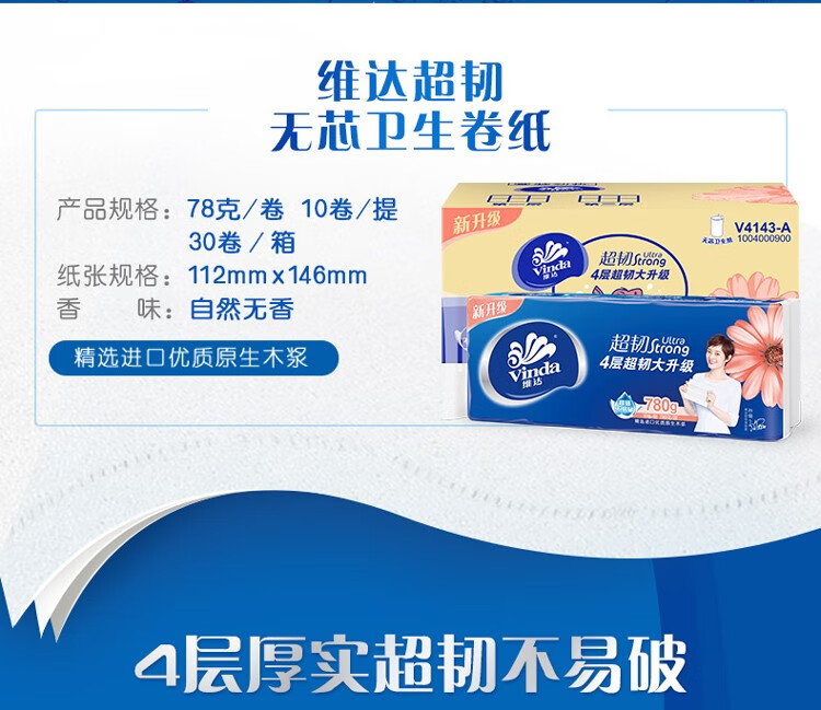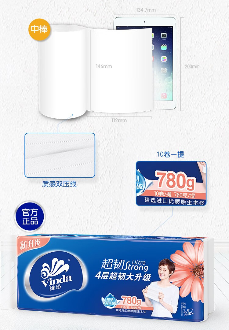 维达(Vinda)超韧无芯卷纸家用卷筒卫生纸巾手纸厕纸提装 4层 78g/卷*10卷 超韧