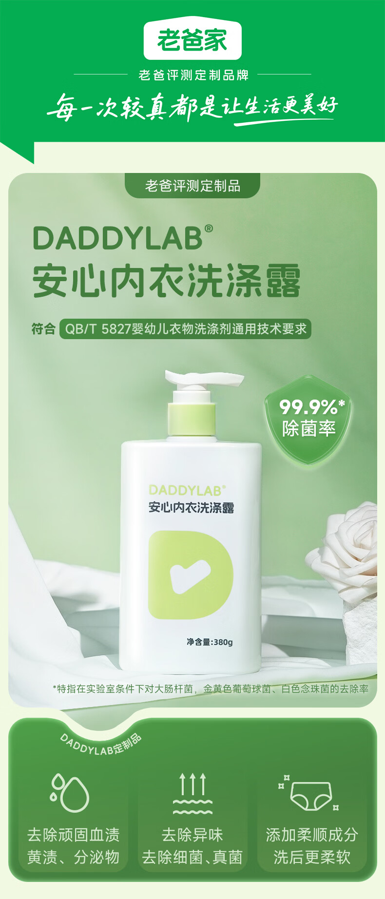 老爸评测内衣裤专用洗衣液清洁剂除菌去血渍温和去污洗涤剂 正装380g*1瓶