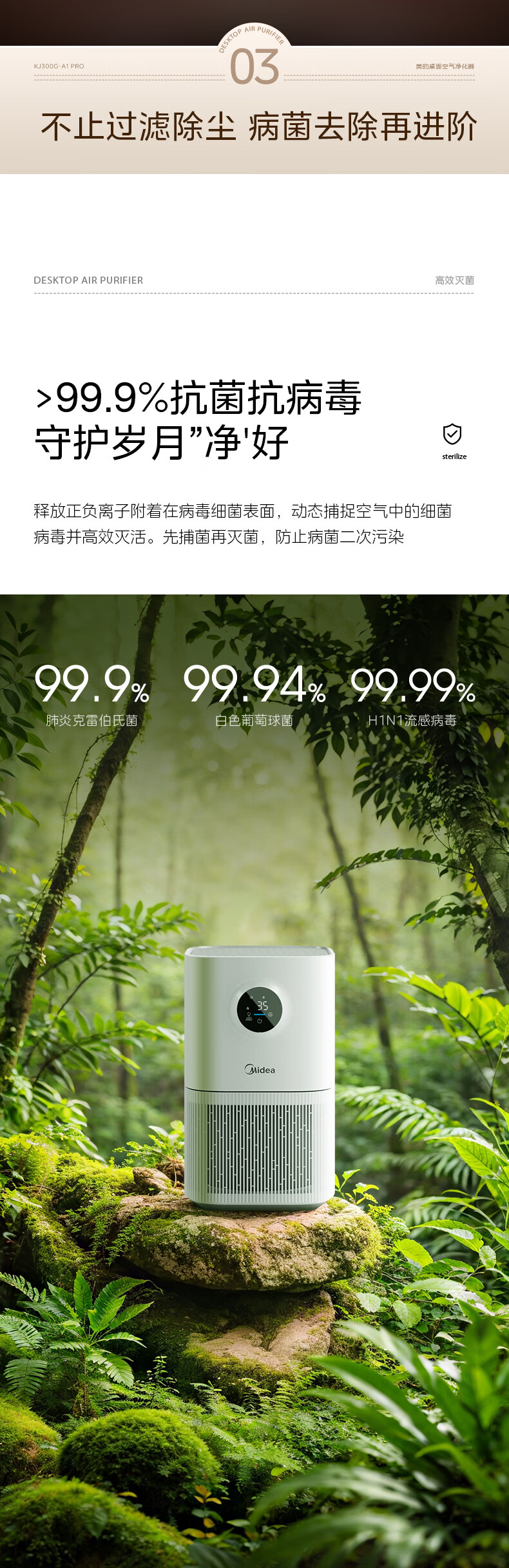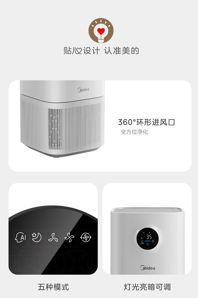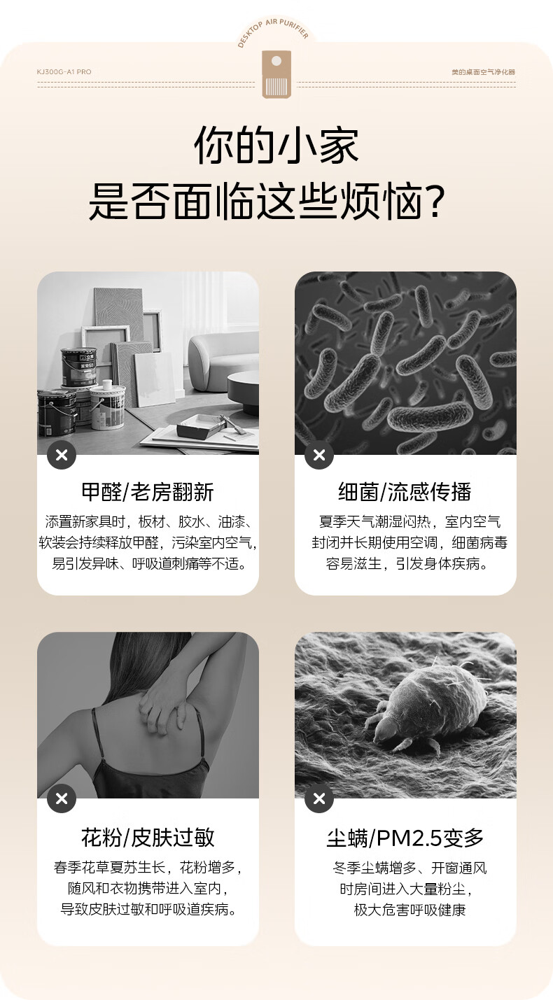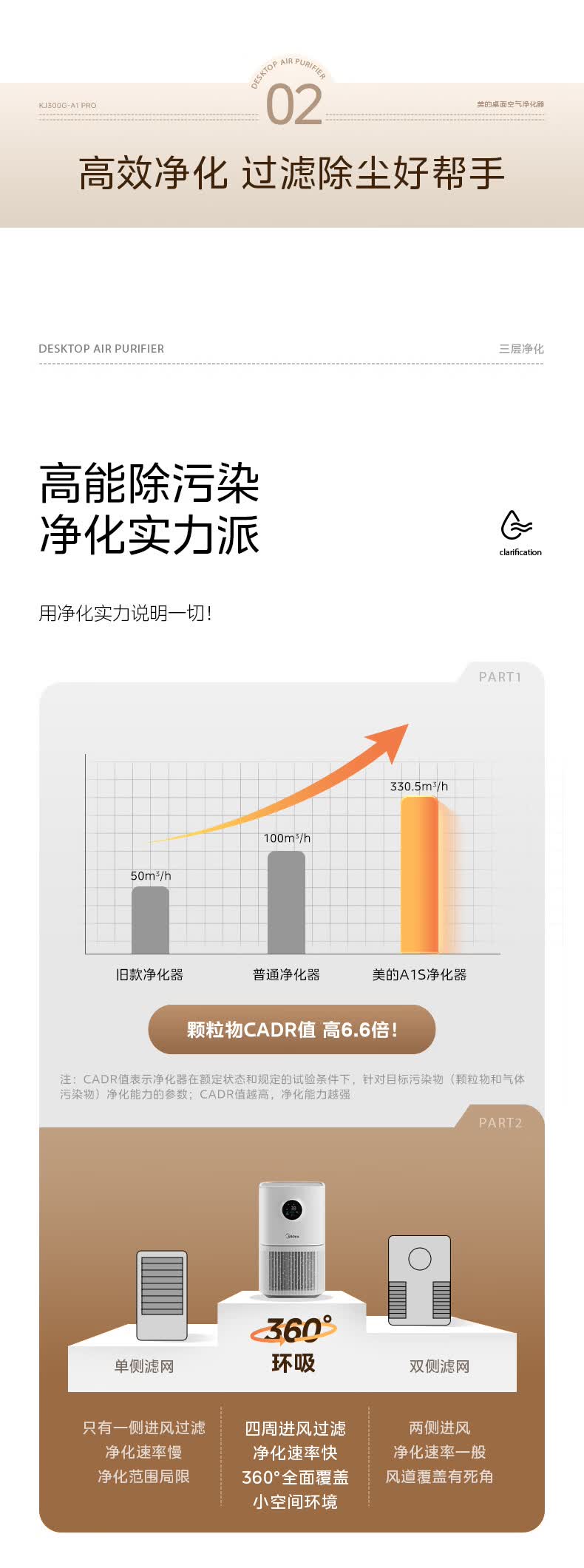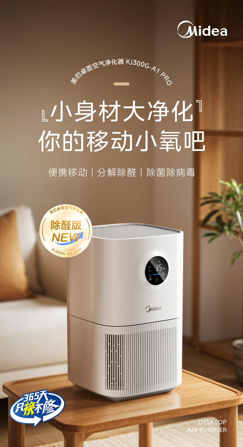 美的(Midea)桌面空气净化器A1Pro除甲醛除敏除烟味异味过敏源 除尘除菌 A1S升级款家用小户型KJ300G-A1 Pro