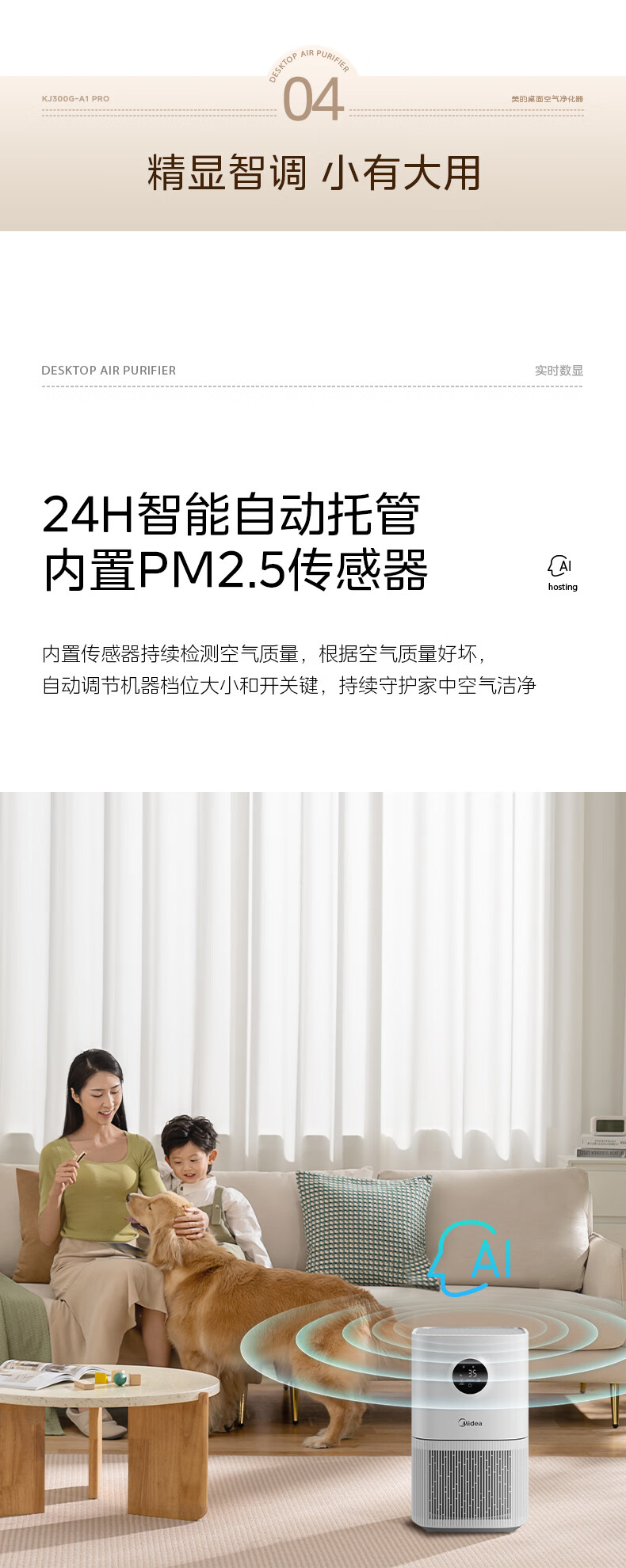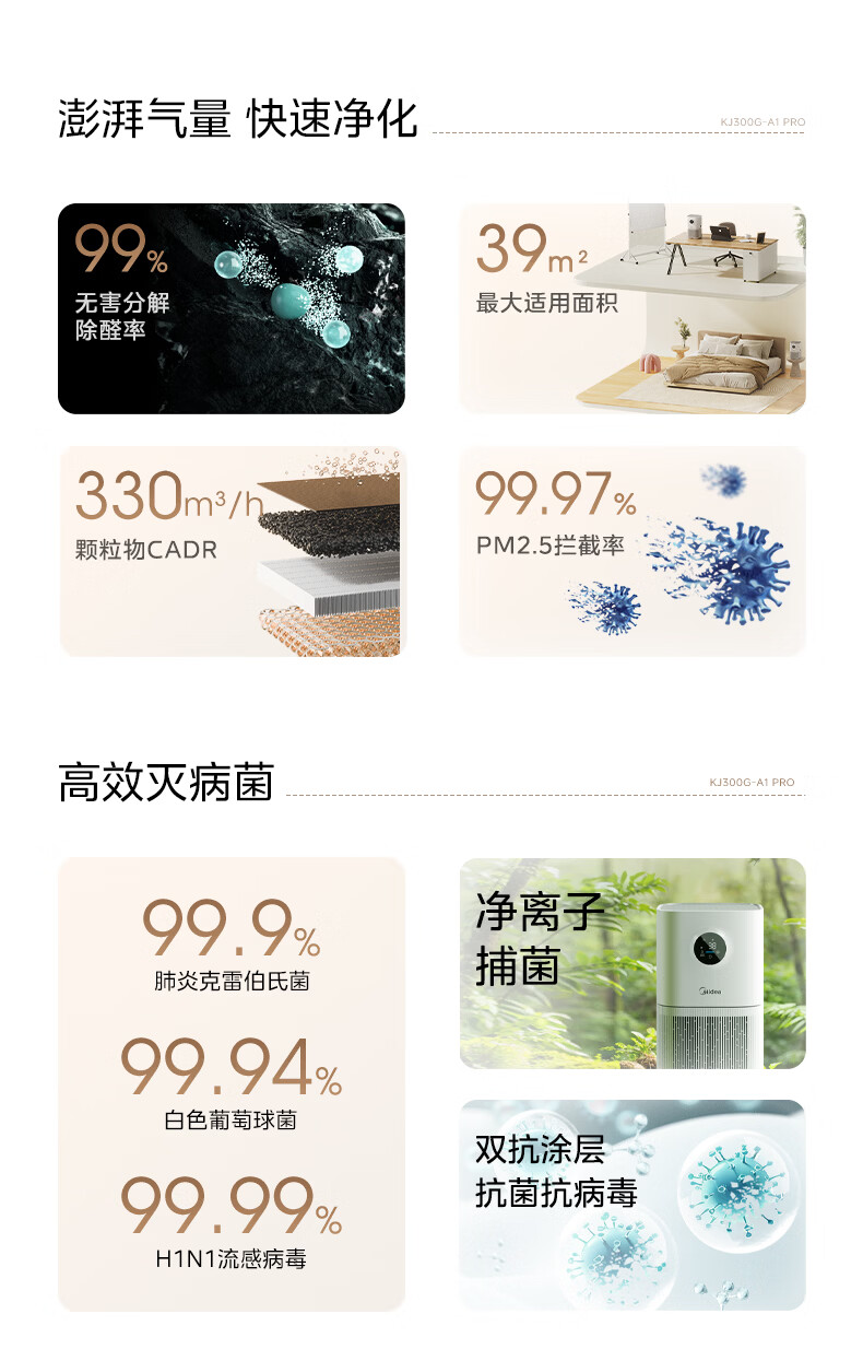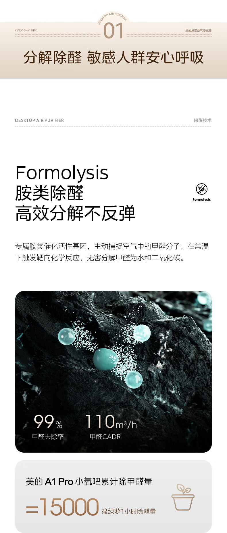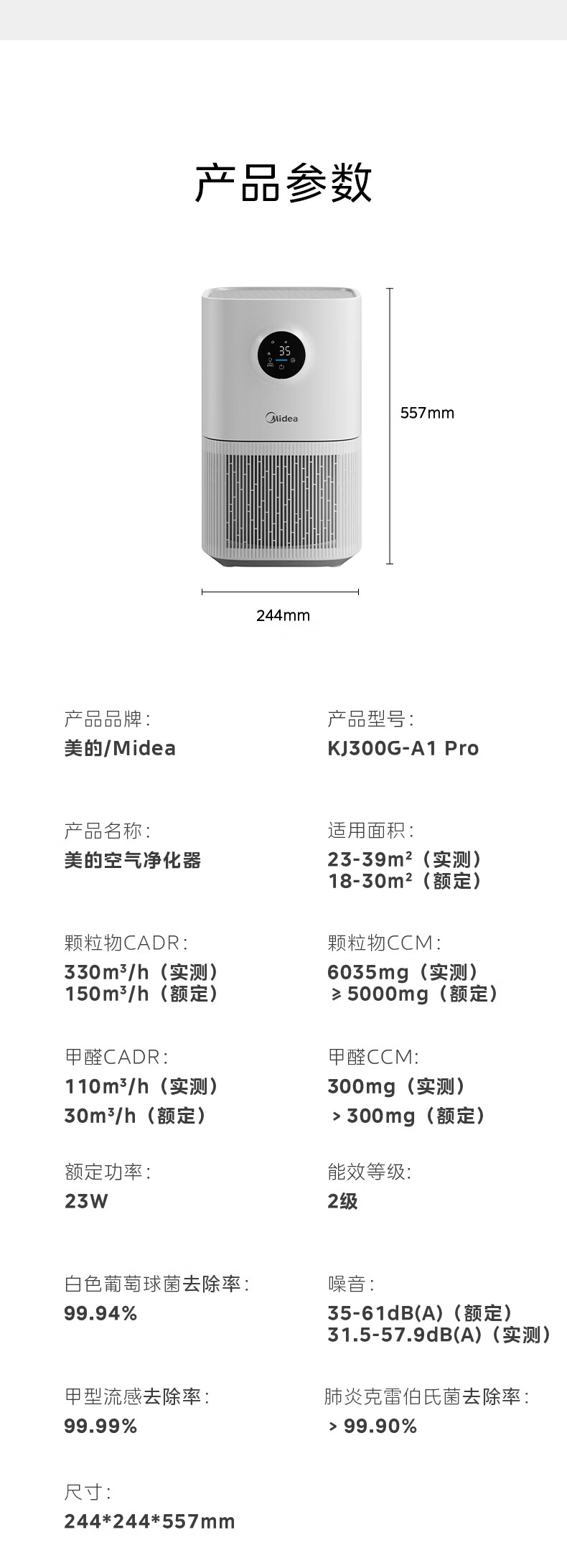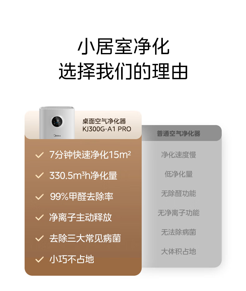 美的(Midea)桌面空气净化器A1Pro除甲醛除敏除烟味异味过敏源 除尘除菌 A1S升级款家用小户型KJ300G-A1 Pro