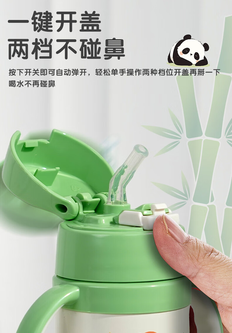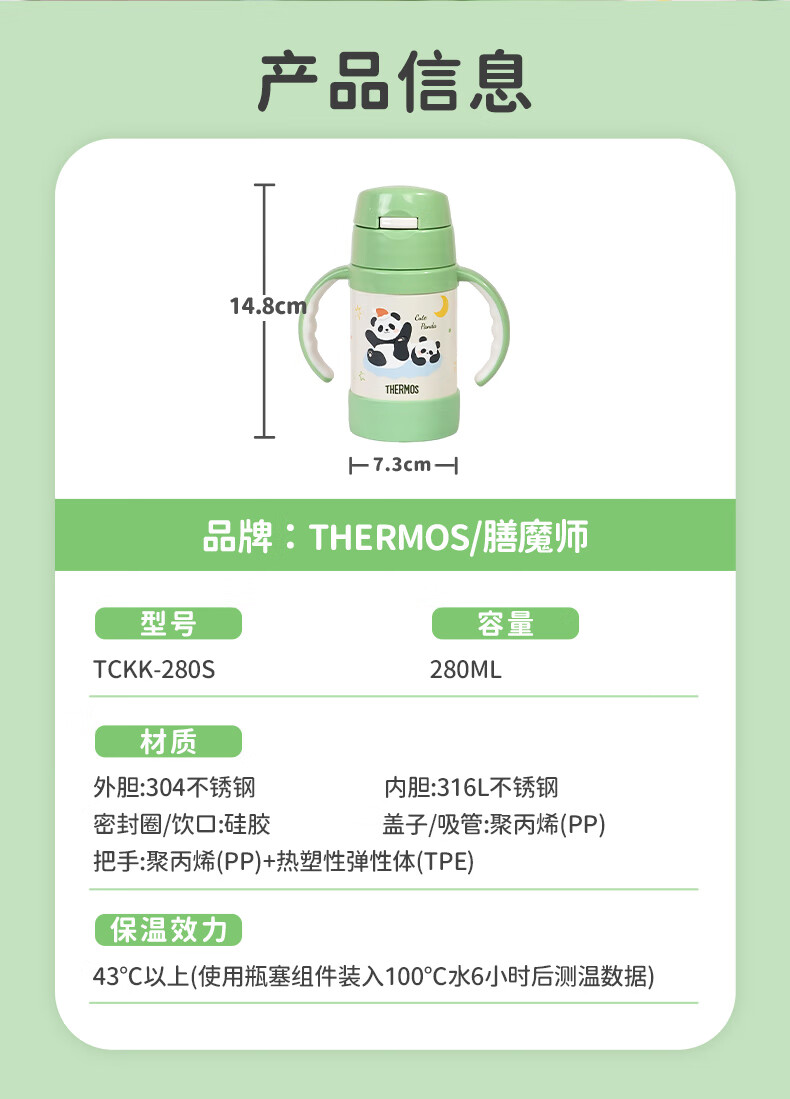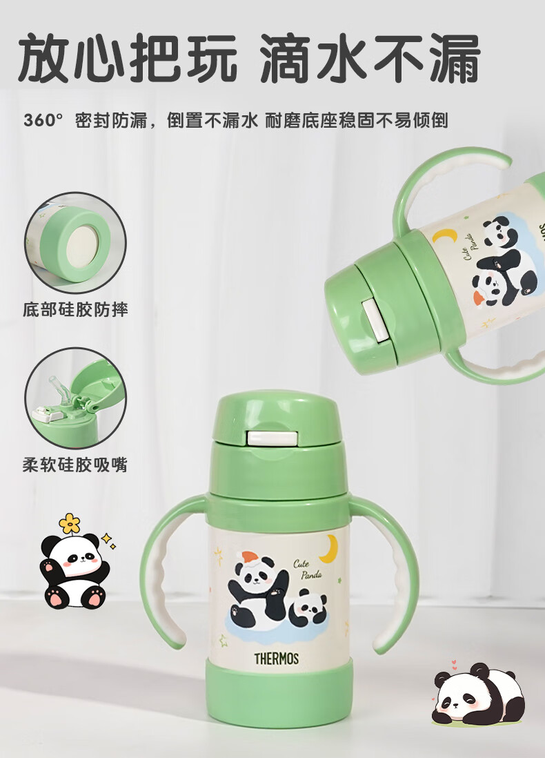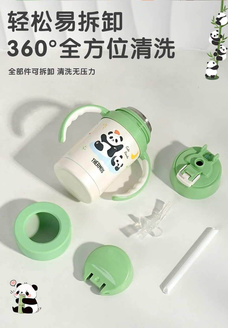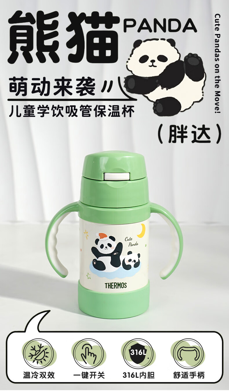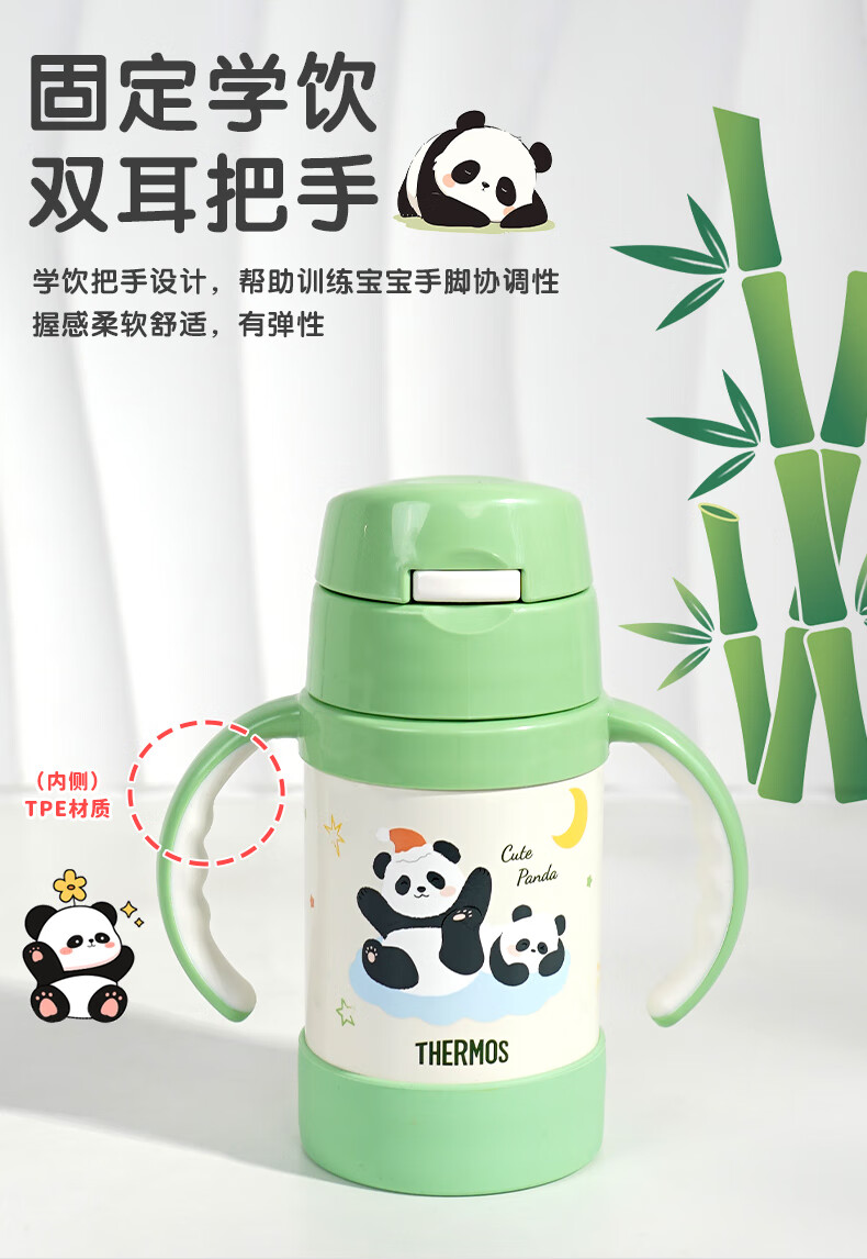 膳魔师儿童水杯316L保温杯带把手婴儿水杯宝宝吸管杯幼儿园学生水杯TCKK 熊猫保温杯280ml(含备用吸管)