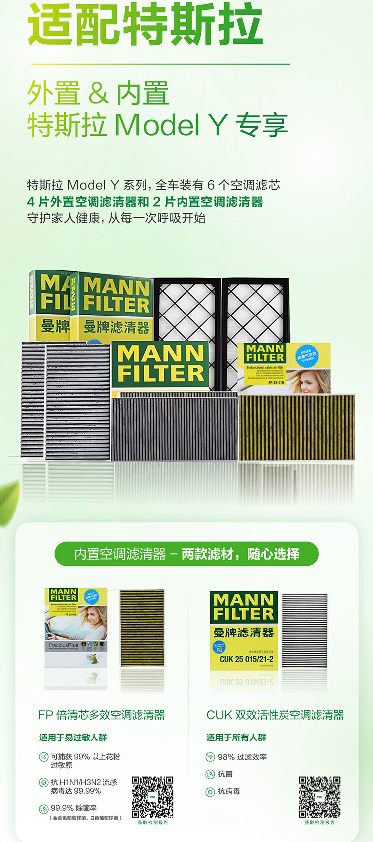 曼牌滤清器(MANNFILTER)空调滤清器空调滤芯内外置套装特斯拉毛豆MODEL Y 赠螺丝刀翘板*1