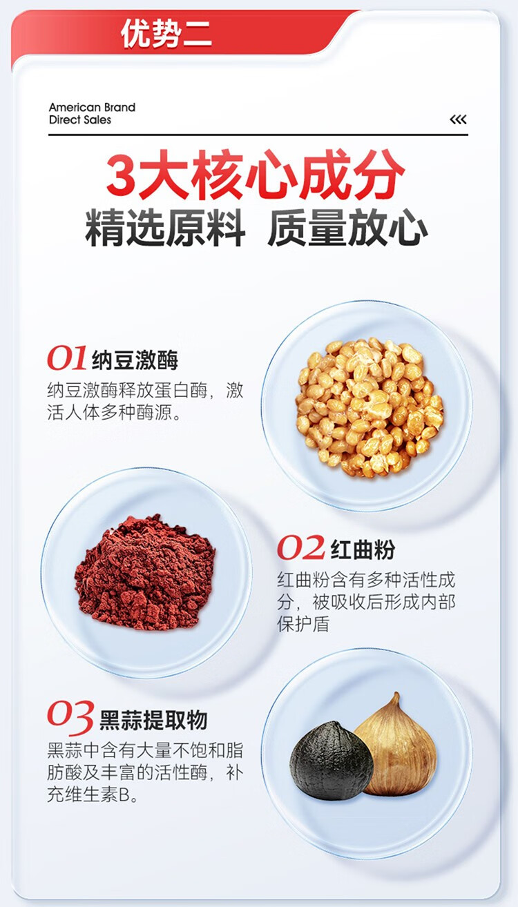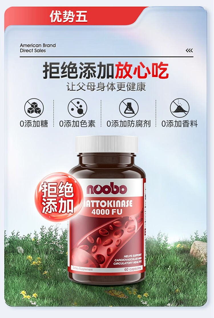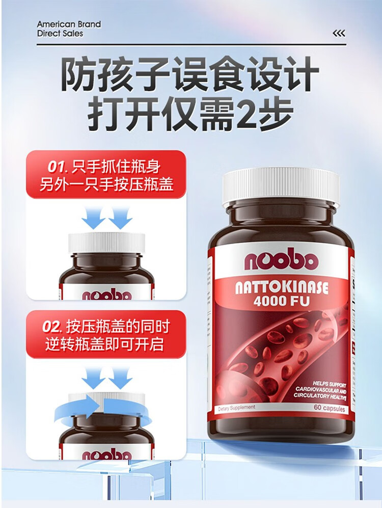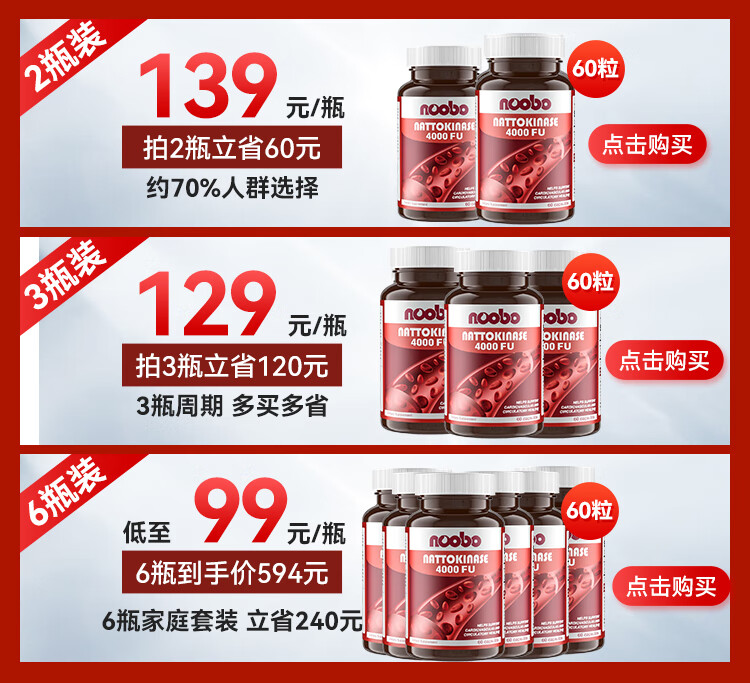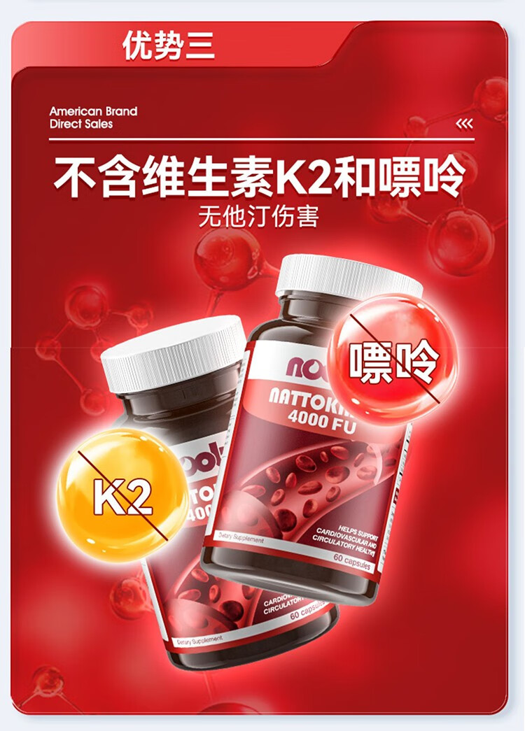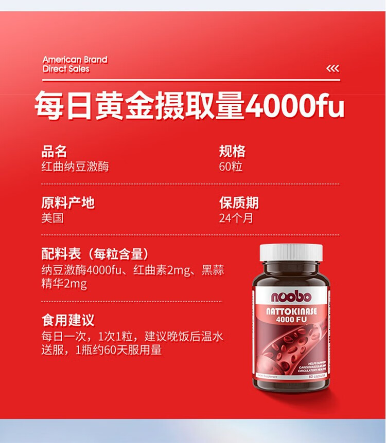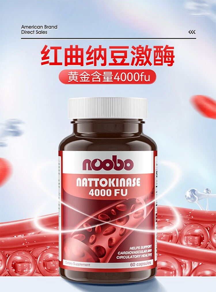 NOOBO美国原装进口红曲纳豆激酶胶囊4000FU溶软化疏通血管清道夫降血脂 纳豆激酶胶囊 60粒*2瓶 【阶段装】
