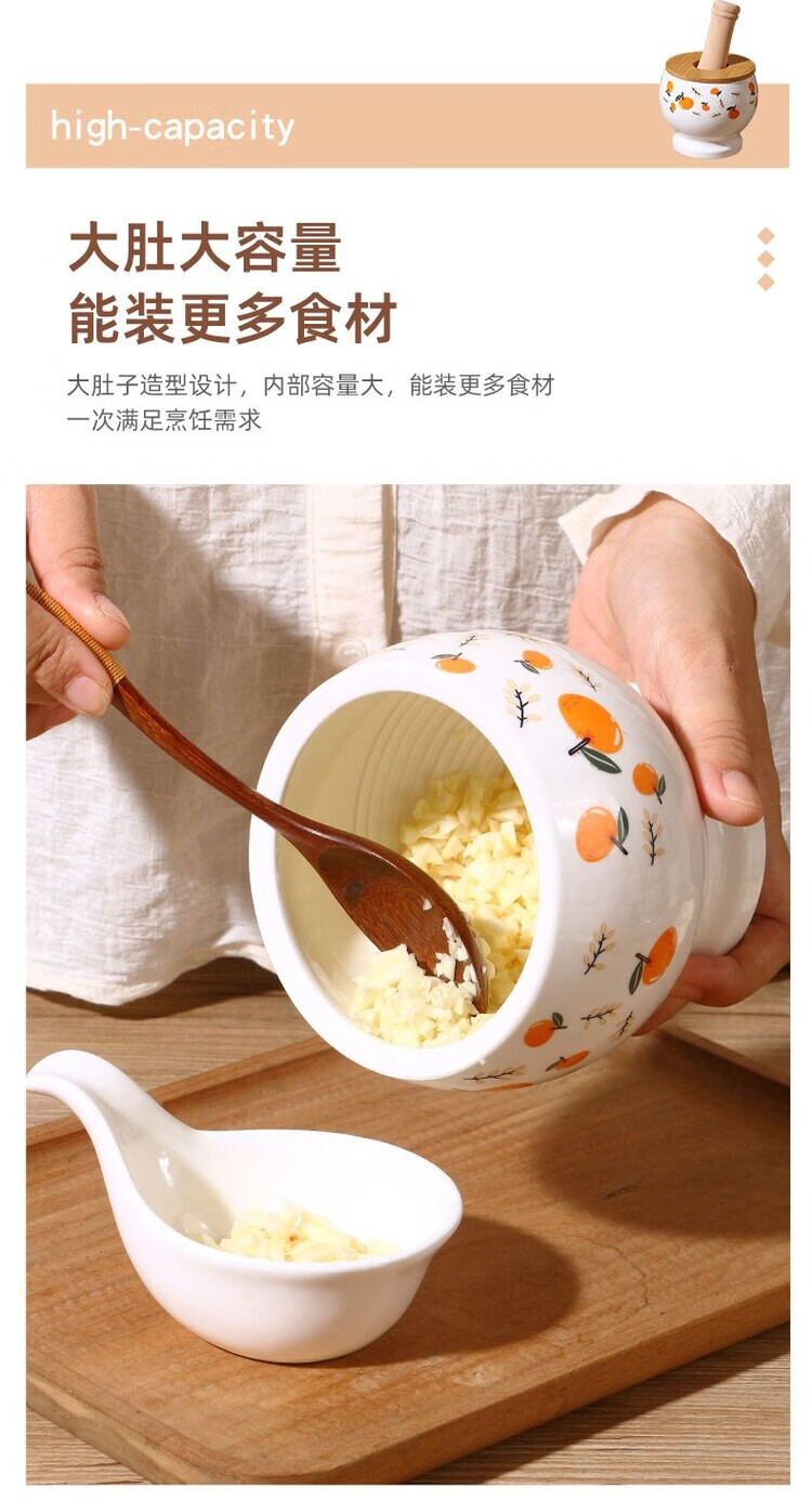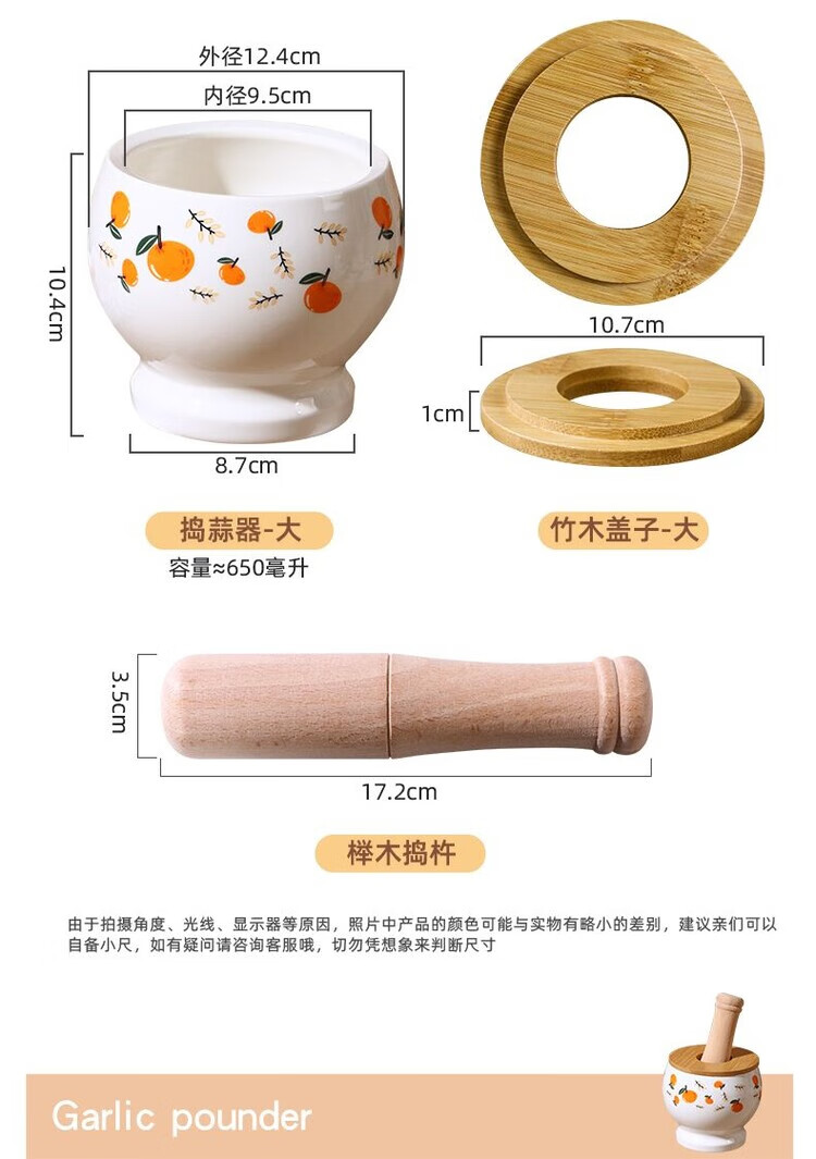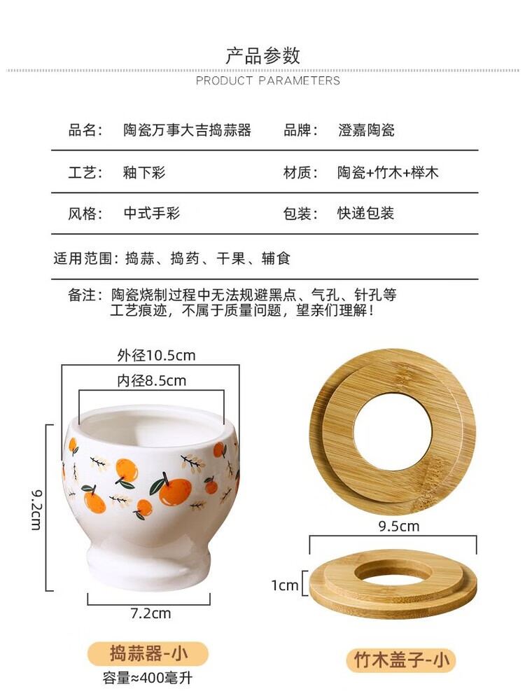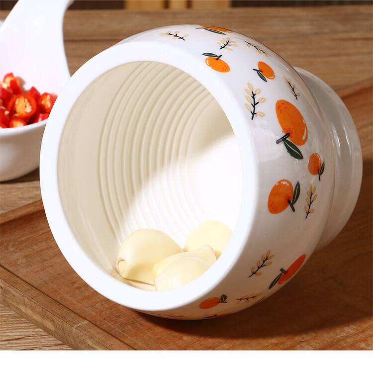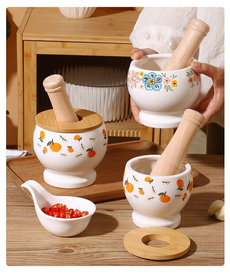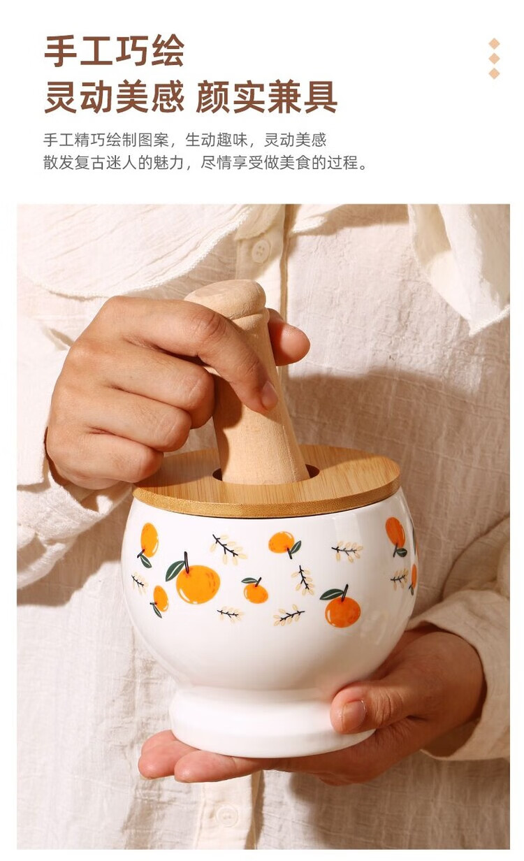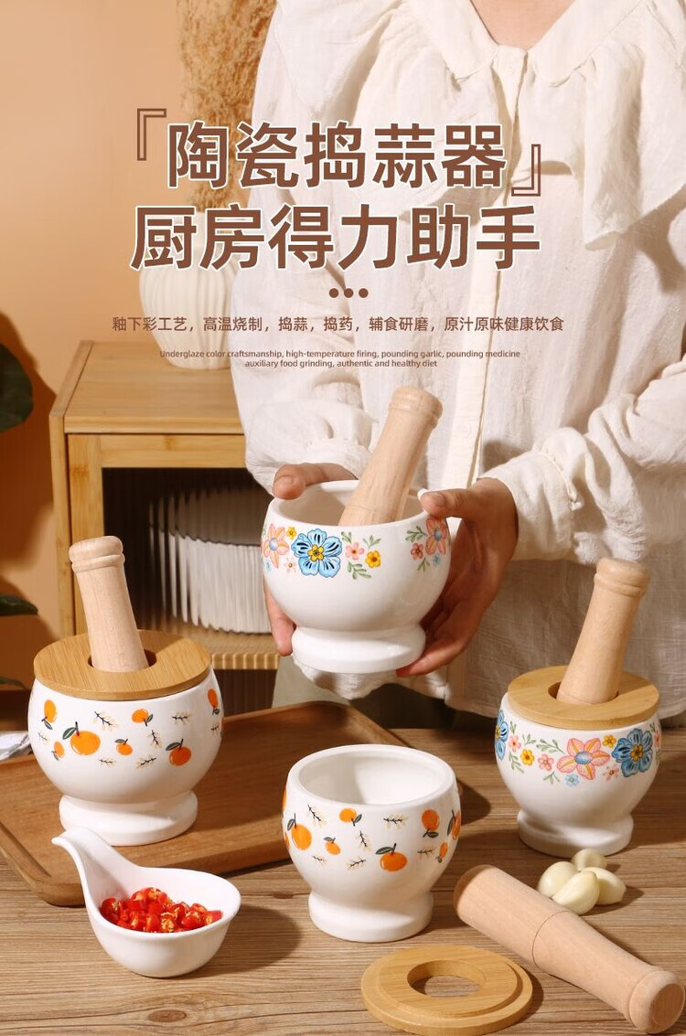 花沐禧捣蒜专用复古加厚蒜臼子手压式带盖捣碎器商用带盖螺纹研磨瓷罐子 繁花【捣蒜器大-650ml】+榉木棒+竹盖子