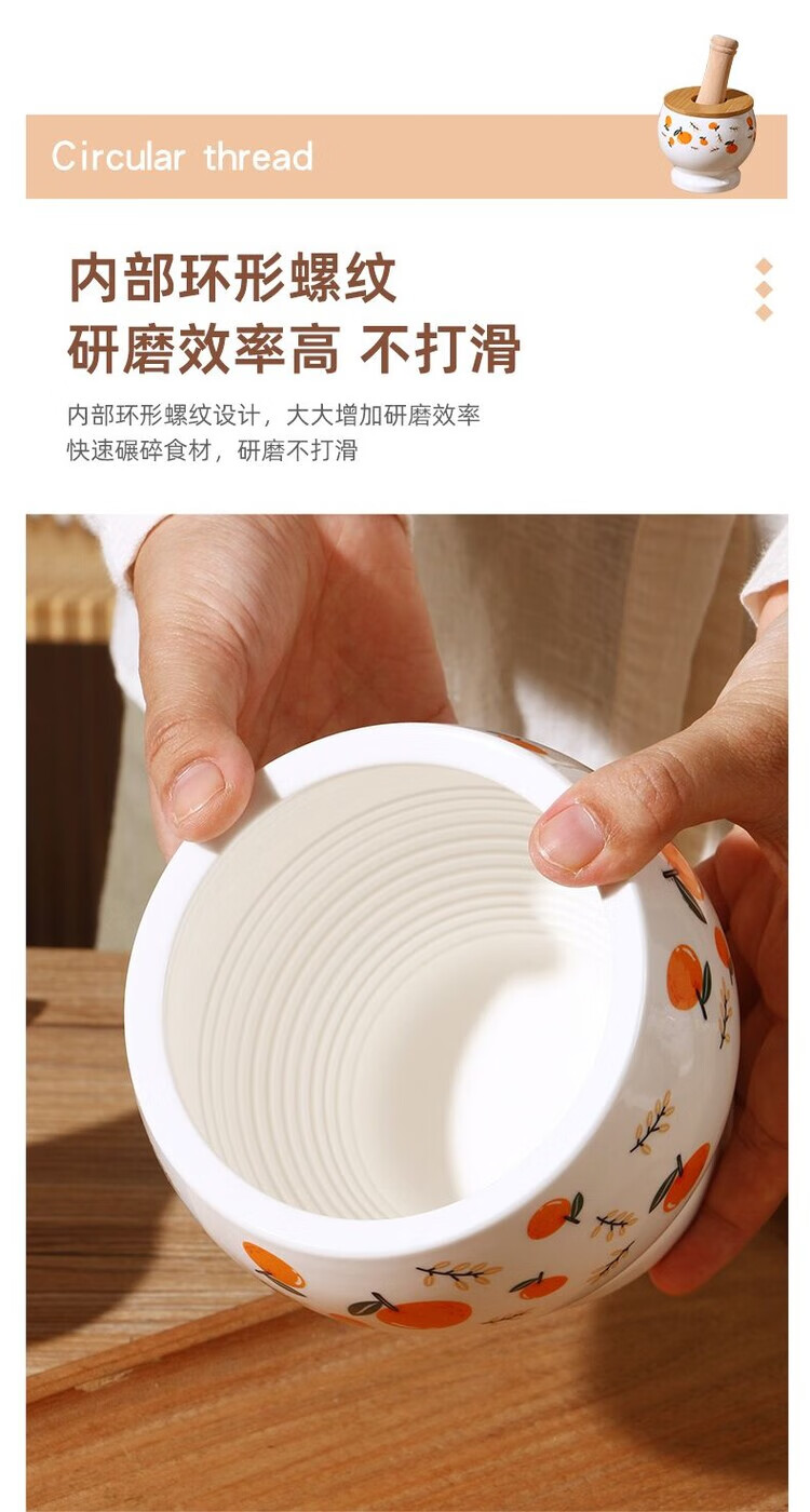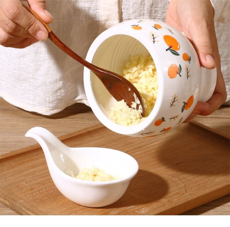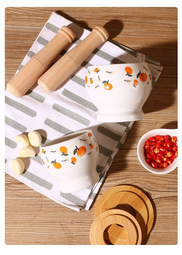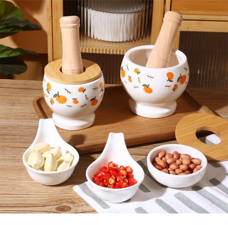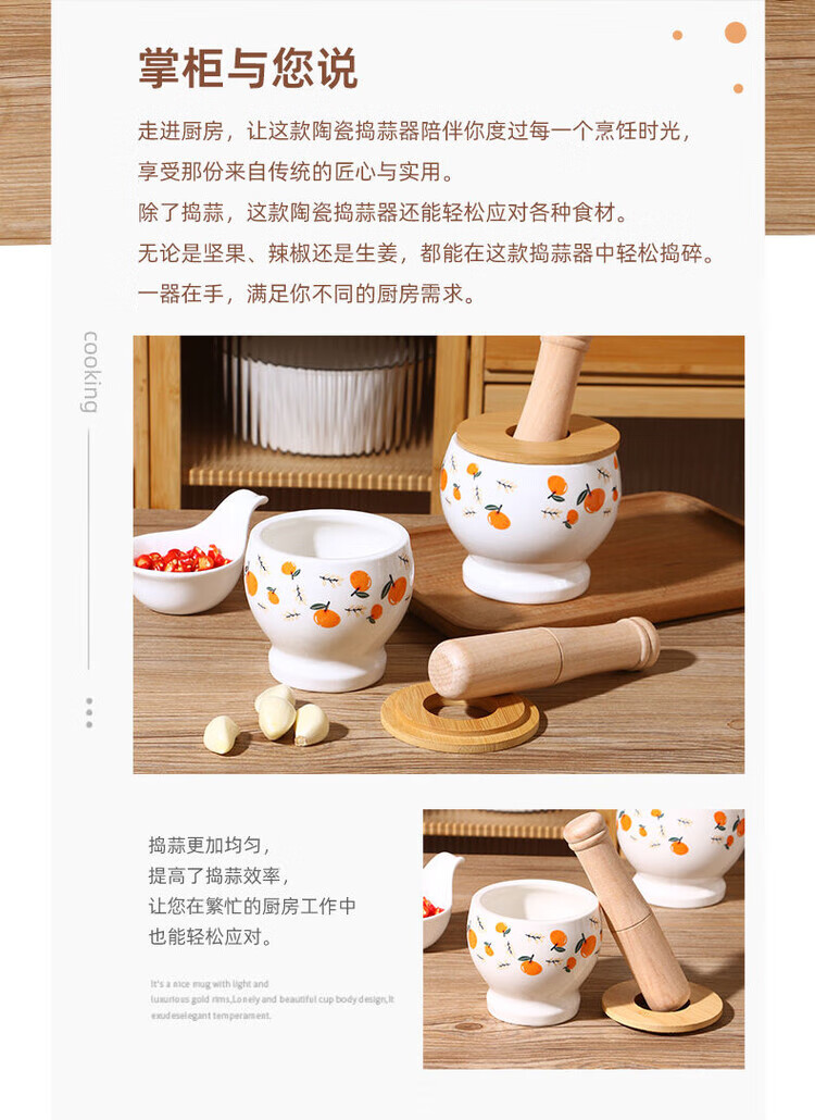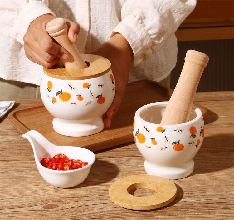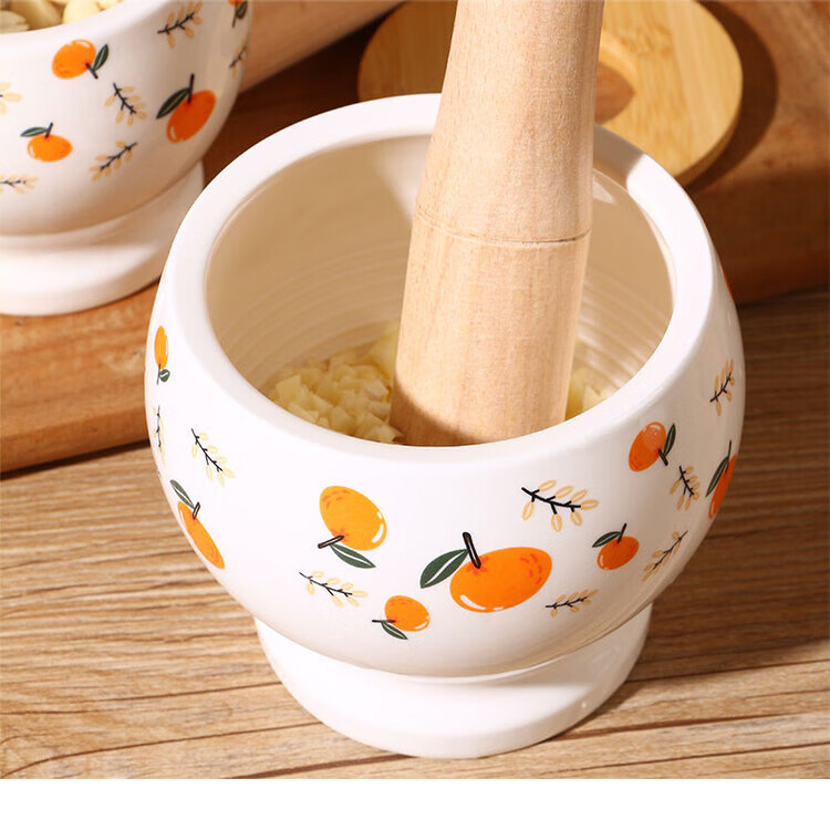 花沐禧捣蒜专用复古加厚蒜臼子手压式带盖捣碎器商用带盖螺纹研磨瓷罐子 繁花【捣蒜器大-650ml】+榉木棒+竹盖子