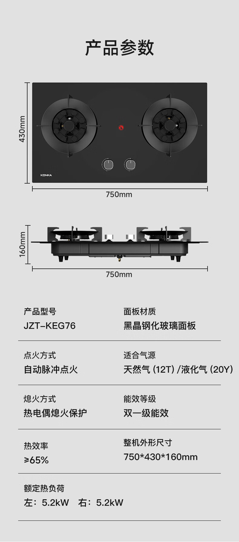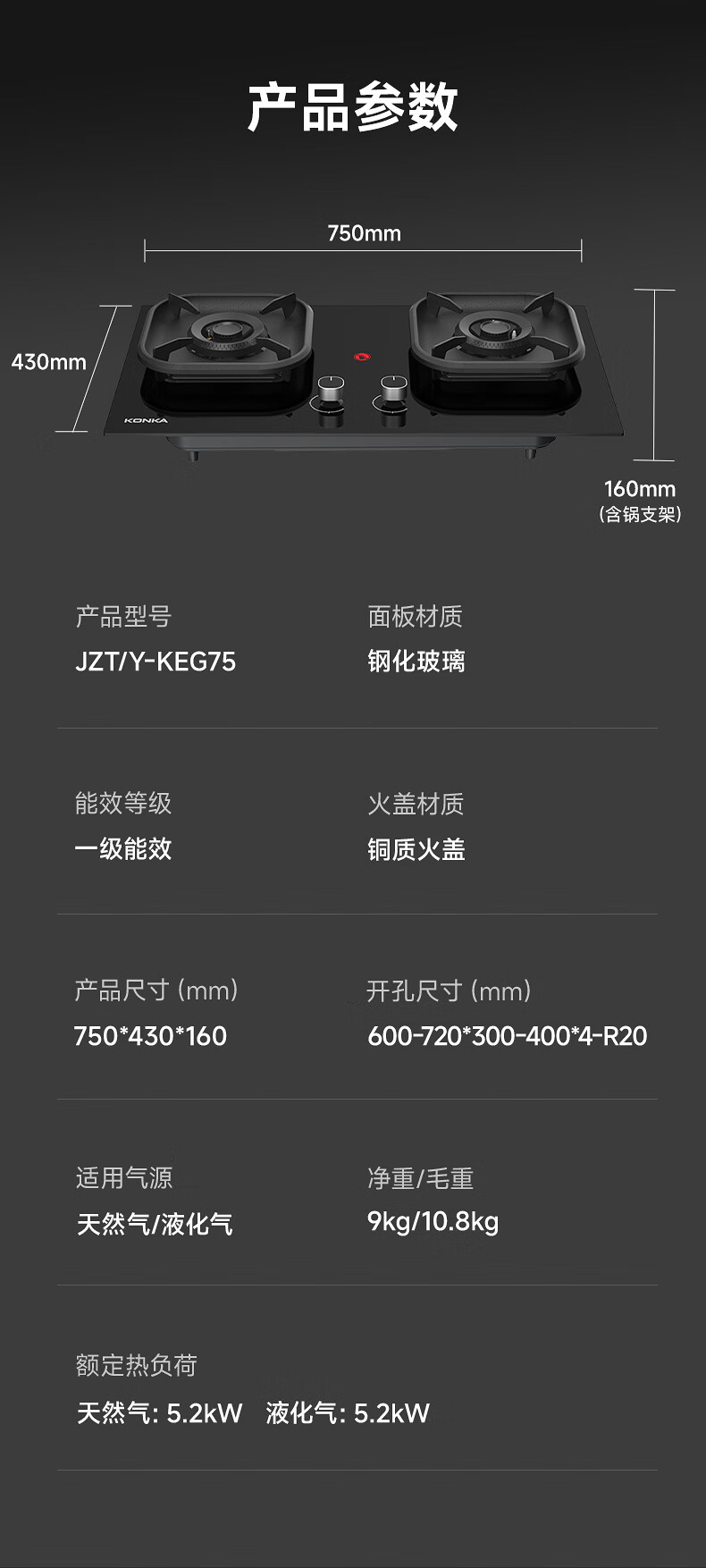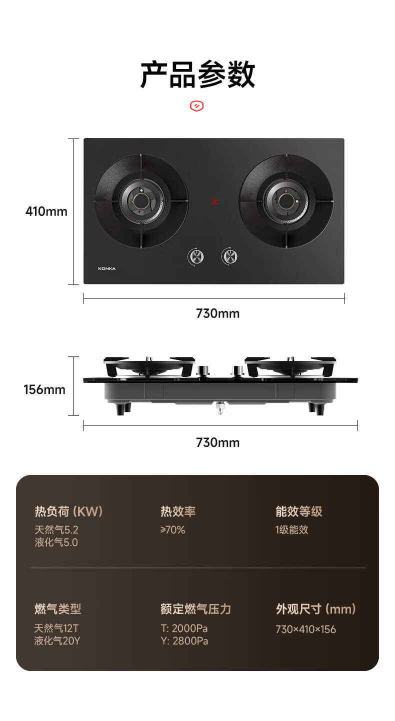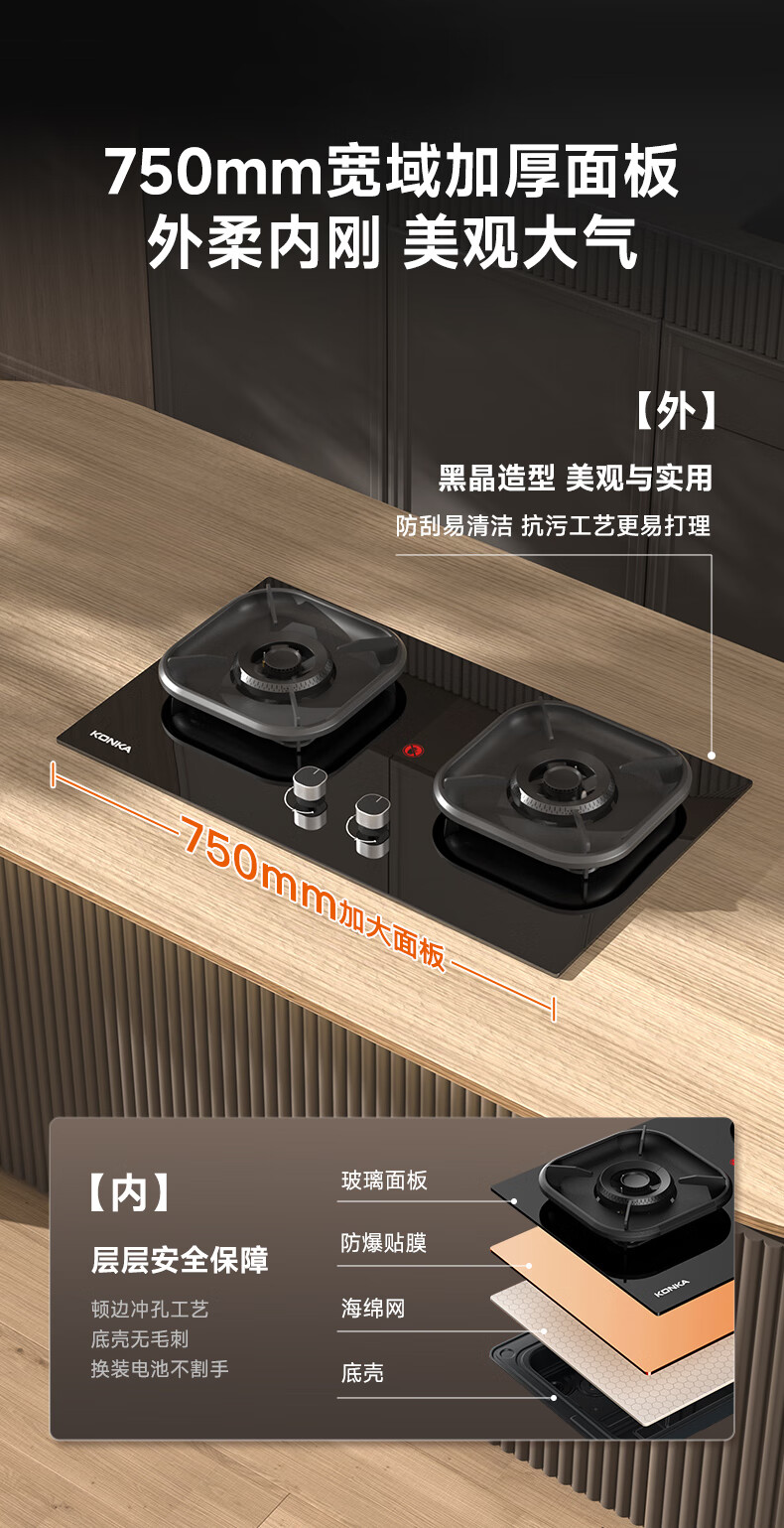 康佳(KONKA)燃气灶天然气煤气灶双灶嵌入式 大尺寸750mm大面板液化气灶免扩孔 5.2火力一级能效大开孔猛火灶 730mm面板 【铜火盖+铝炉头】KEF78 天然气(管道)