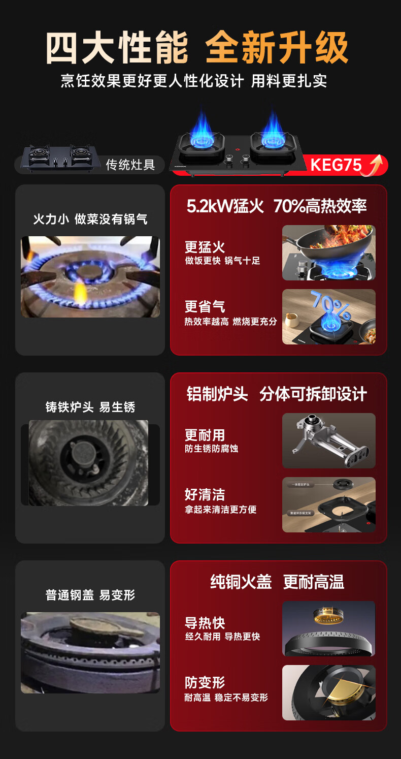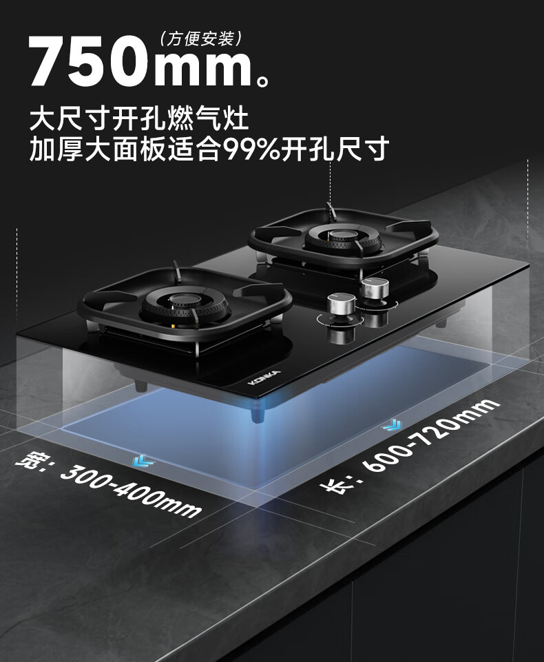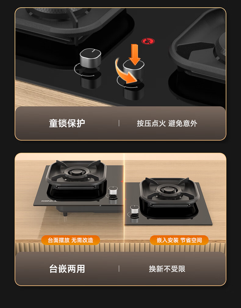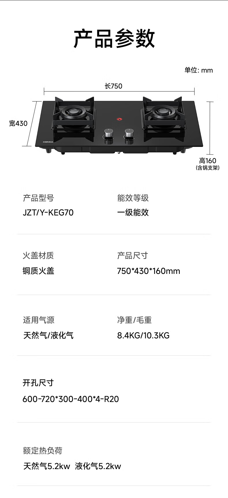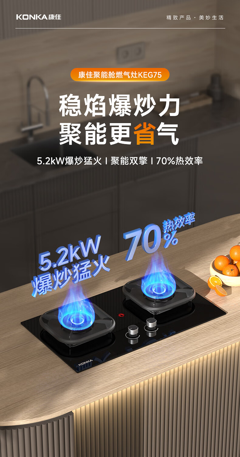 康佳(KONKA)燃气灶天然气煤气灶双灶嵌入式 大尺寸750mm大面板液化气灶免扩孔 5.2火力一级能效大开孔猛火灶 730mm面板 【铜火盖+铝炉头】KEF78 天然气(管道)