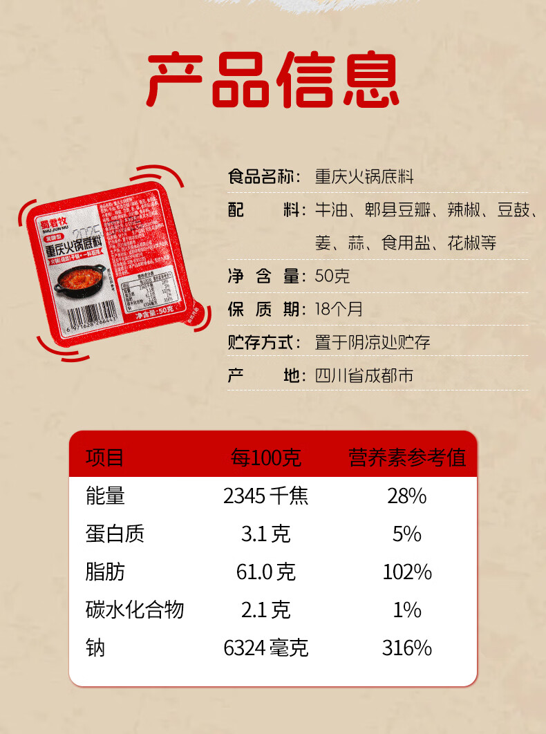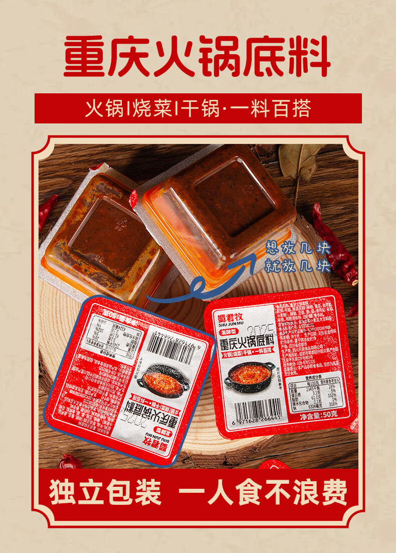 蜀君牧6盒火锅底料独立小包装正宗重庆火锅底料冒菜麻辣烫炒菜麻辣家用 重庆火锅底料50g*15盒