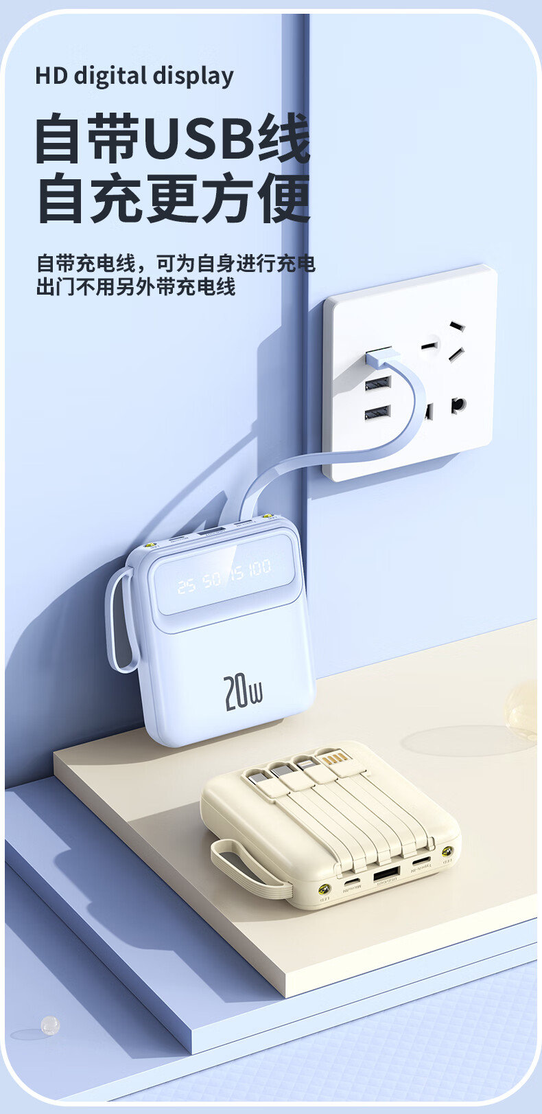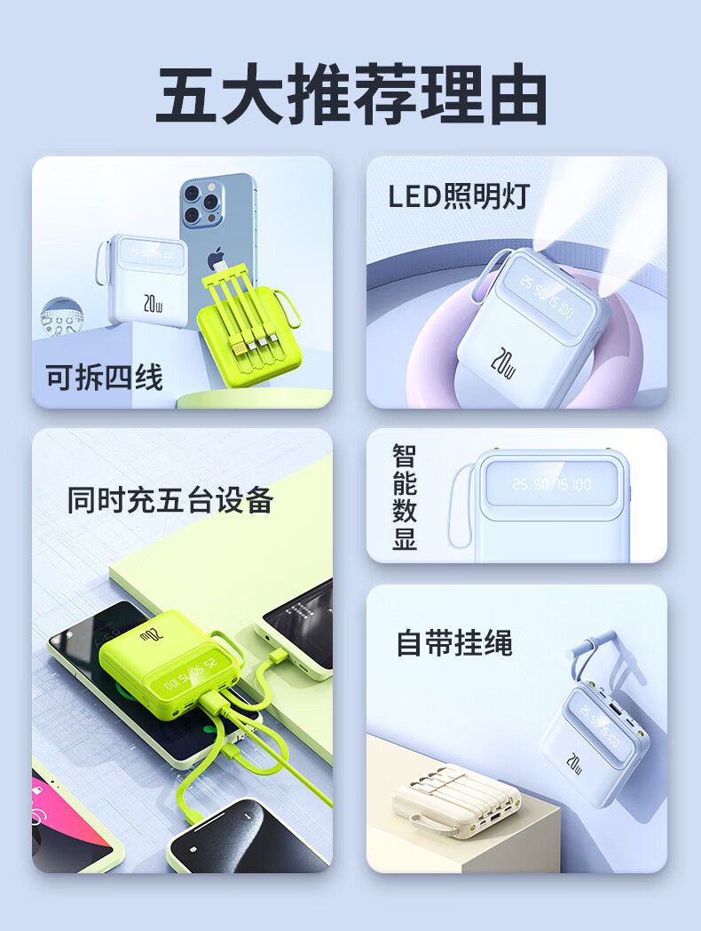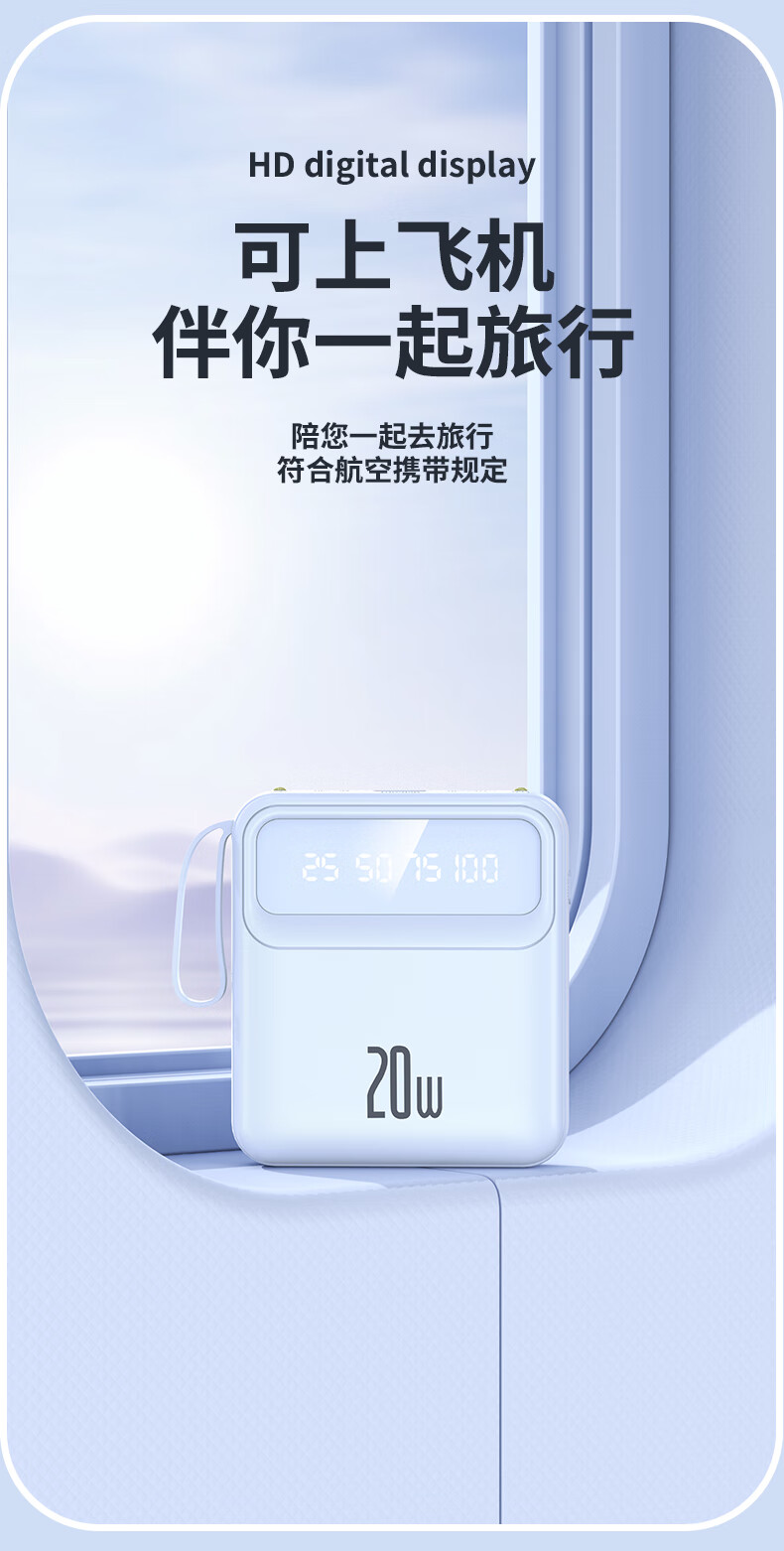 科希帝【 3C认证|可上飞机】超级快充充电宝20000毫安大容量自带线小巧便携移动电源适用于华为苹果小米 浅蓝色【普通版+国产电芯】