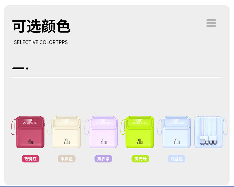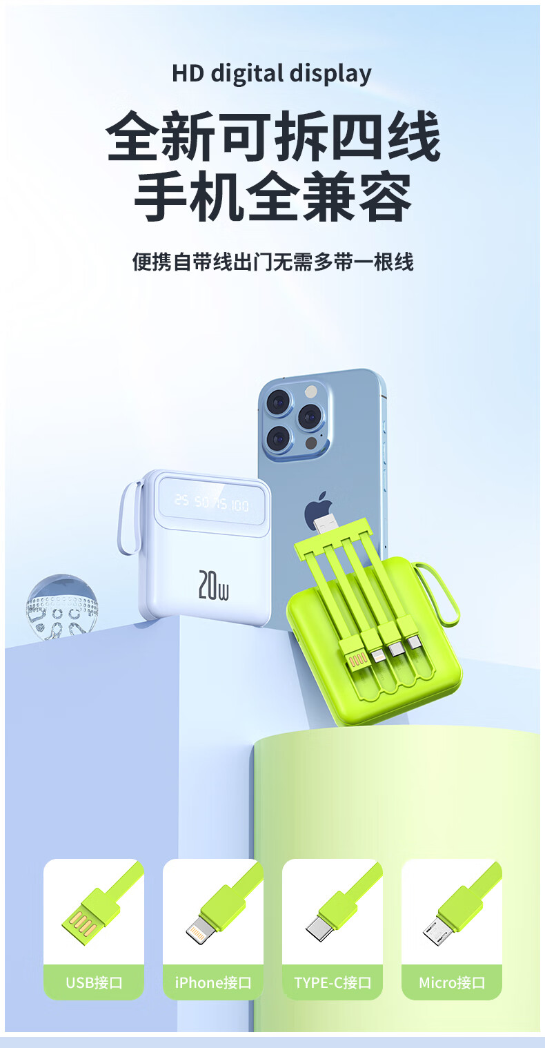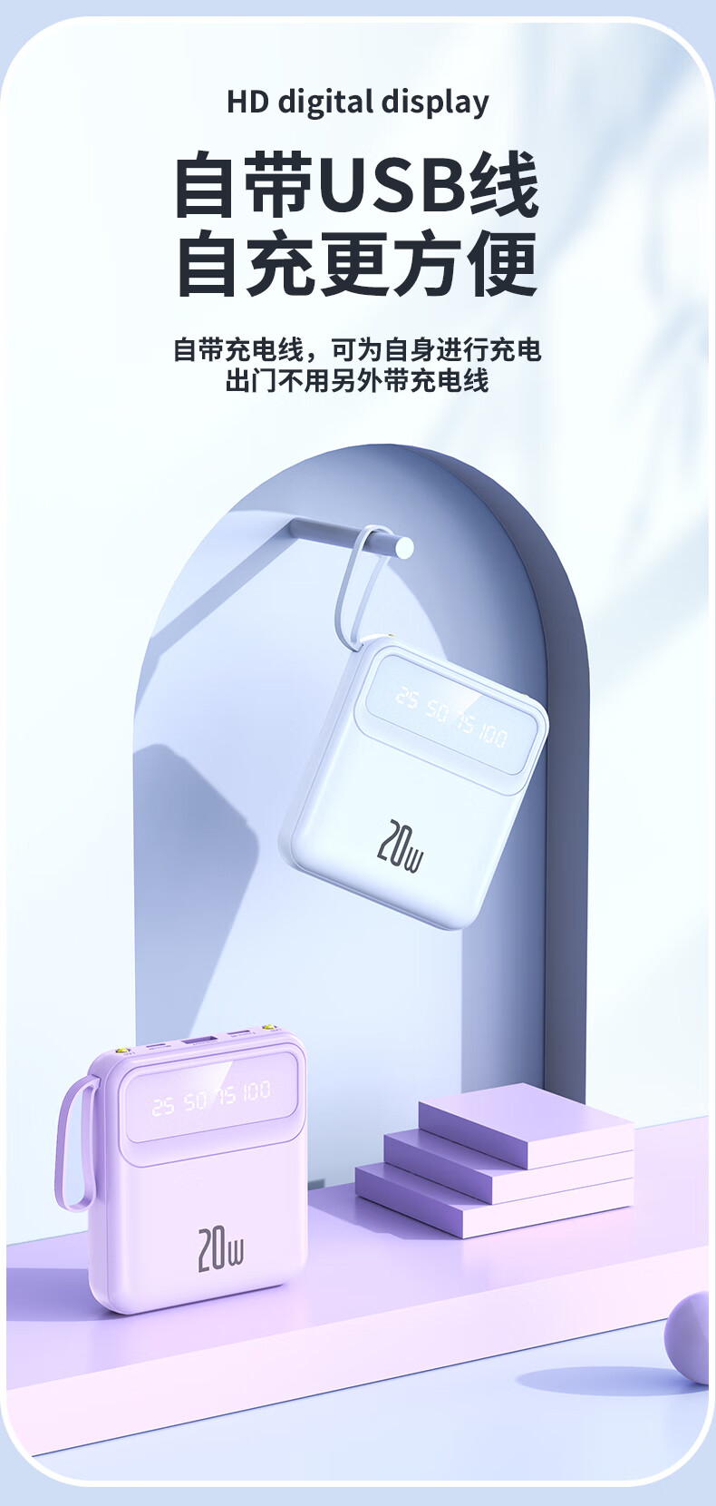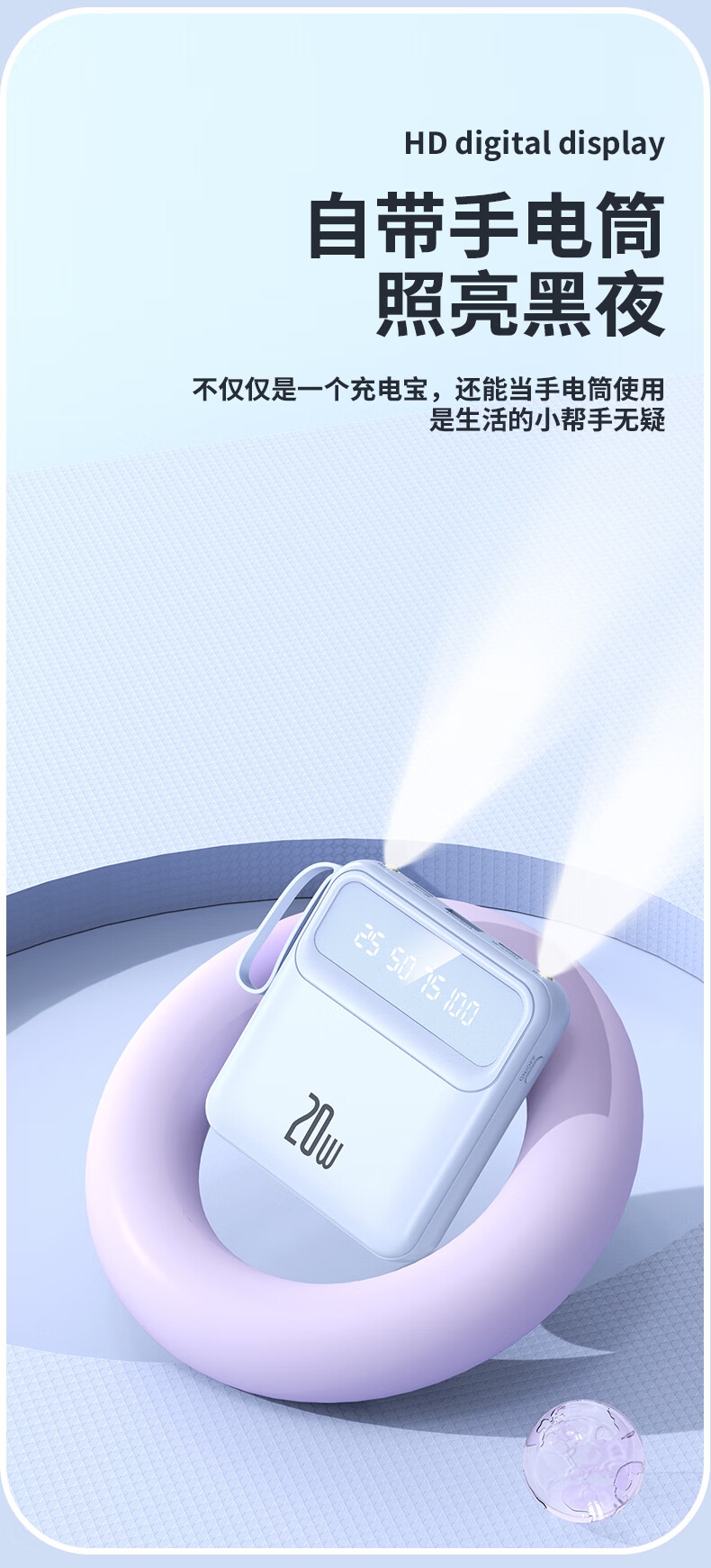 科希帝【 3C认证|可上飞机】超级快充充电宝20000毫安大容量自带线小巧便携移动电源适用于华为苹果小米 浅蓝色【普通版+国产电芯】