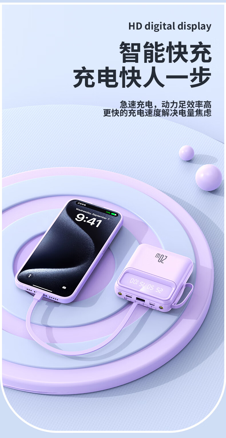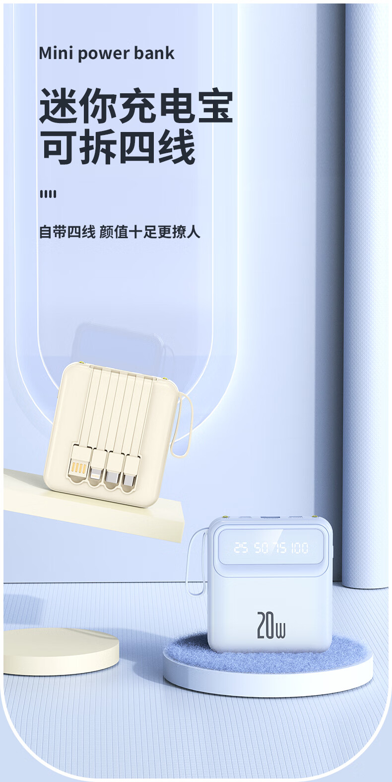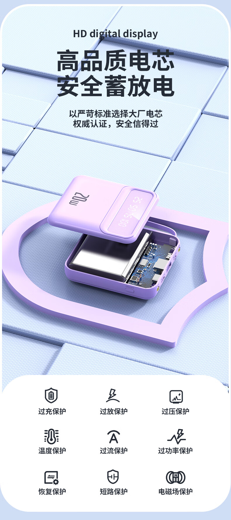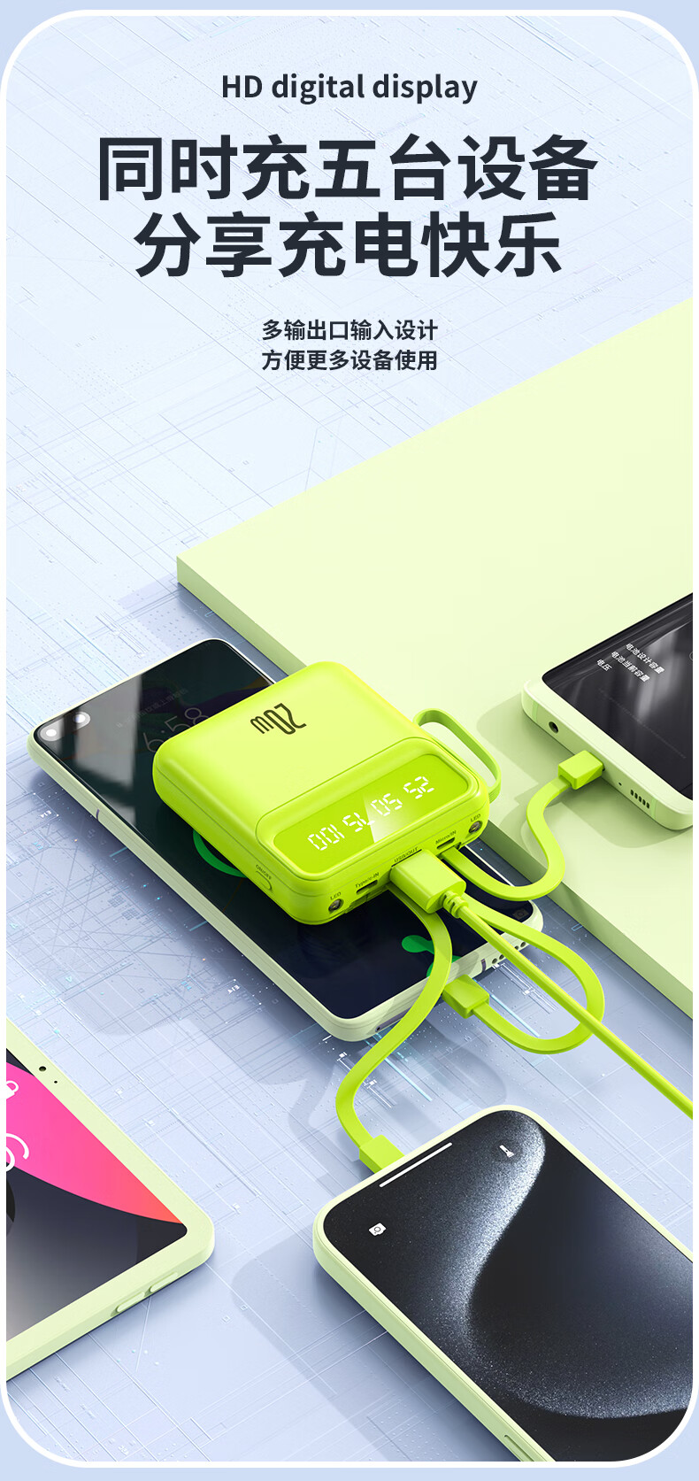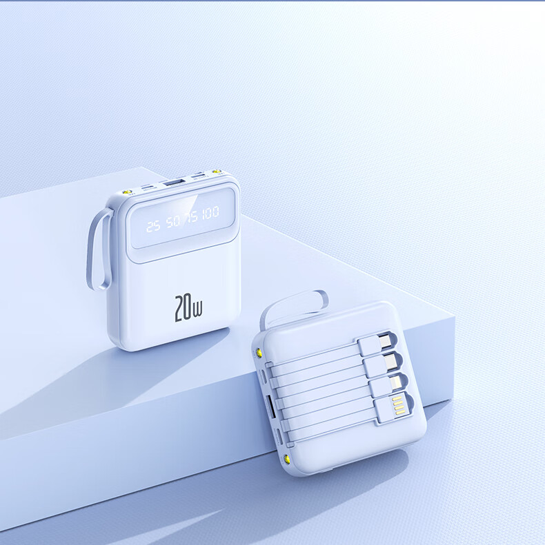 京东京造35W自带线充电宝20000毫安3c认证可上飞机京东自营移动电源适用户外苹果17小米17华为荣耀冰川蓝