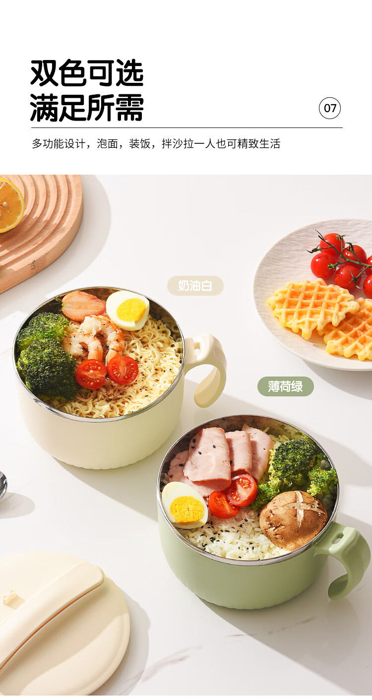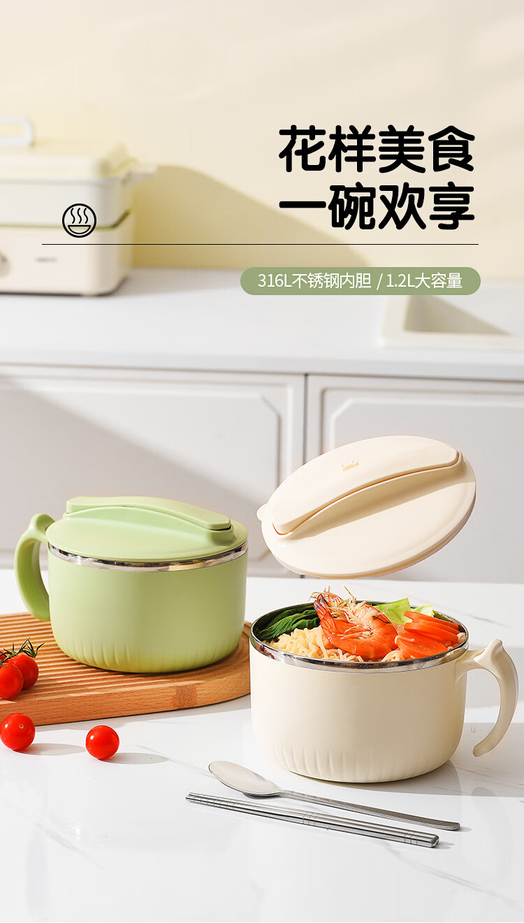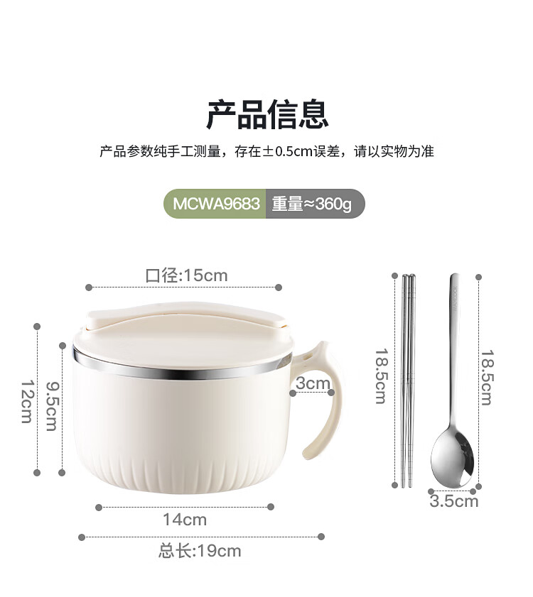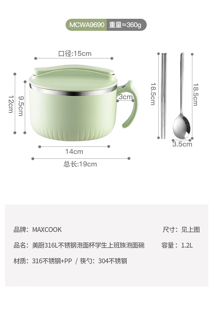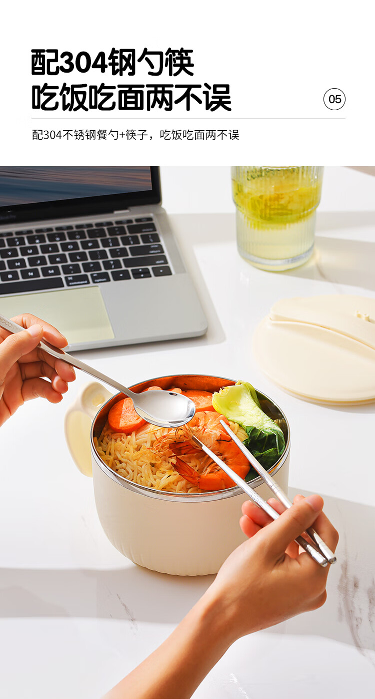 美厨(MAXCOOK)316L不锈钢泡面碗 学生饭盒餐杯泡面杯1200ML 配筷勺 白MCWA9683