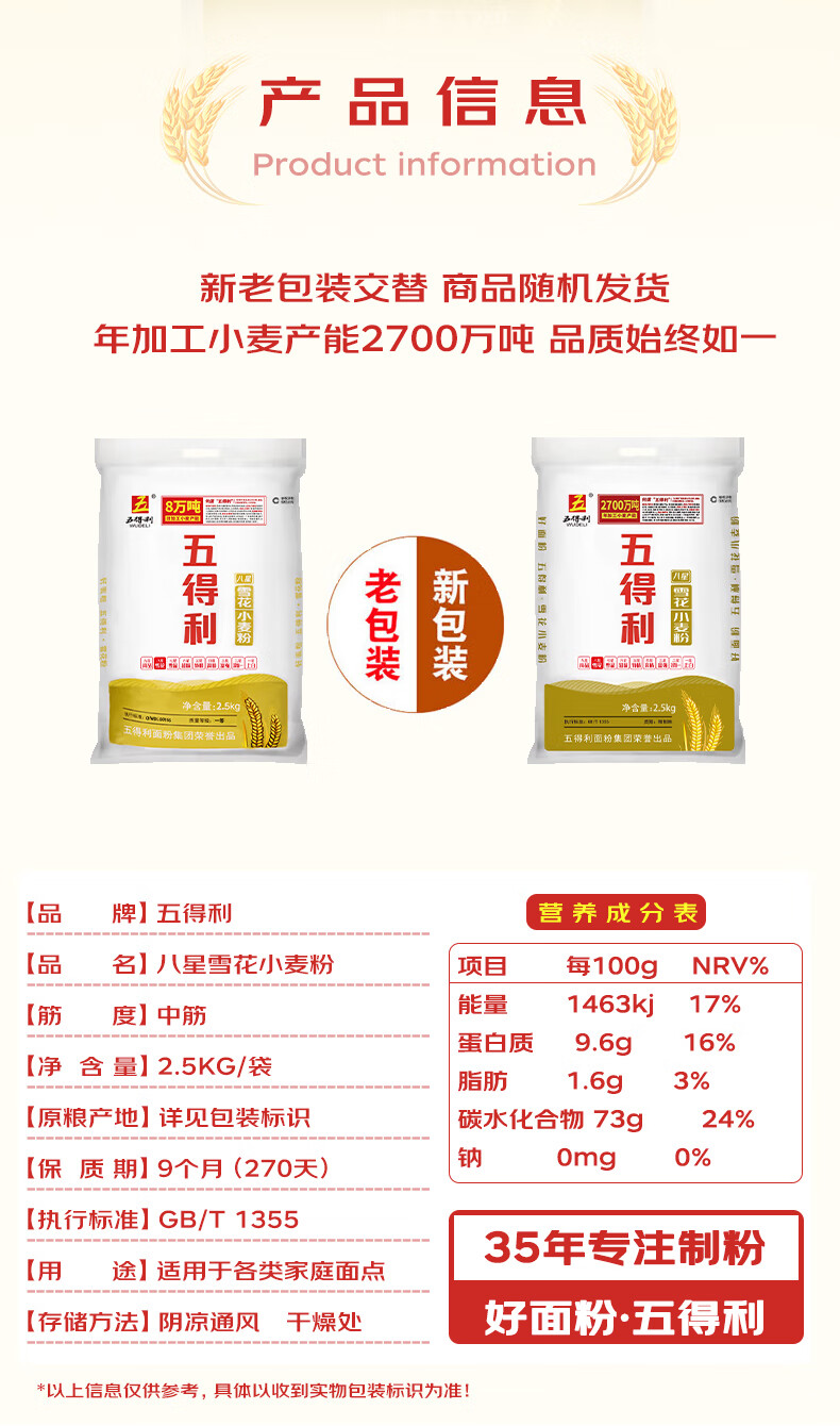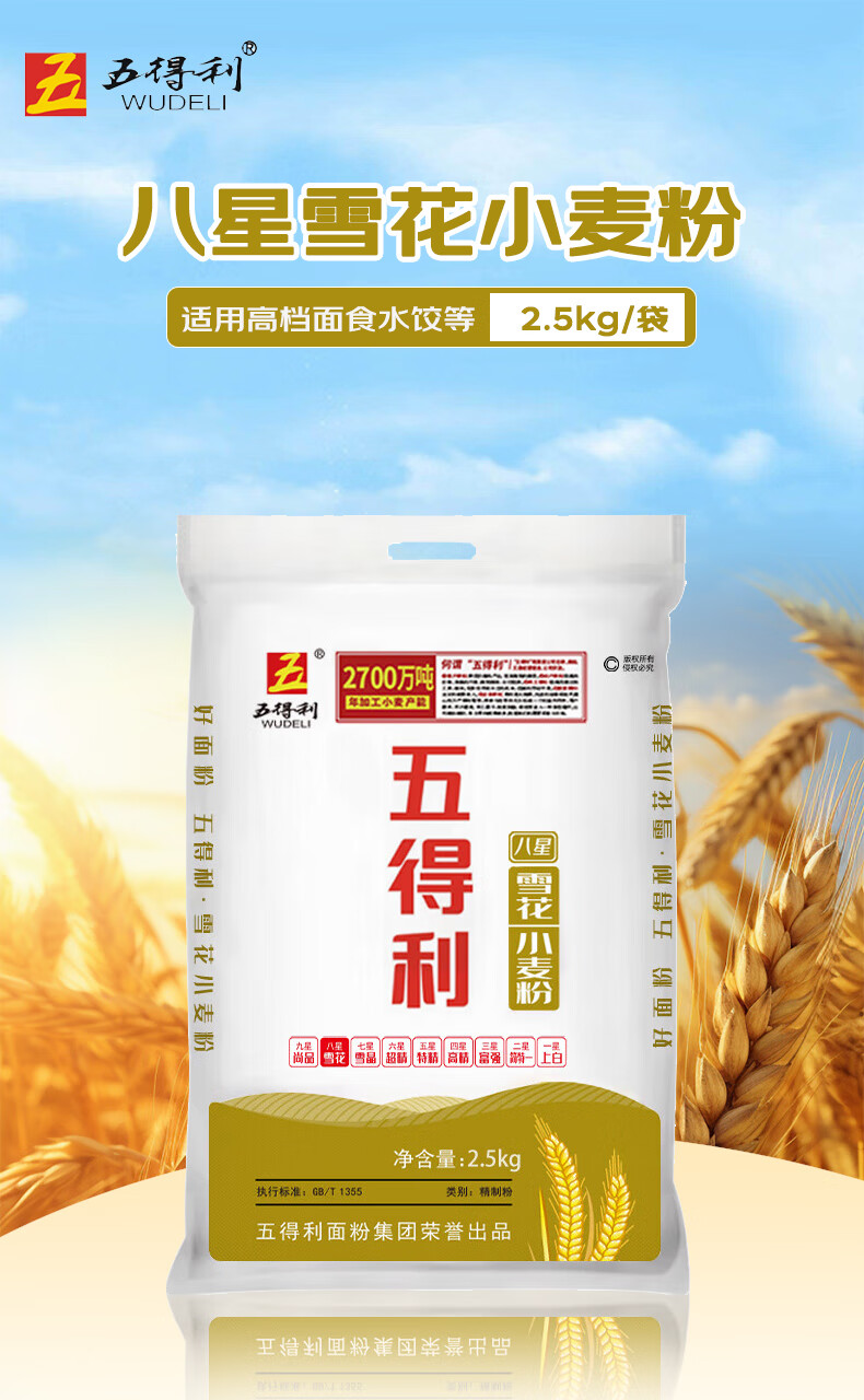 五得利面粉5斤八星雪花麦芯粉2.5kg中筋多用途白面馒头饼面条包子烘焙食