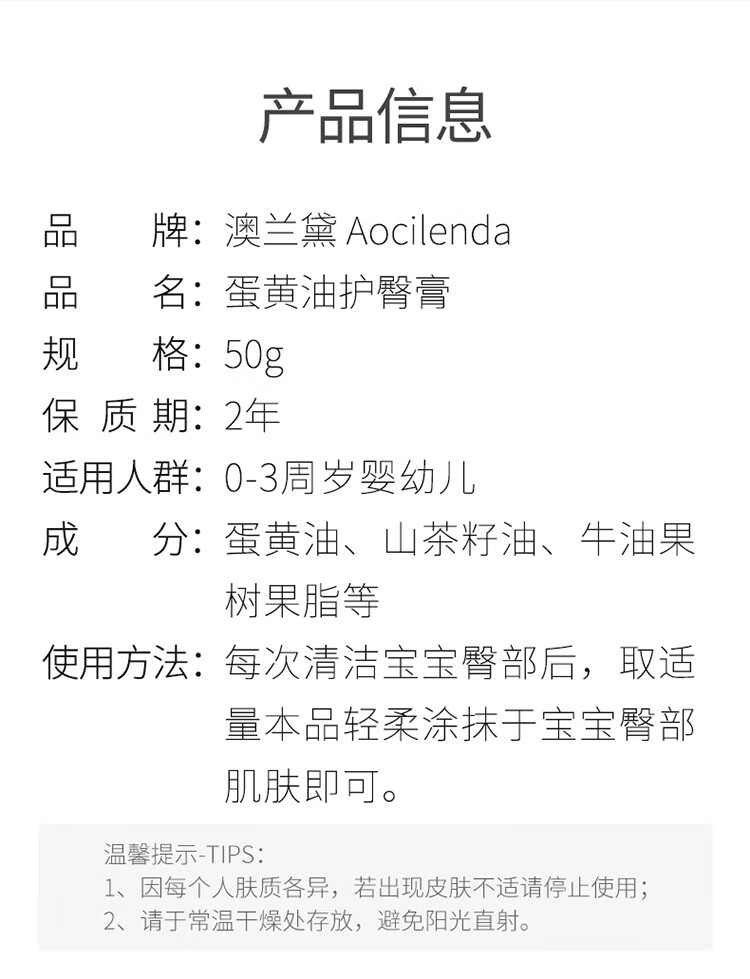 澳兰黛蛋黄油护臀膏新生婴儿专用宝宝红屁屁霜护臀膏滋润50g