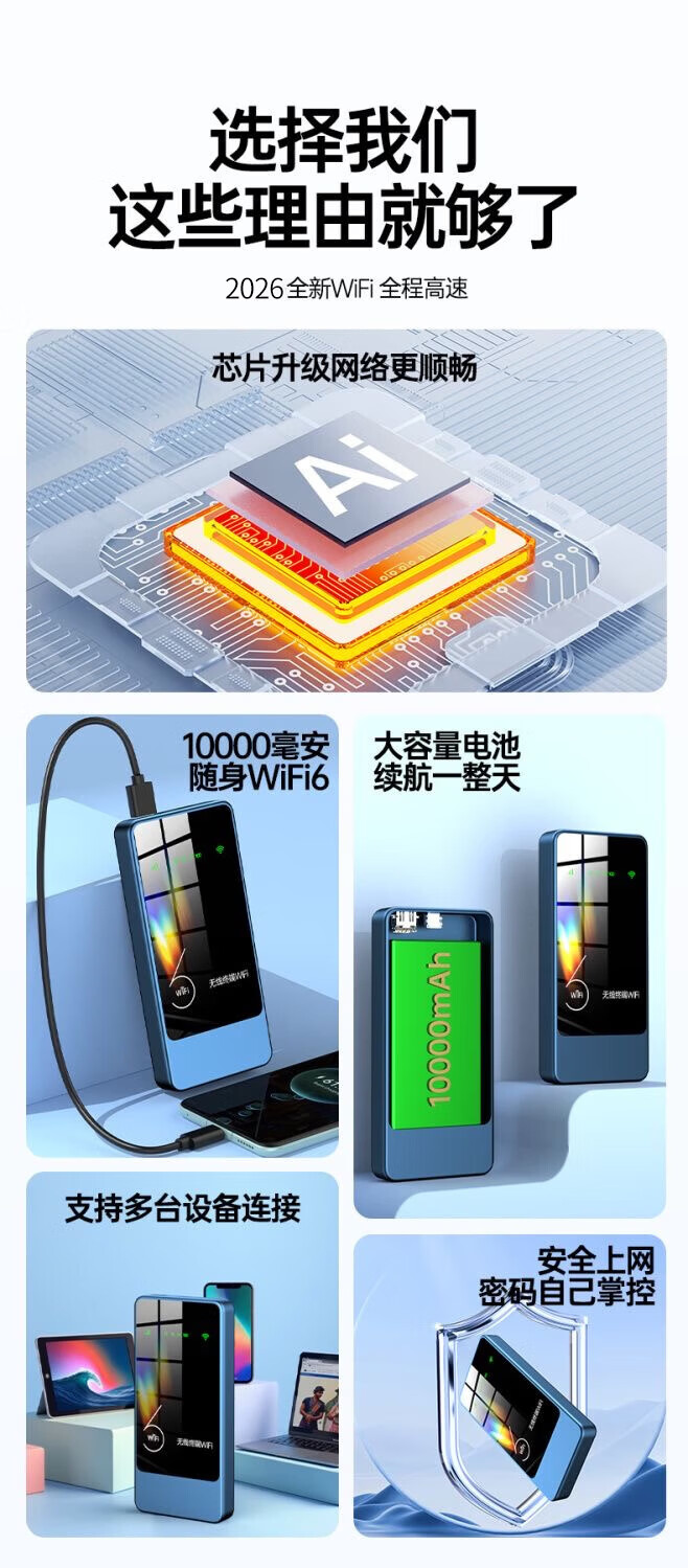 火萌随身wifi官方正品移动无限流量5ghz无线路由器充电宝二合一电脑游戏专用车载WiFi2025款全国通用 【1万毫安-蓝色】72小时续航高速wifi6