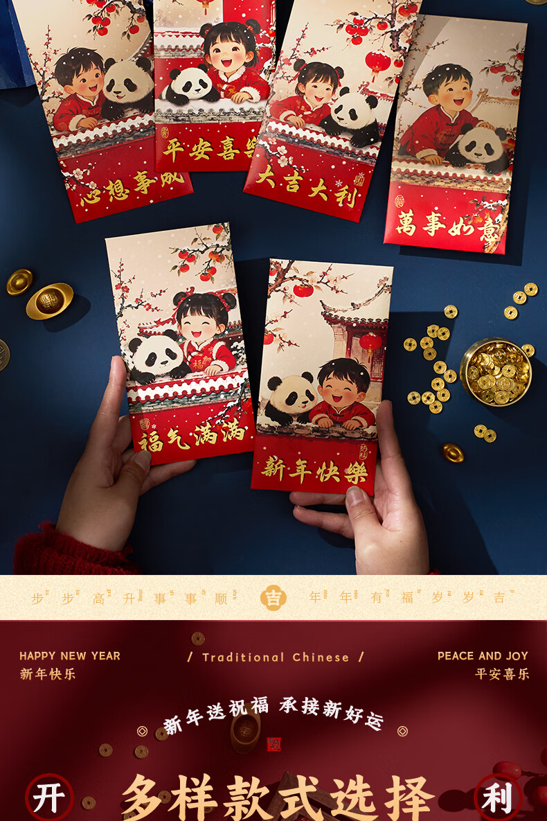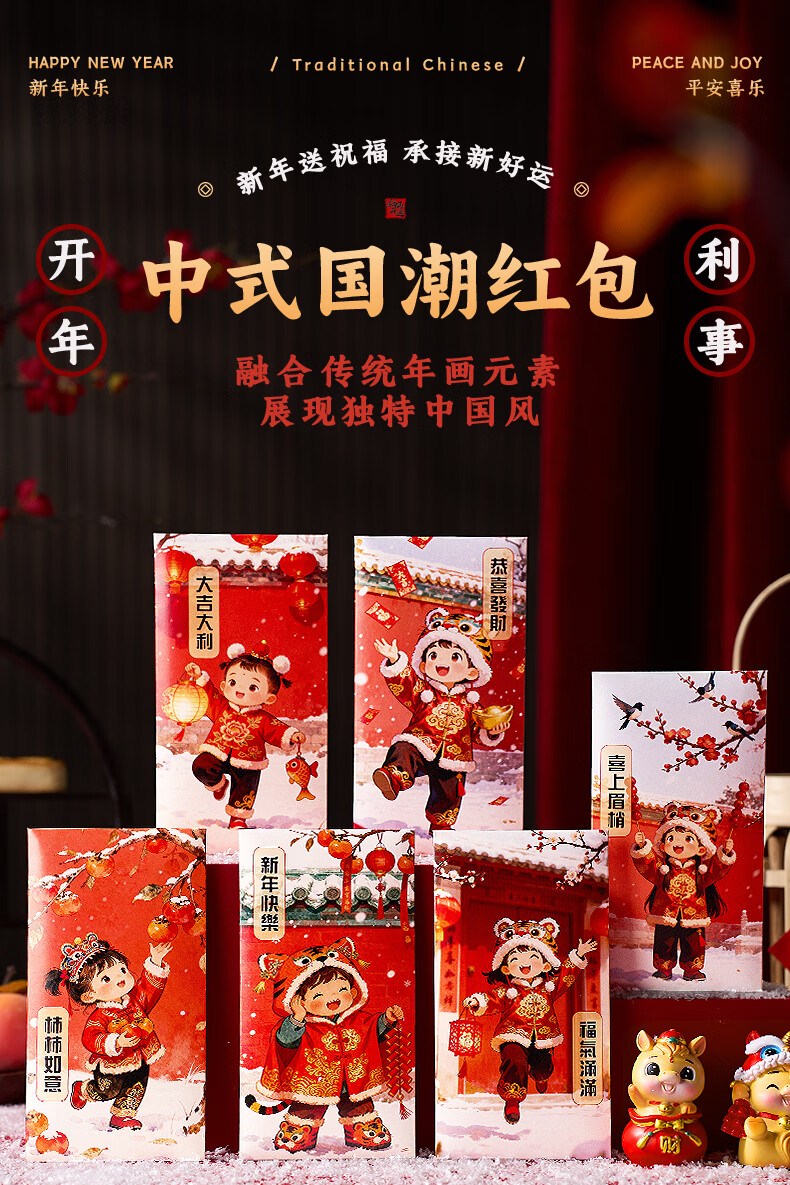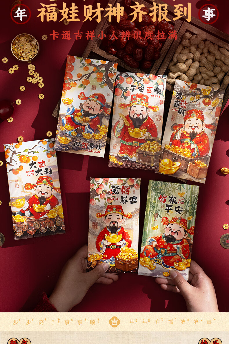 玖岩国潮国风福娃中式红包2026新款马年利是封新年春节压岁包送小孩子 萌宝送福来 6个装