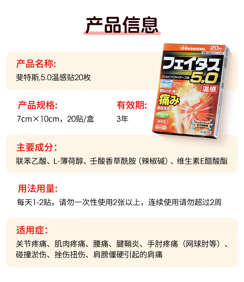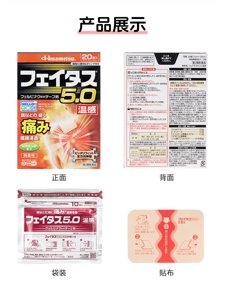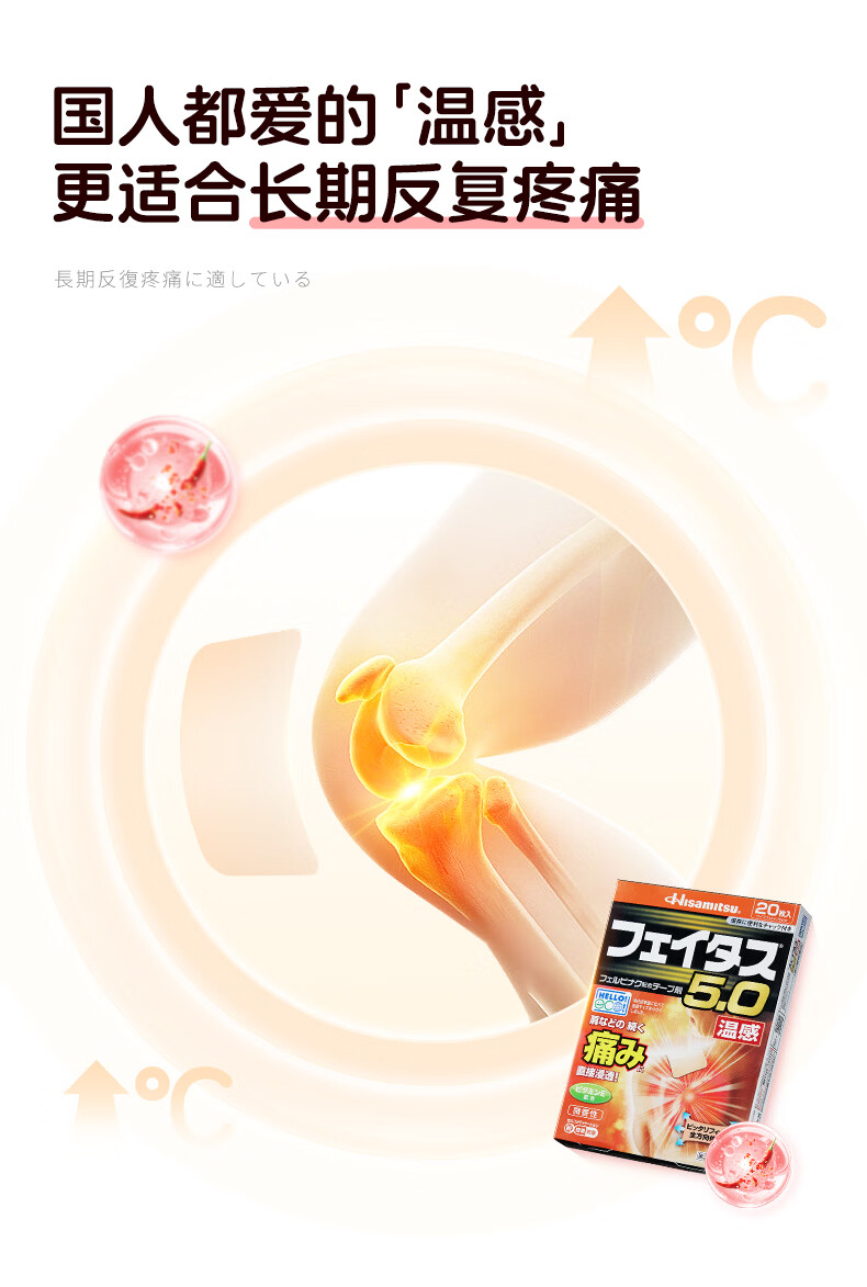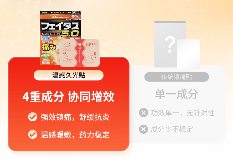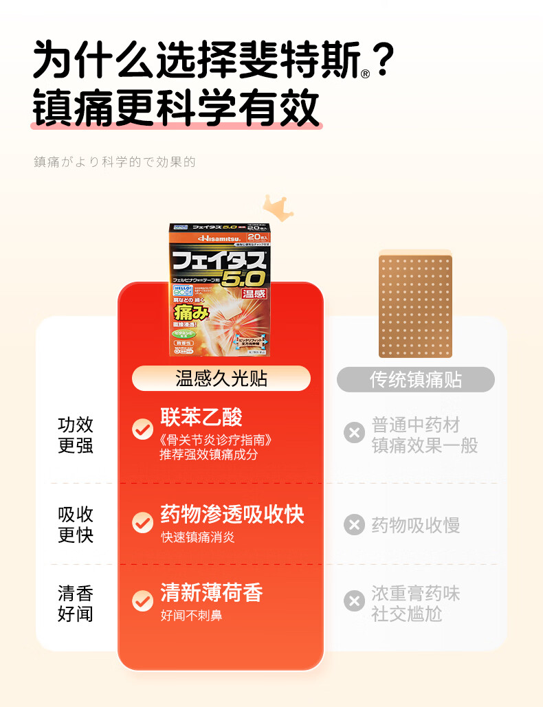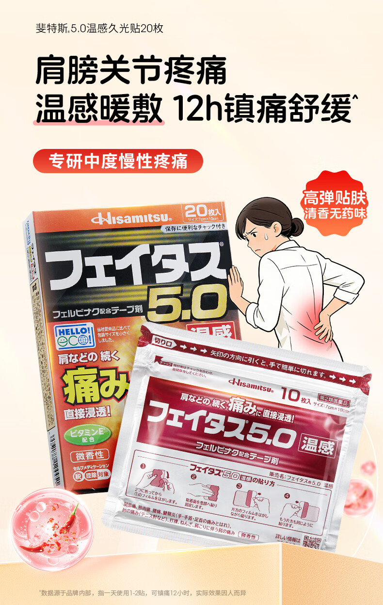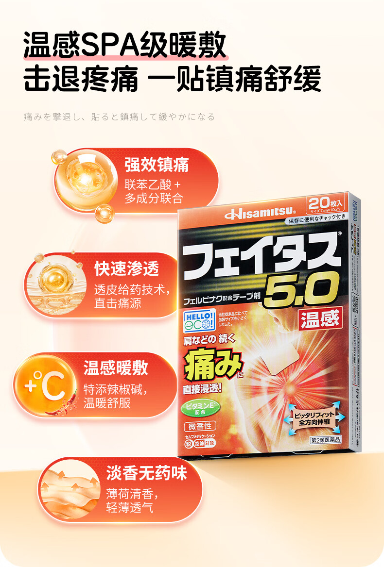 久光制药温感久光贴膏斐特斯5.0镇痛贴日本膏药联苯乙酸止痛颈椎腰痛肩颈腱鞘炎肩周炎(7cm*10cm)20贴撒隆巴斯升级版