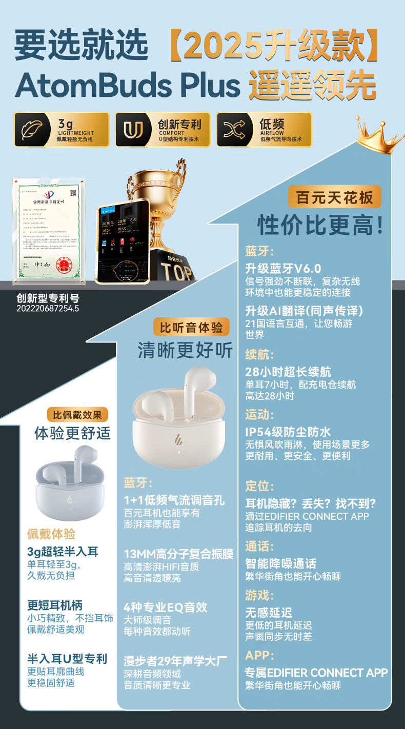 漫步者(EDIFIER)AtomBuds真无线蓝牙耳机半入耳式 原子豆Plus花再降噪通话音乐运动低延迟游戏 超长续航 节日礼物 Plus焕新版-云白 【2025新款】