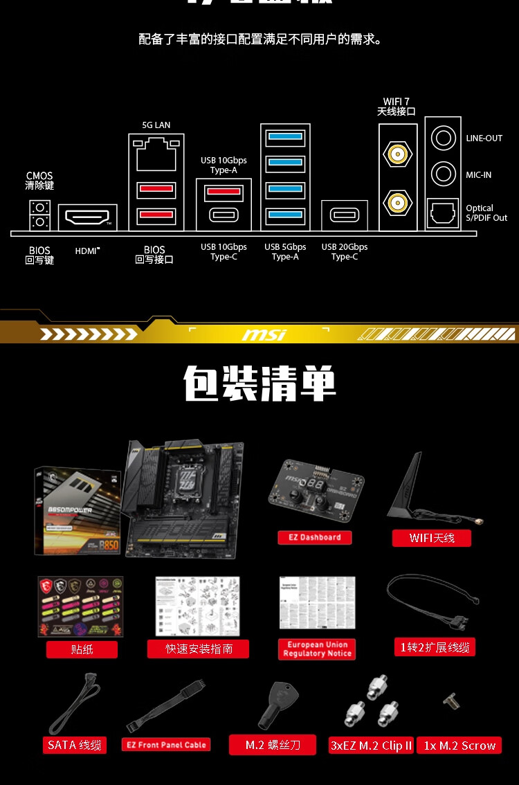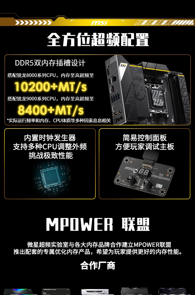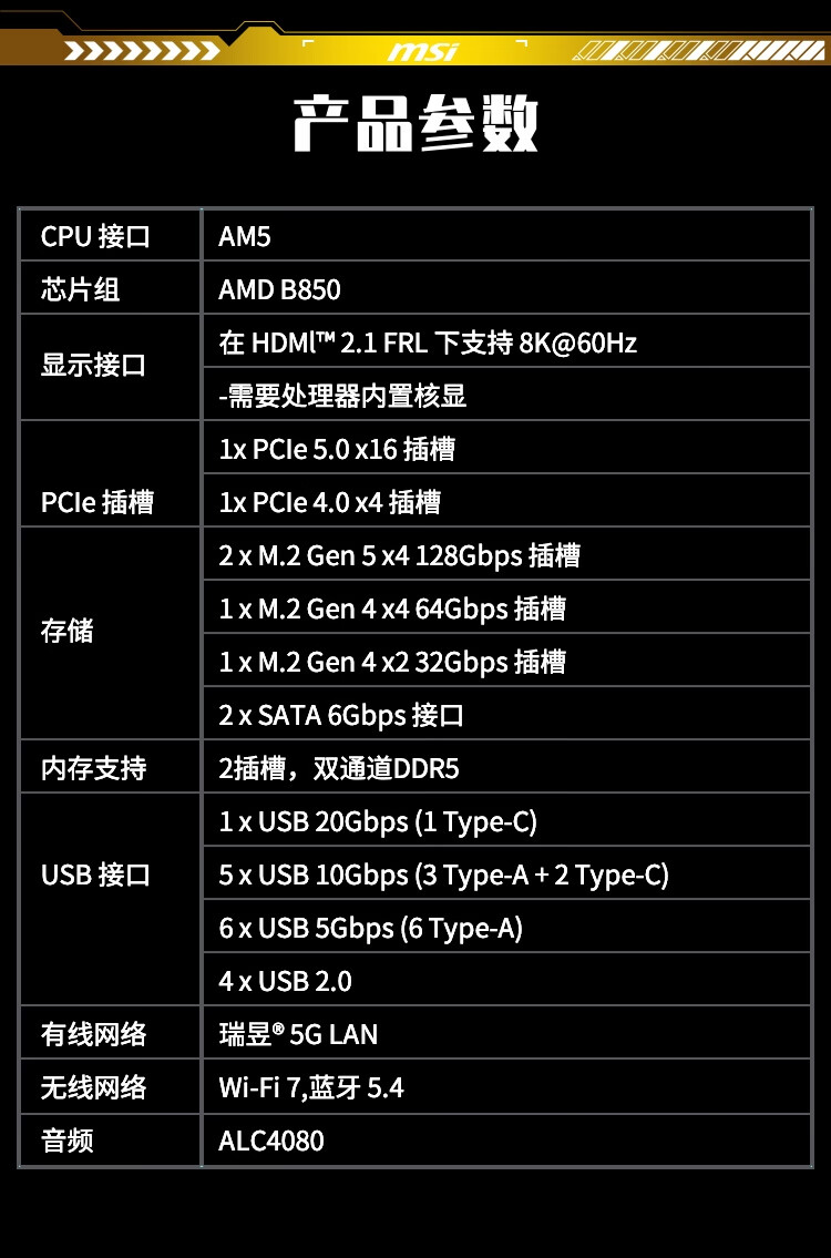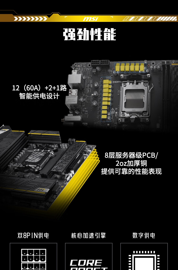 微星(MSI)B850MPOWER 超频主板 支持CPU AMD 9700X/9800X3D/9950X3D/9600X(AMD B850/AM5接口)