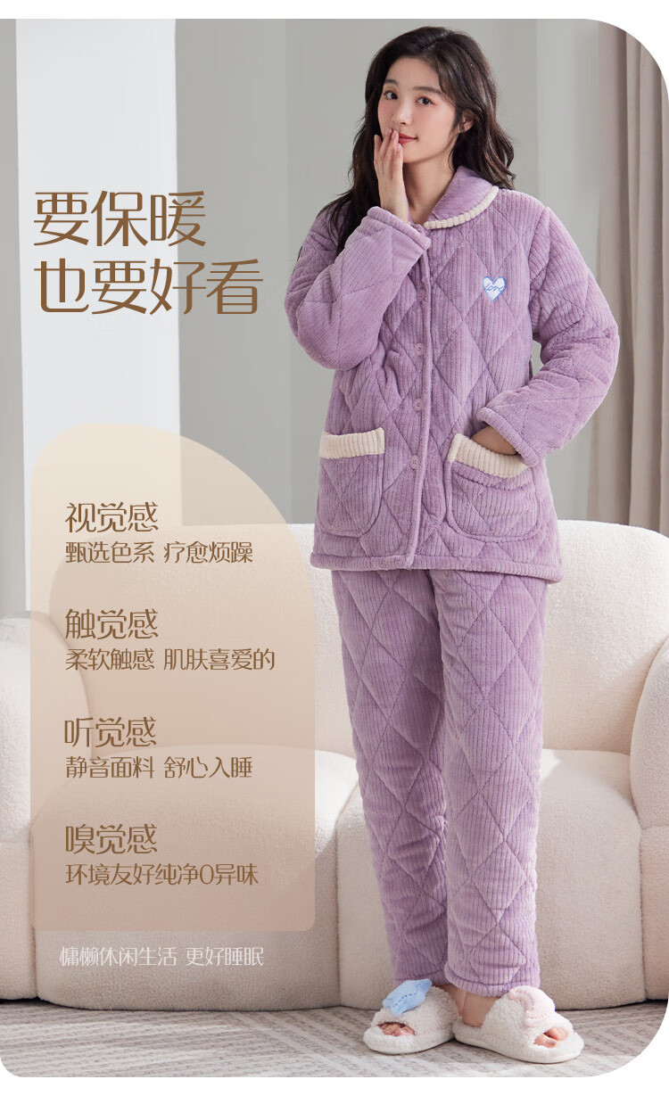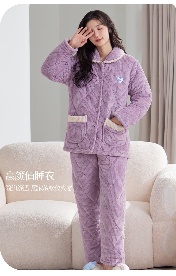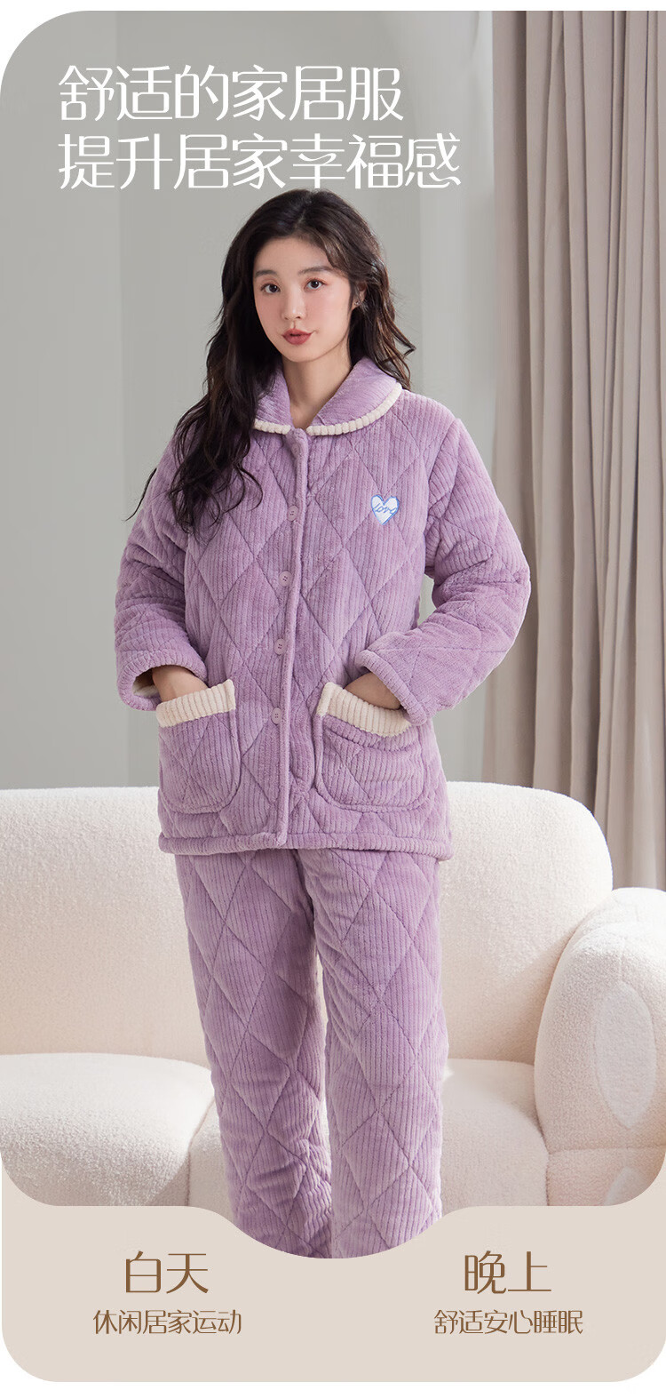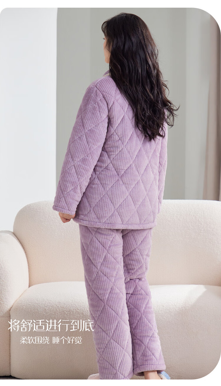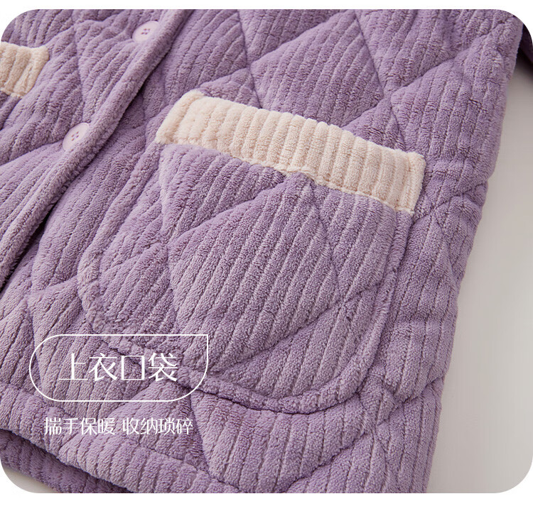 香蜜闺秀【三层夹棉加厚】暖冬可外穿长袖开衫女士家居服棉服保暖睡衣套装 24403001紫色 L