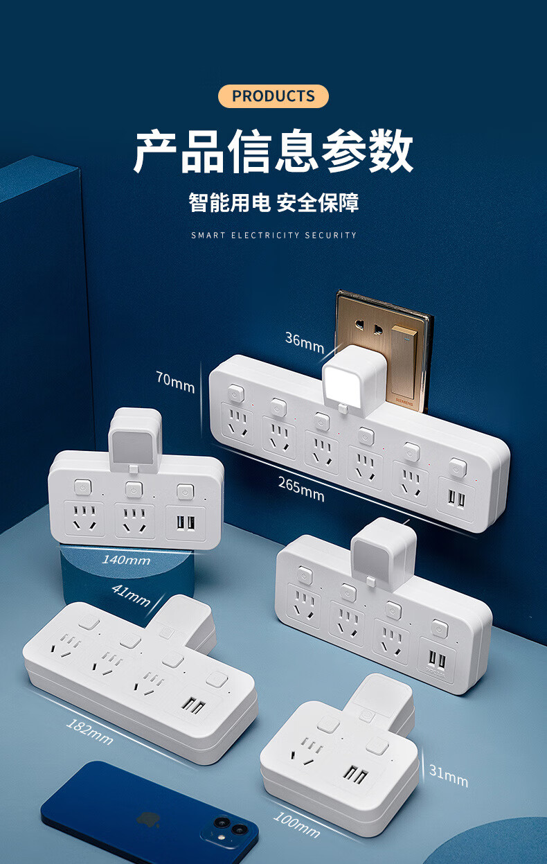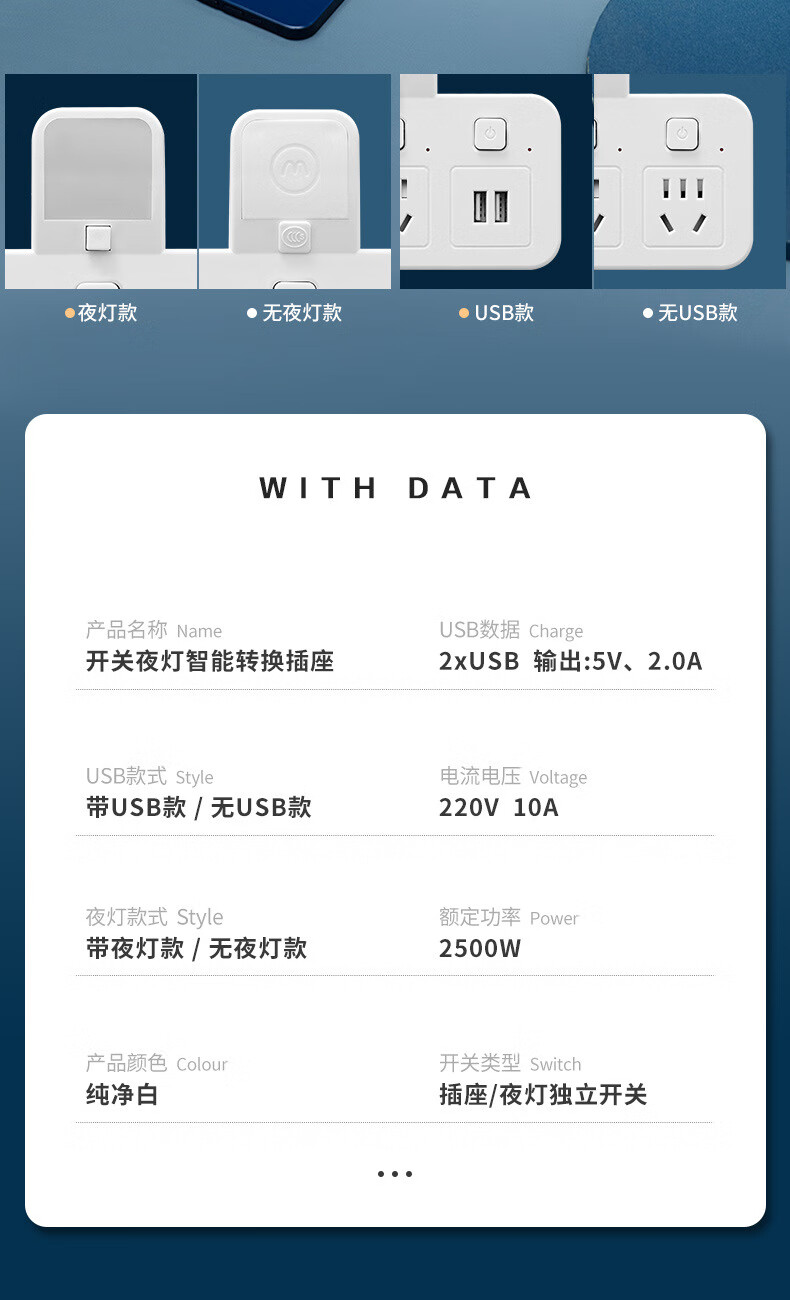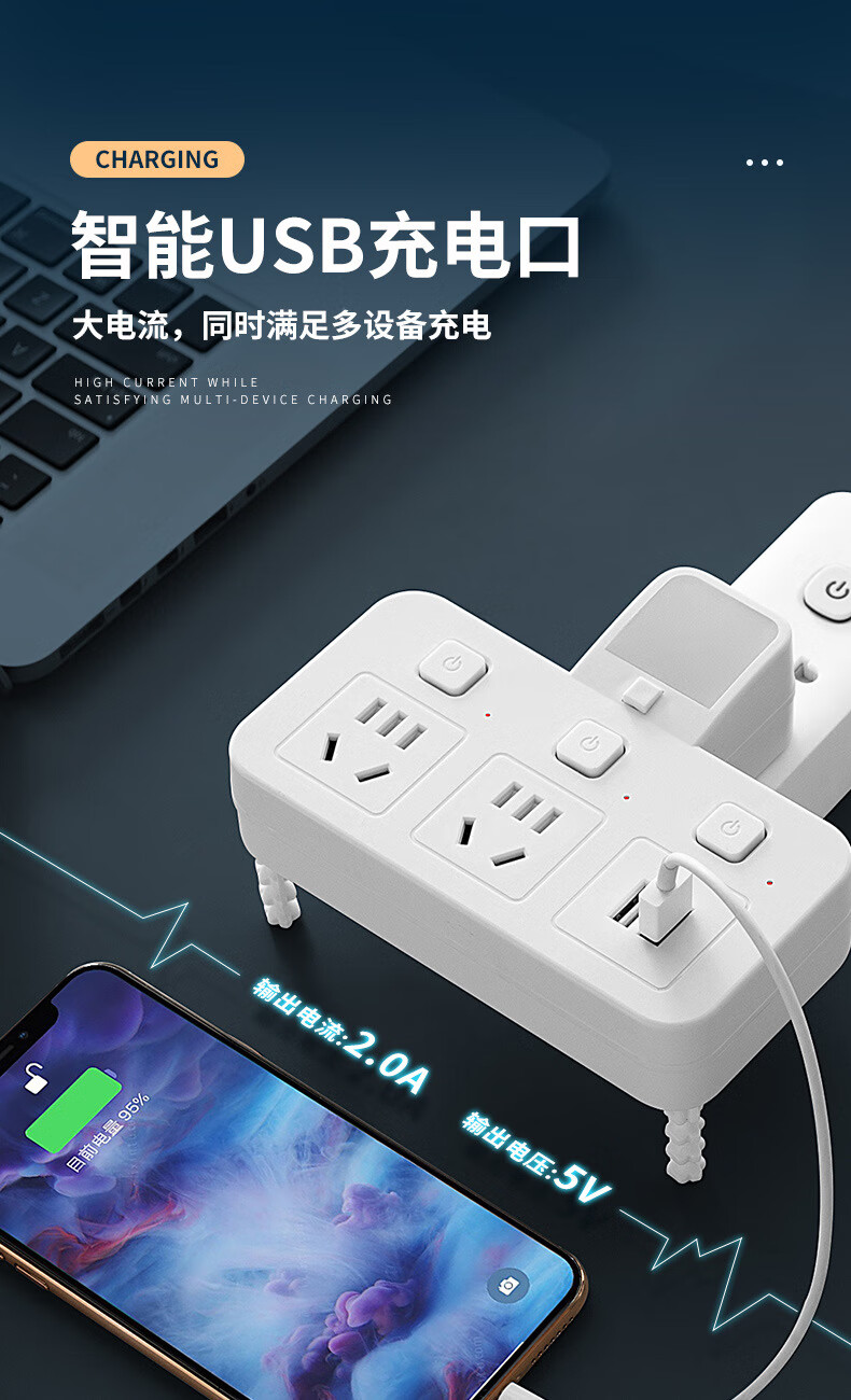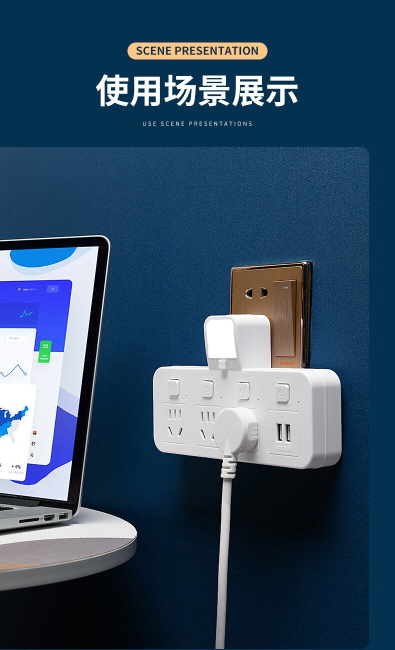 山头林村公牛(BULL)同款家用办公多功能无线转换器插座带USB夜灯多孔位 一转二[带独立开关]