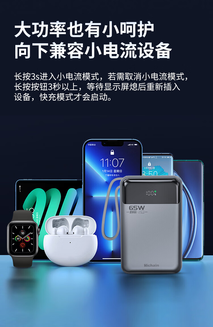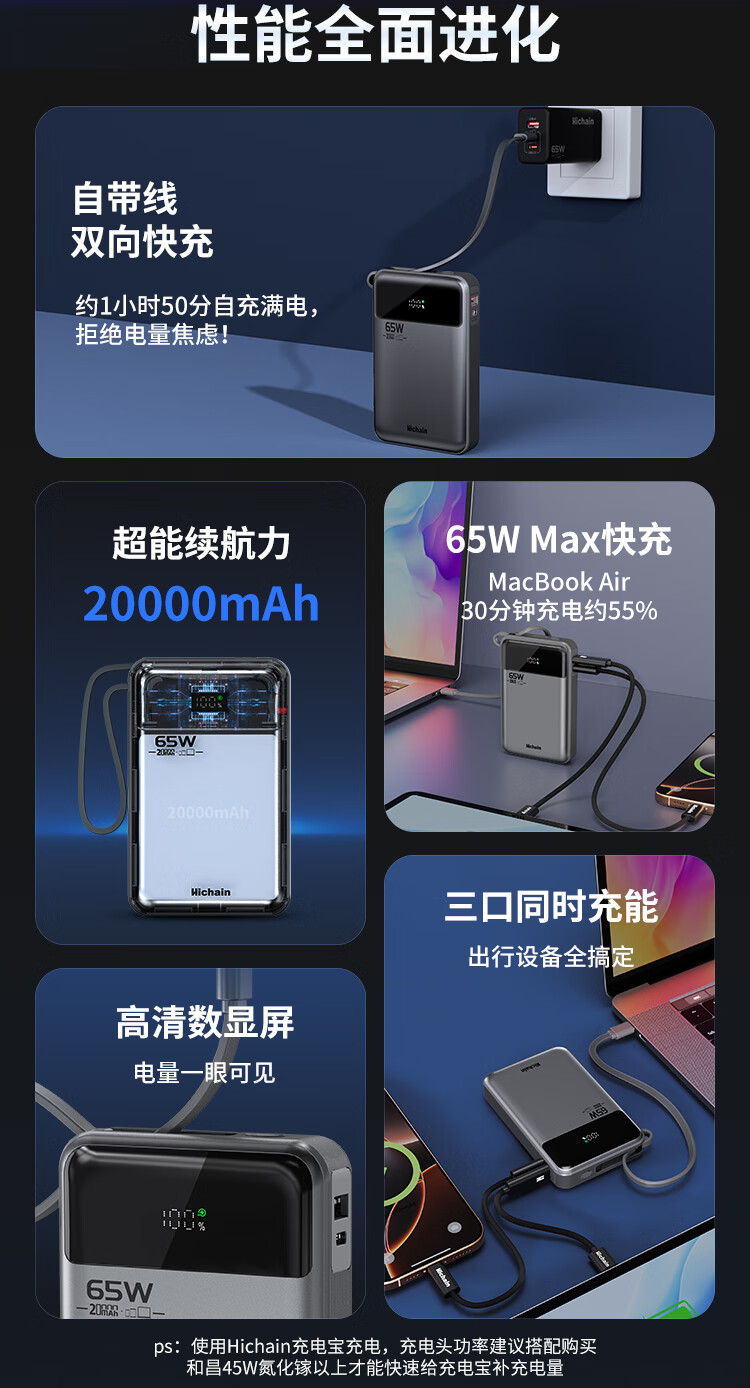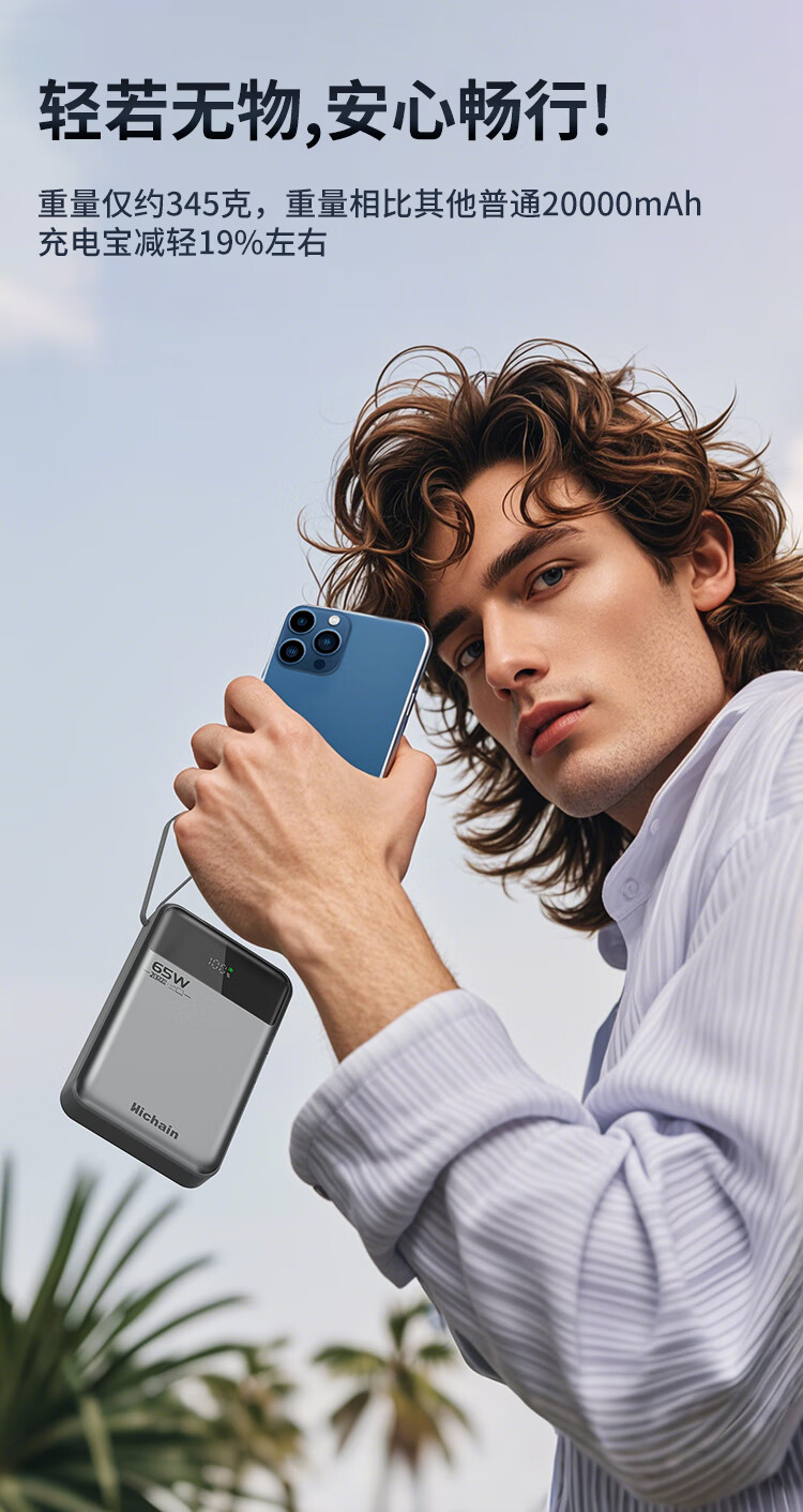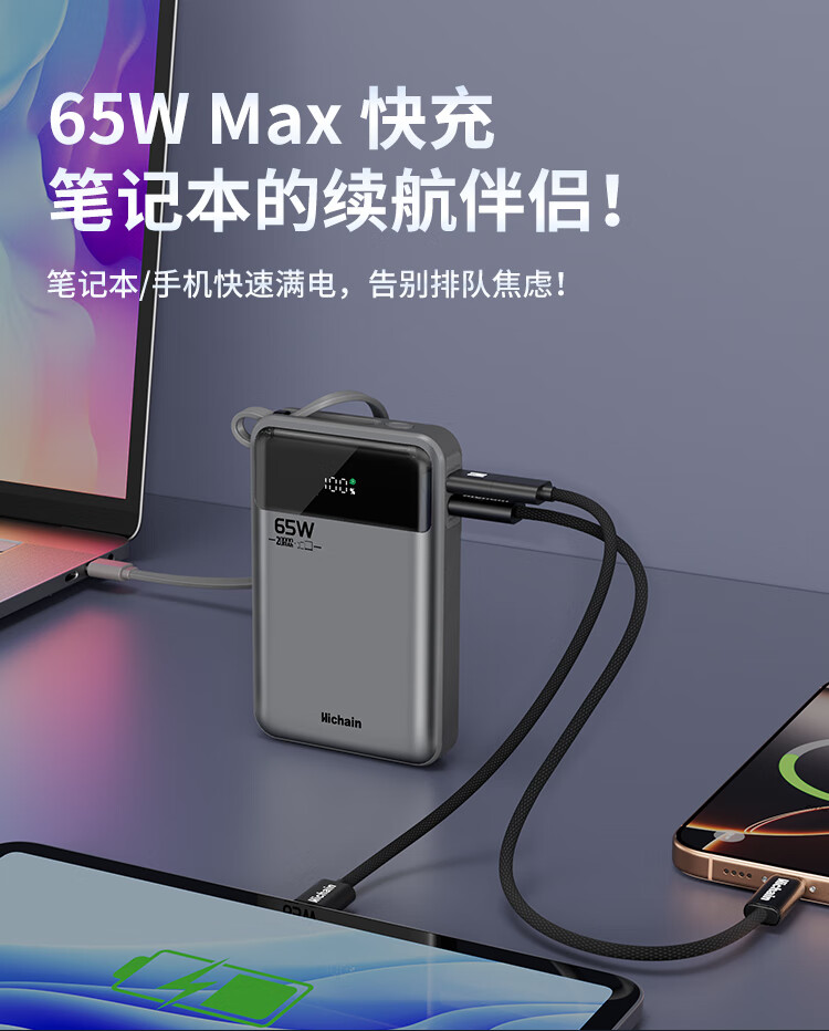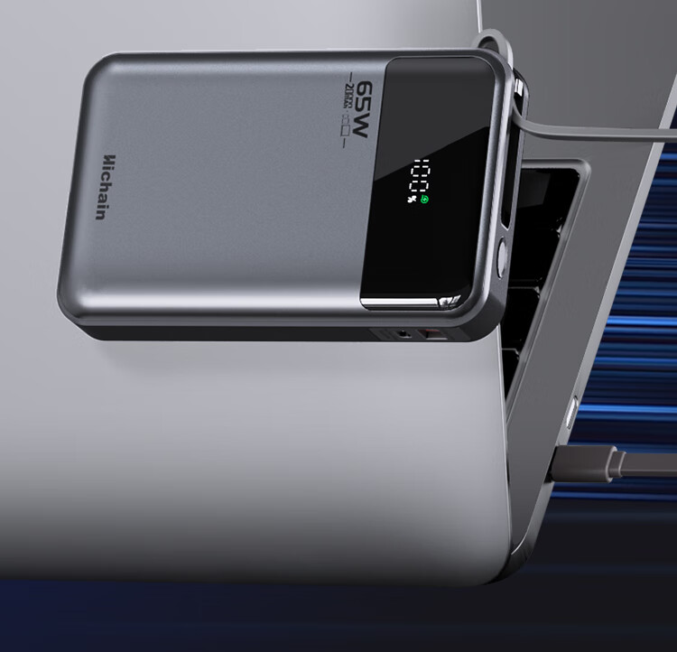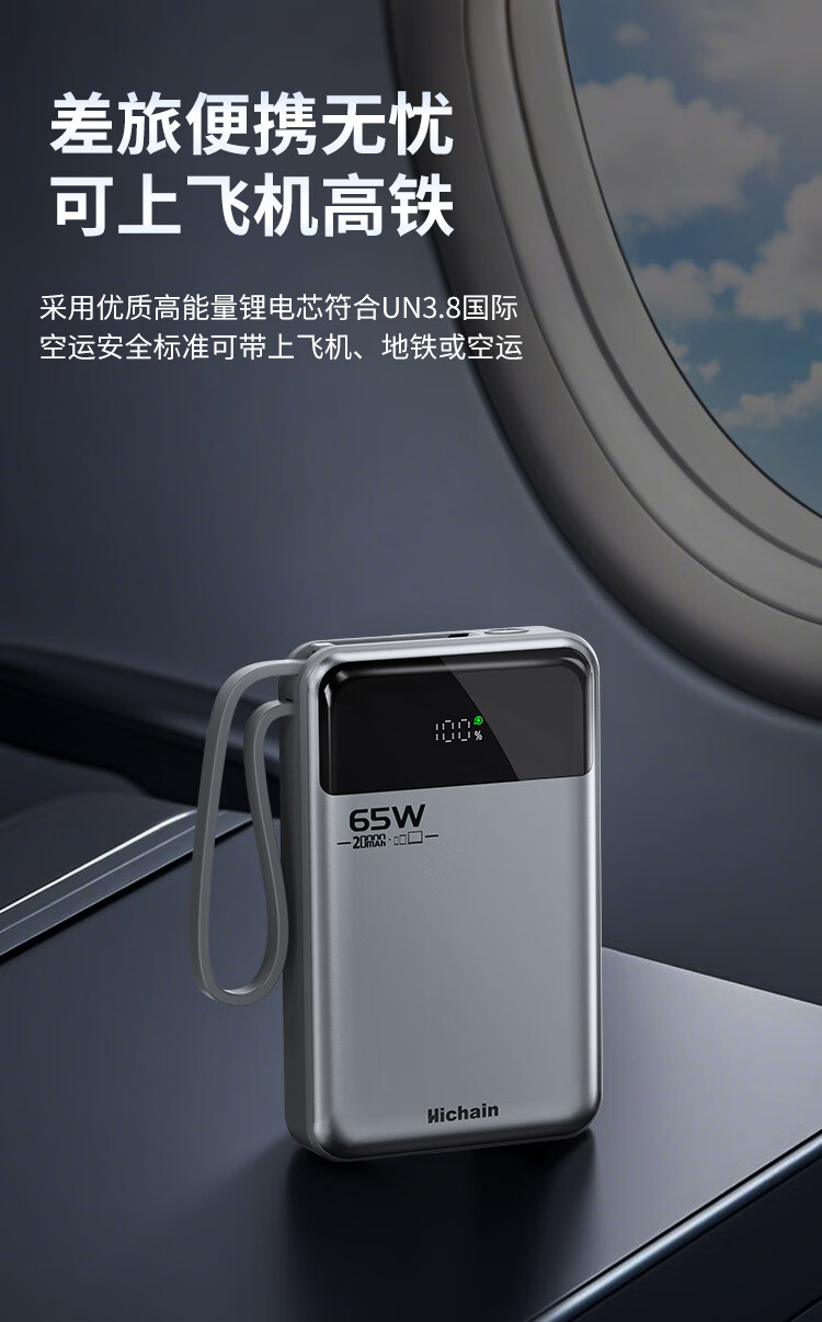 Hichain和昌【3C认证】充电宝移动电源65W大功率快充自带线20000毫安大容量便携小巧可上飞机可充笔记本 【65W双向快充| 笔记本电脑】20000mAh银