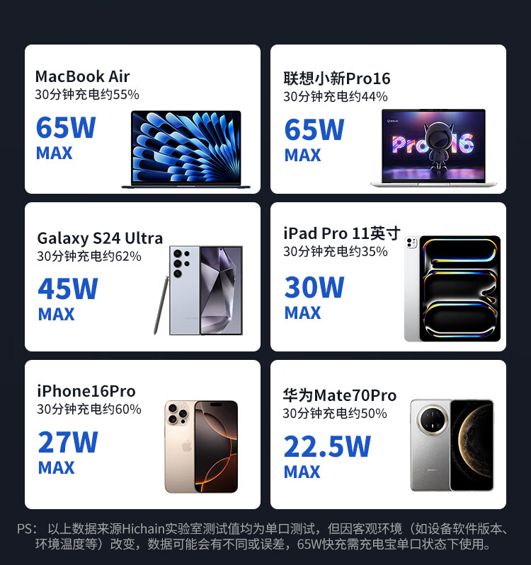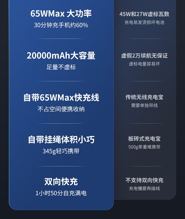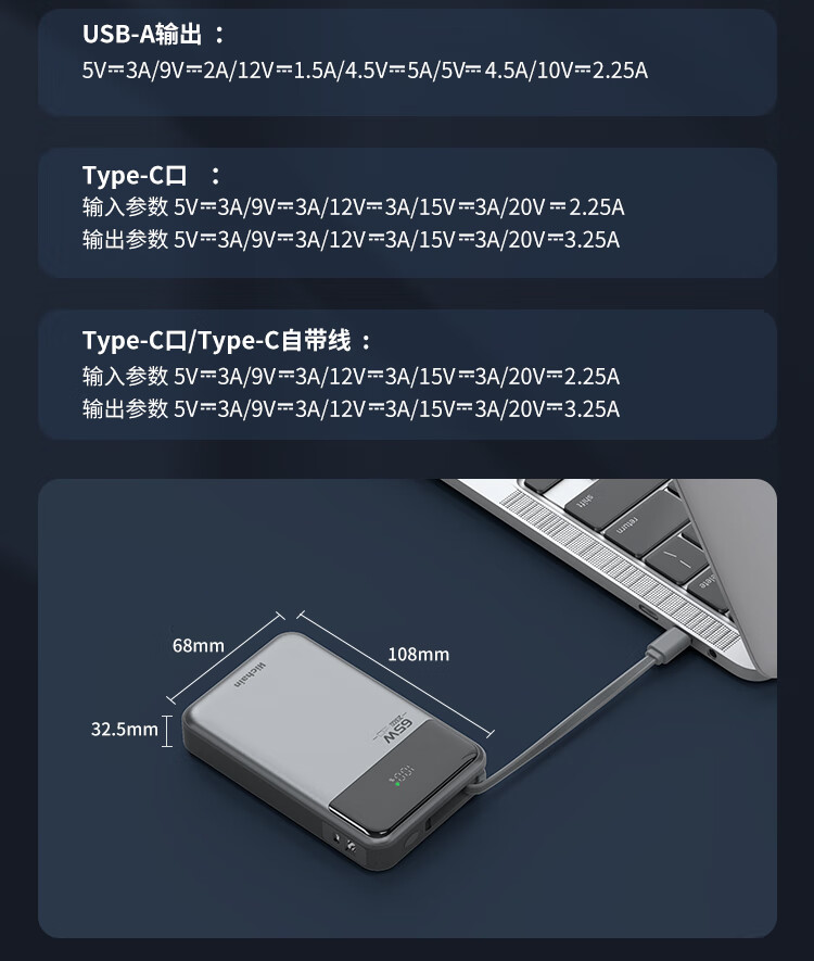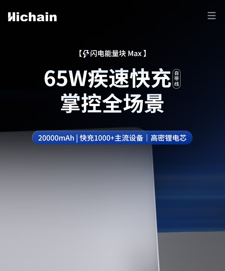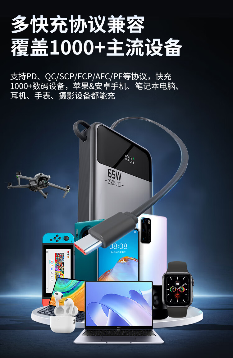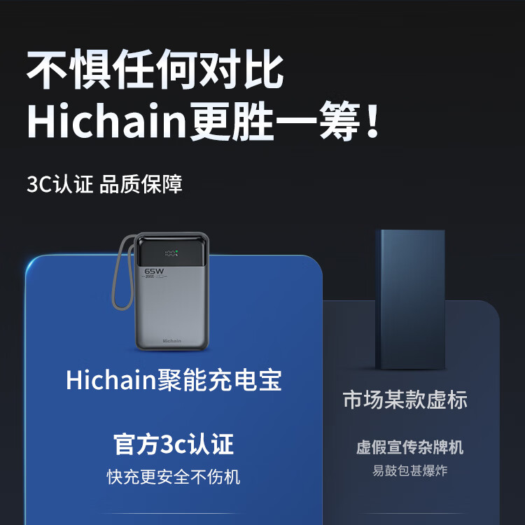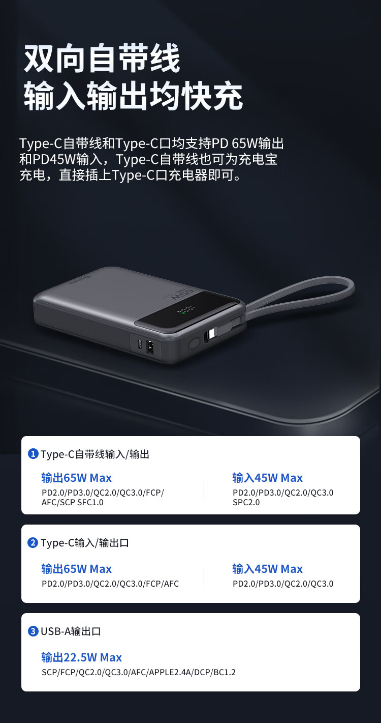 Hichain和昌【3C认证】充电宝移动电源65W大功率快充自带线20000毫安大容量便携小巧可上飞机可充笔记本 【65W双向快充| 笔记本电脑】20000mAh银