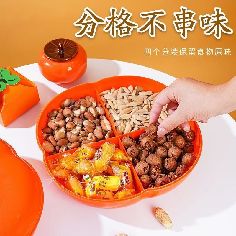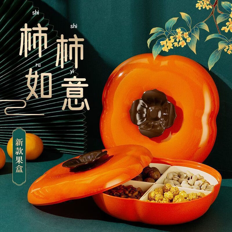首饰盒 新款柿柿如意果盘干果盒家用坚果盘节日装零食水果盘带盖 新款分格果盘【1个】