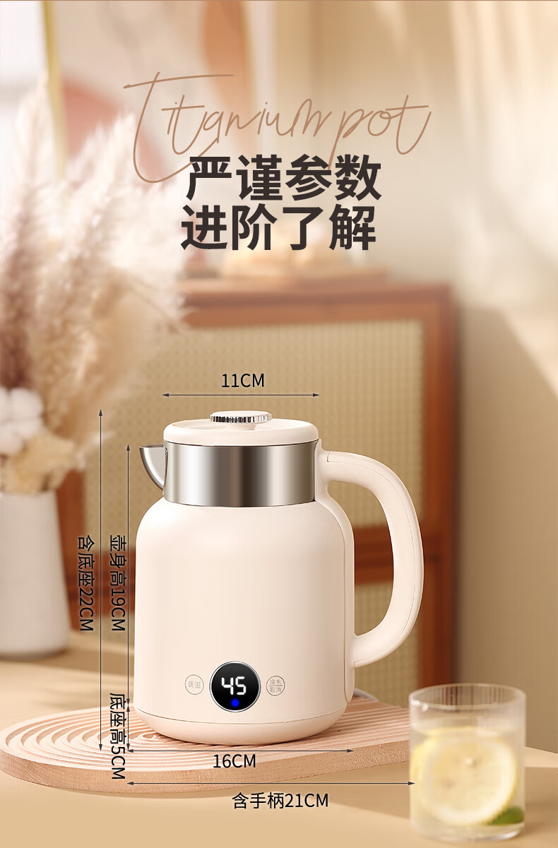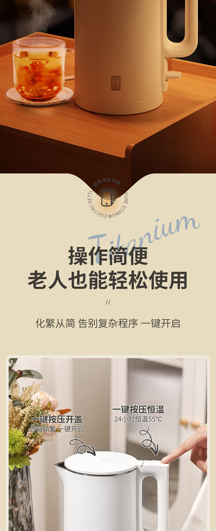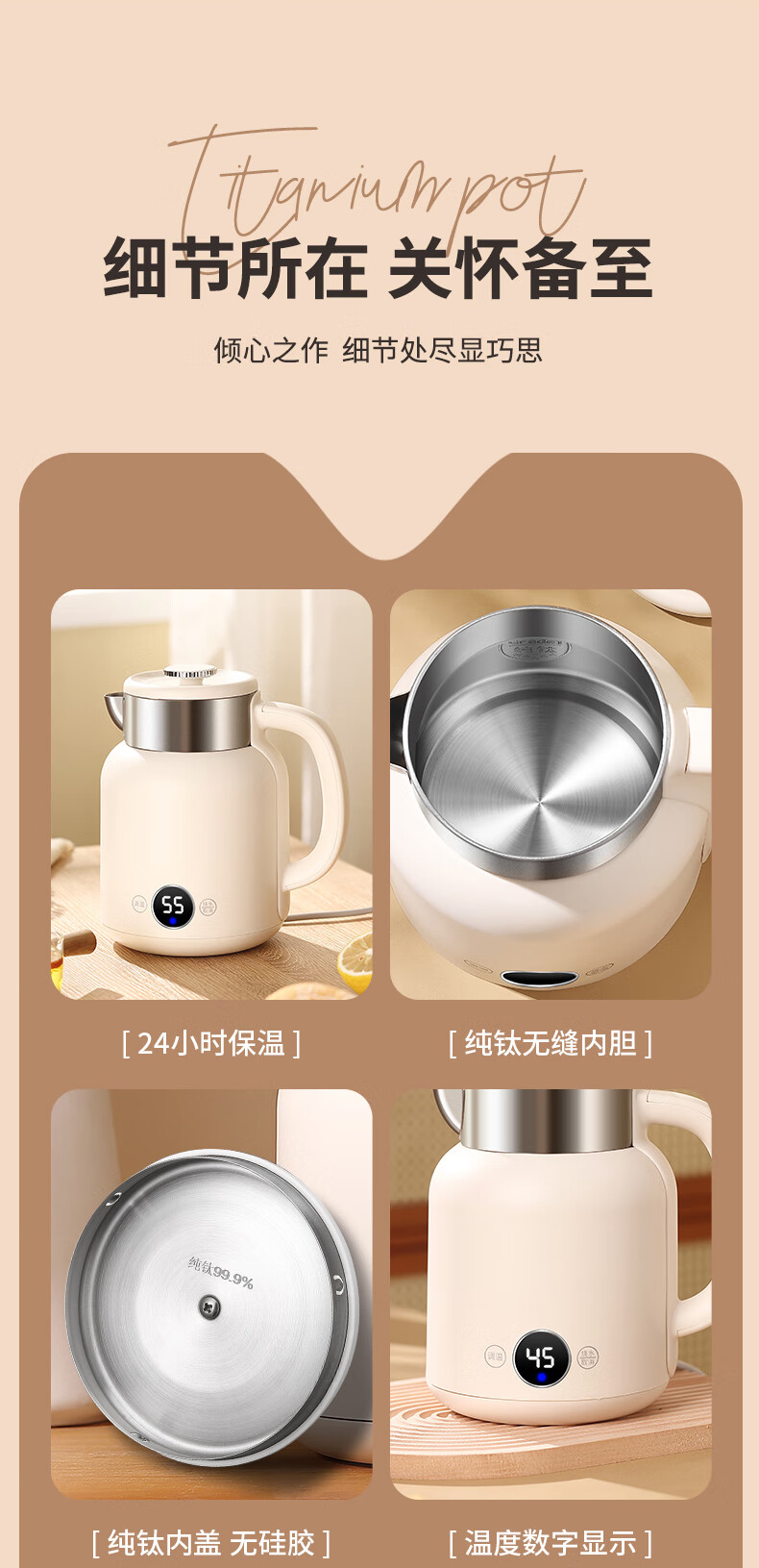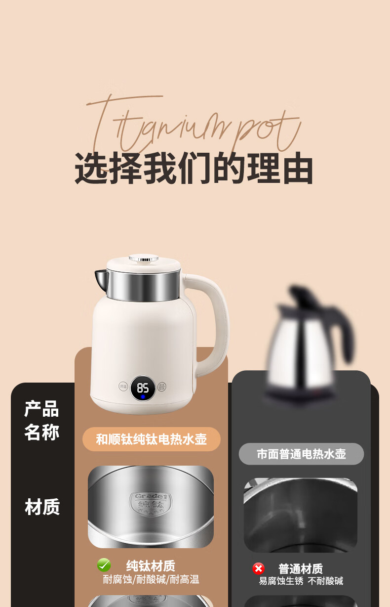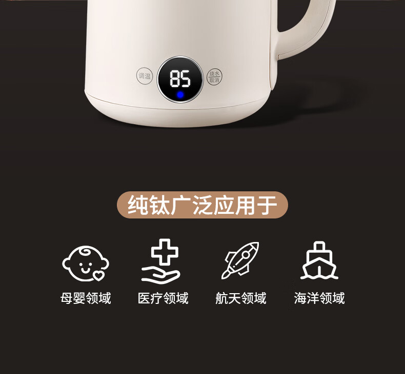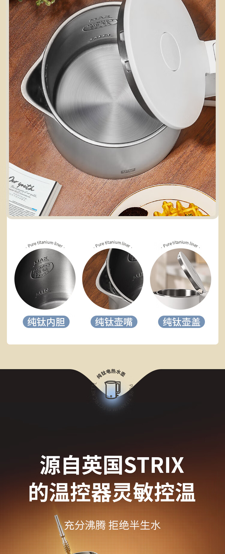 和顺钛和页钛纯钛电热水壶1.5L大容量电烧水壶无缝内胆一键烧水自动断电双层防烫电热壶全开盖设计 1.5L -纯钛全开盖【5段保温功能】
