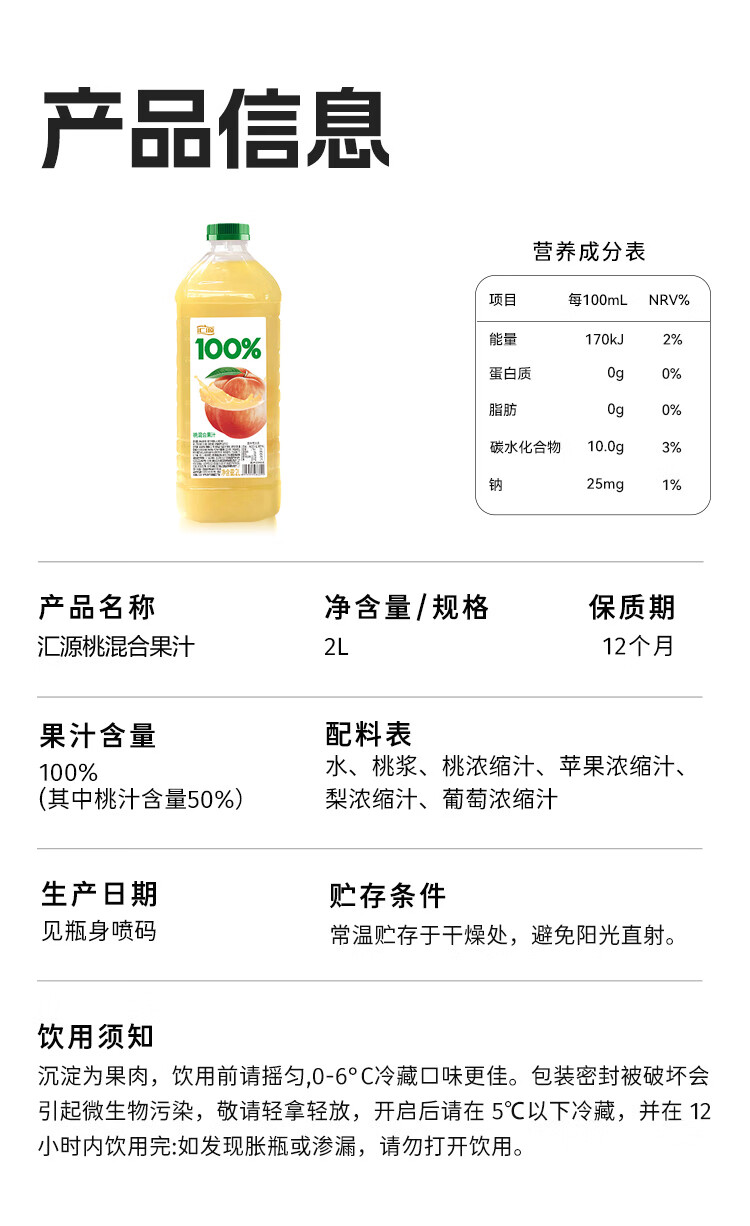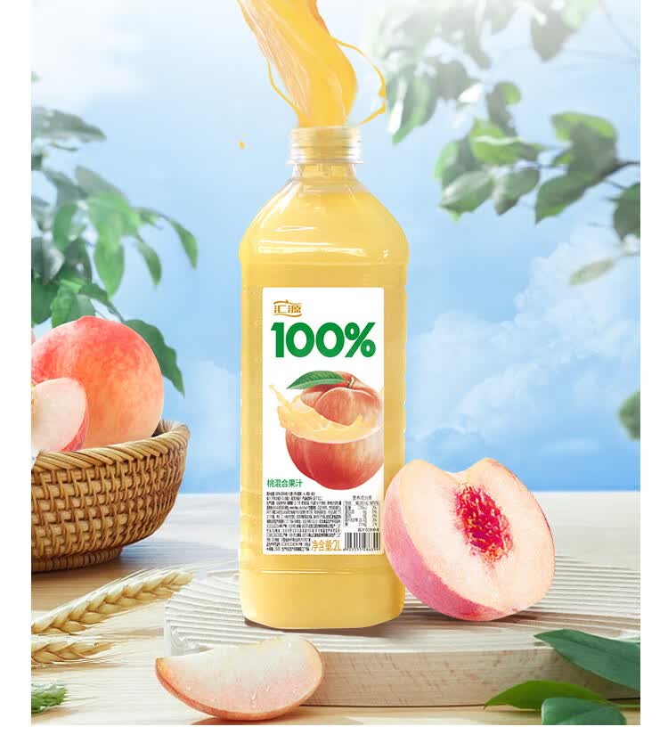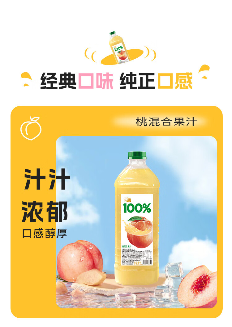 汇源100%桃混合果汁2000ml*1瓶2L尝鲜家庭分享聚餐游玩尝鲜
