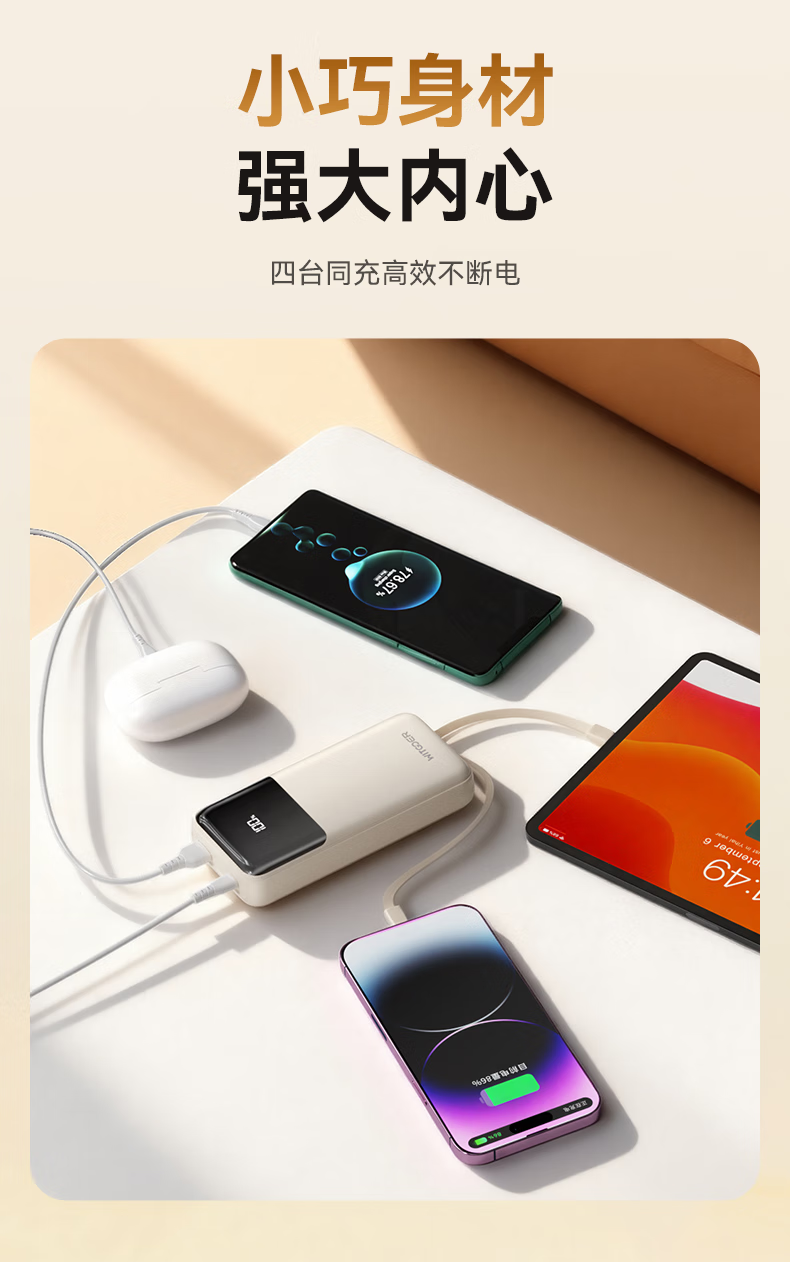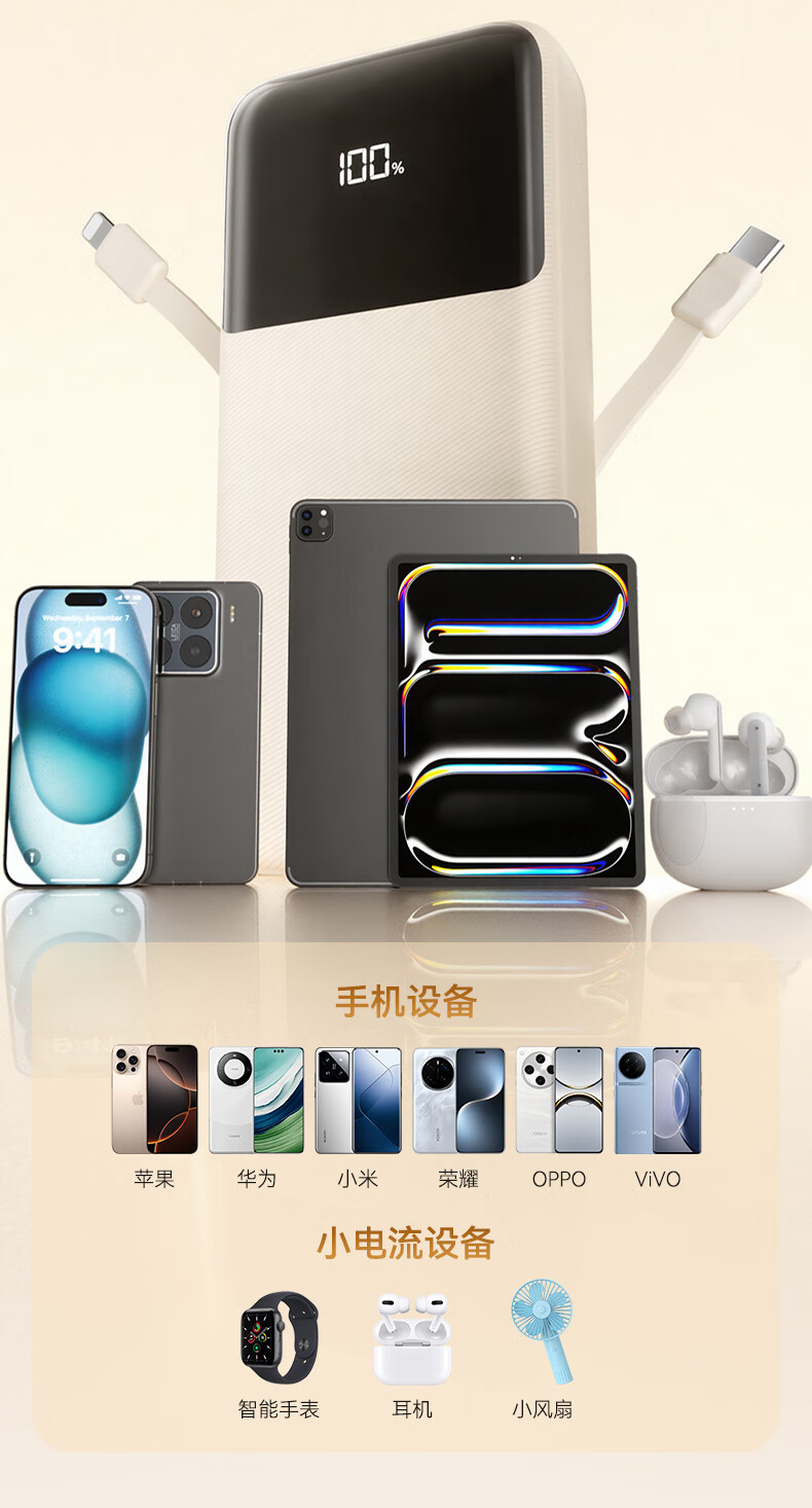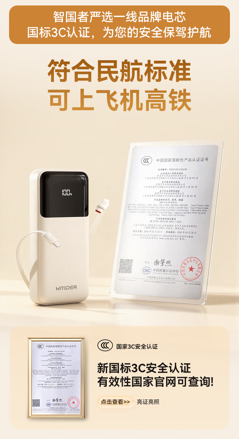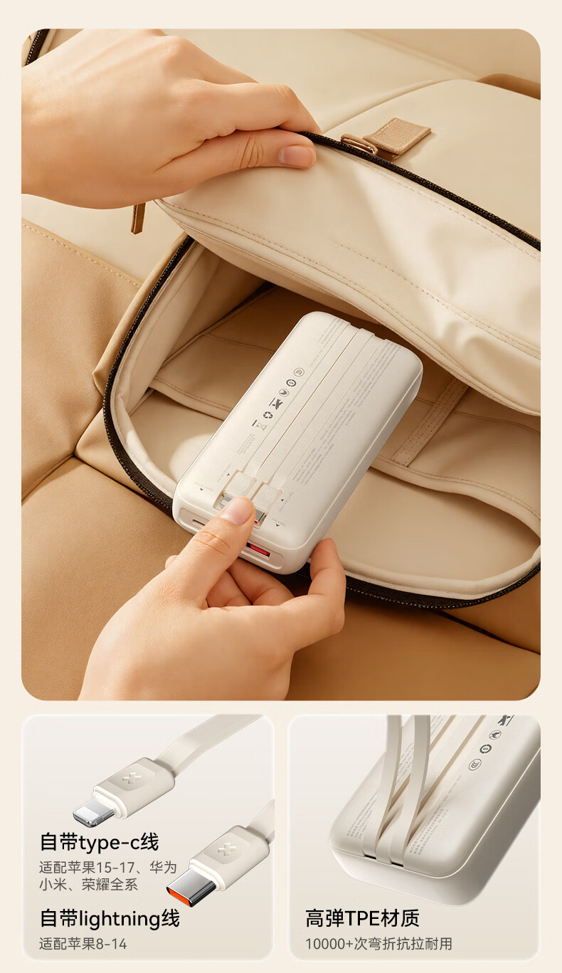智国者【3C认证可带上飞机】30W充电宝自带线20000毫安超级快充大容量移动电源适用于华为苹果17小米手机