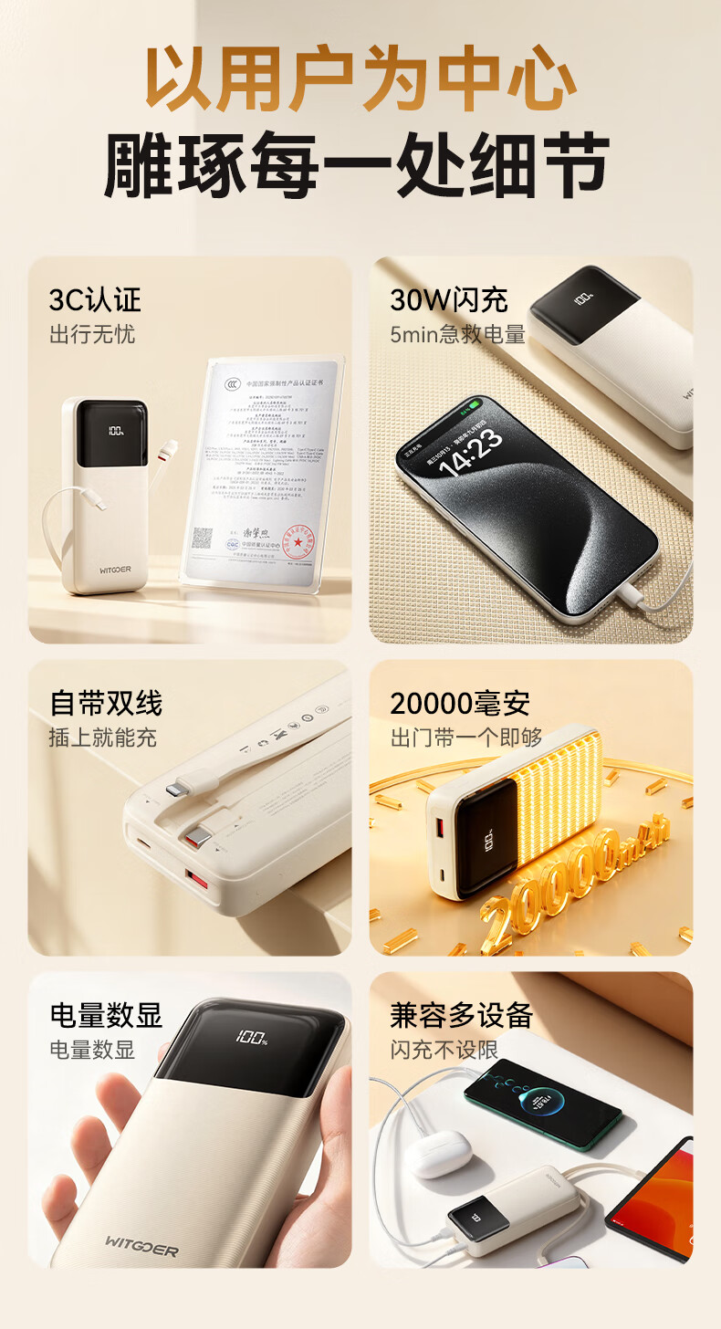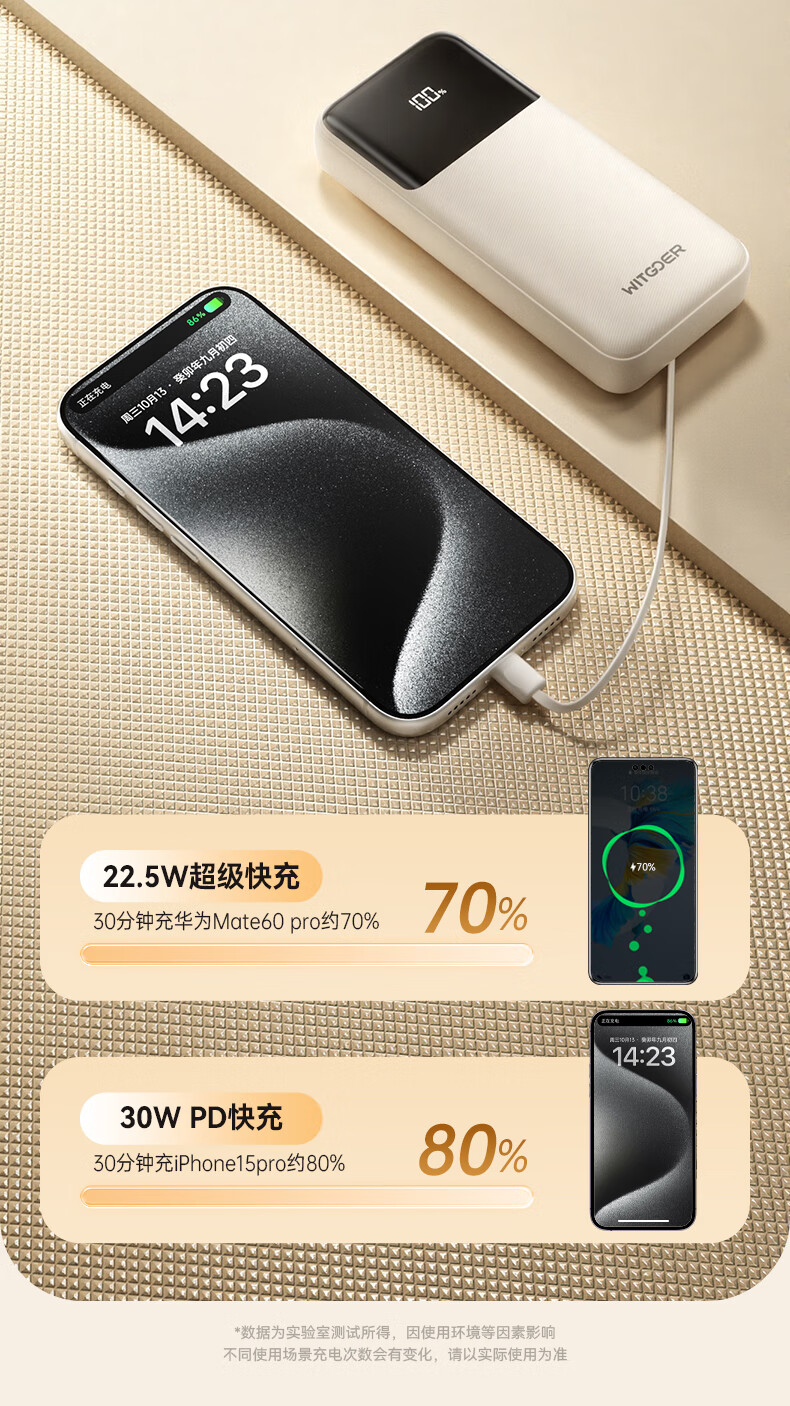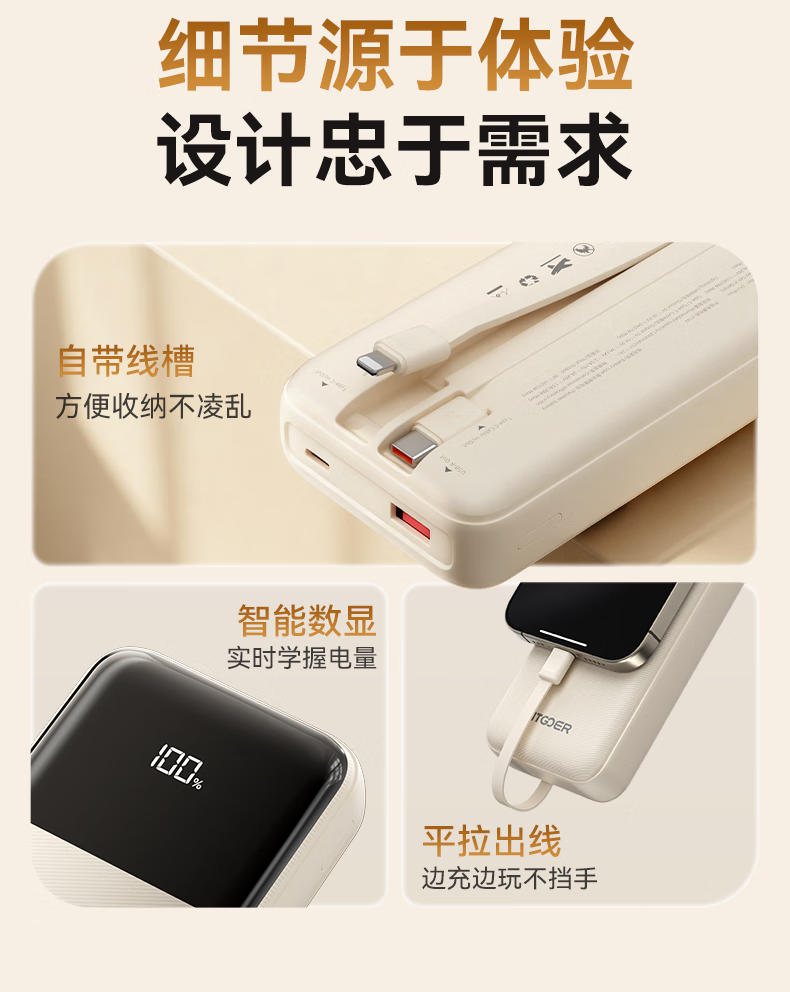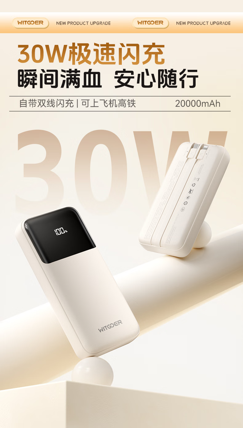 智国者【3C认证可带上飞机】30W充电宝自带线20000毫安超级快充大容量移动电源适用于华为苹果17小米手机