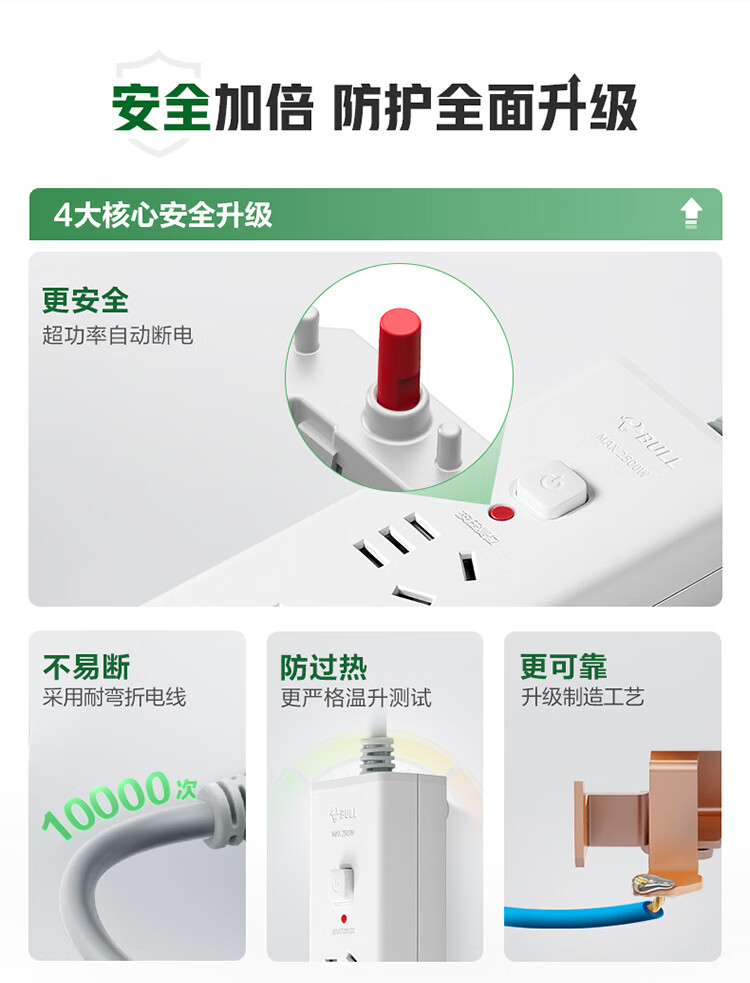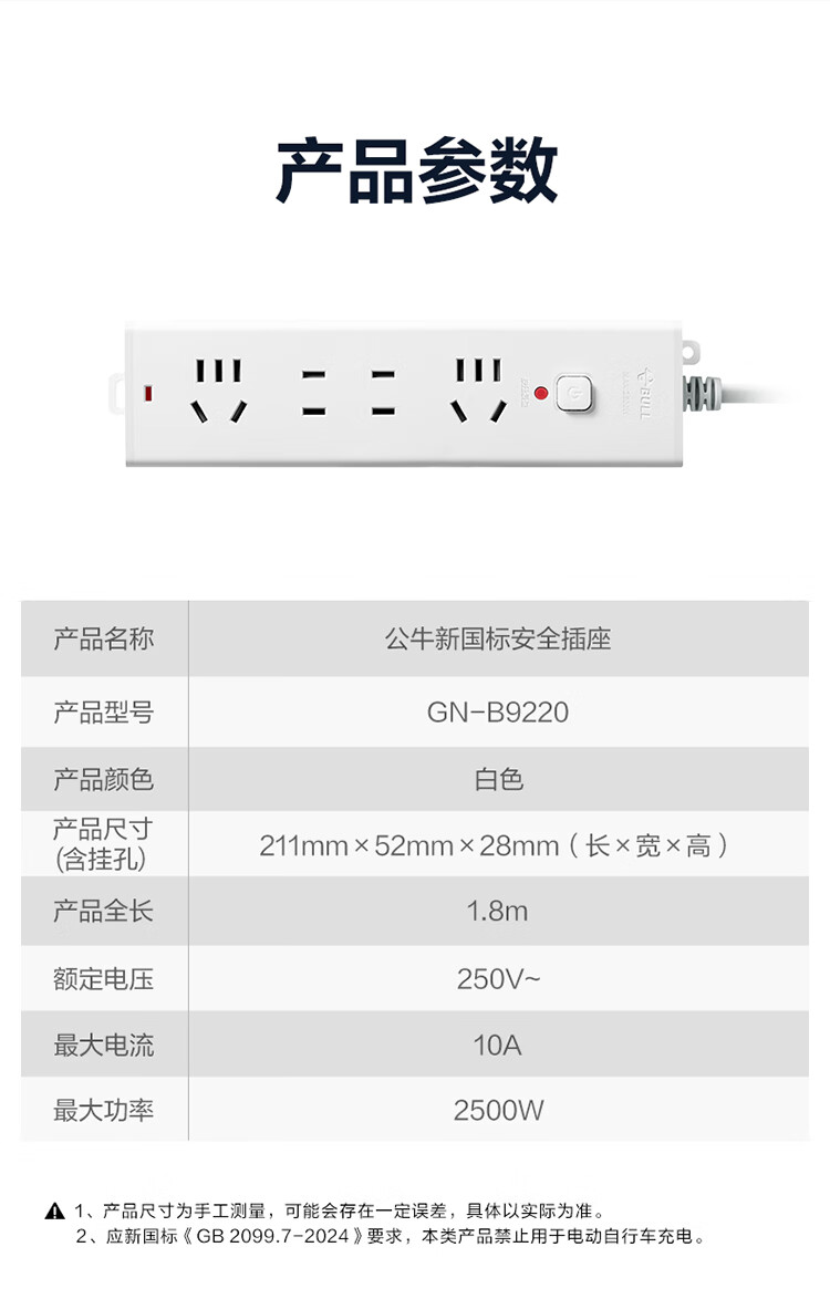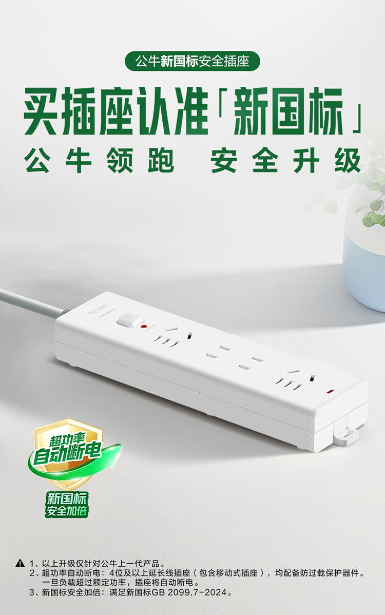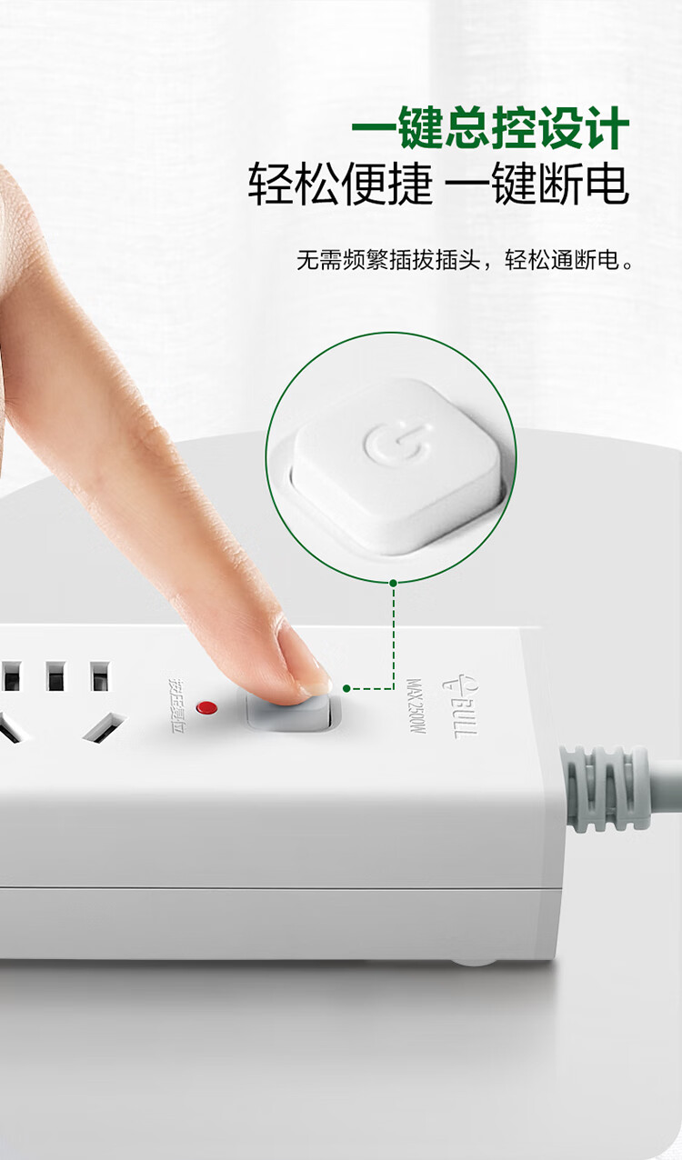 公牛(BULL)安全插座 白色排插转换器 B9220新国标超功率自动断电 【四位总控1.8米新国标】B9220 全长1.8米