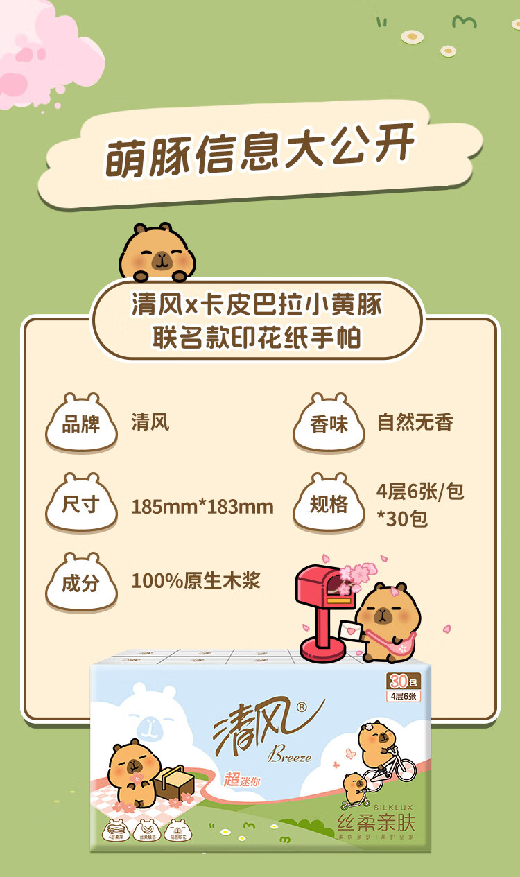 清风【李昀锐同款】卡皮巴拉手帕纸4层6张*30包 湿水不易破