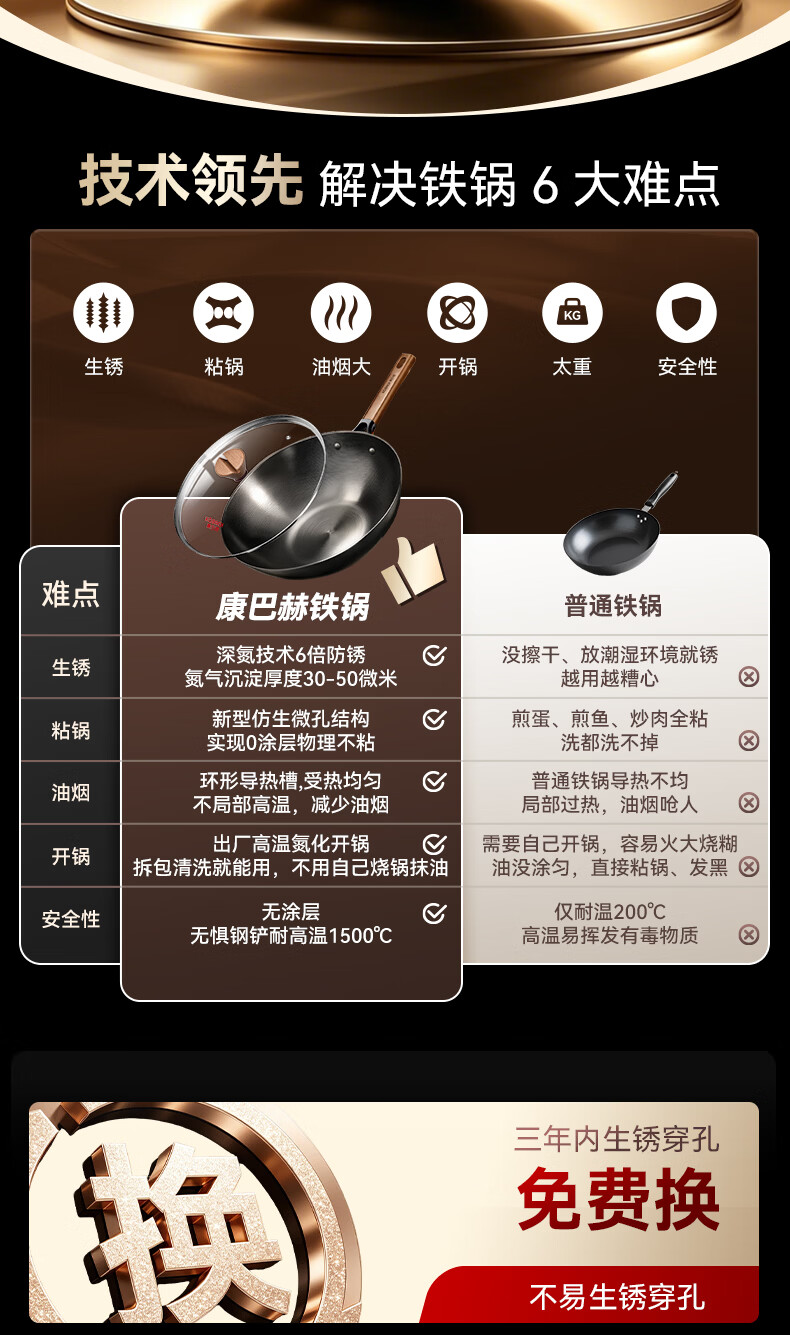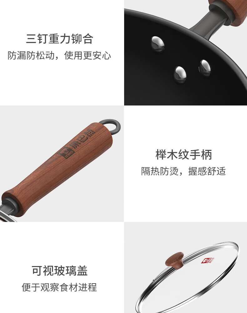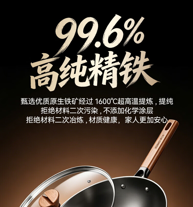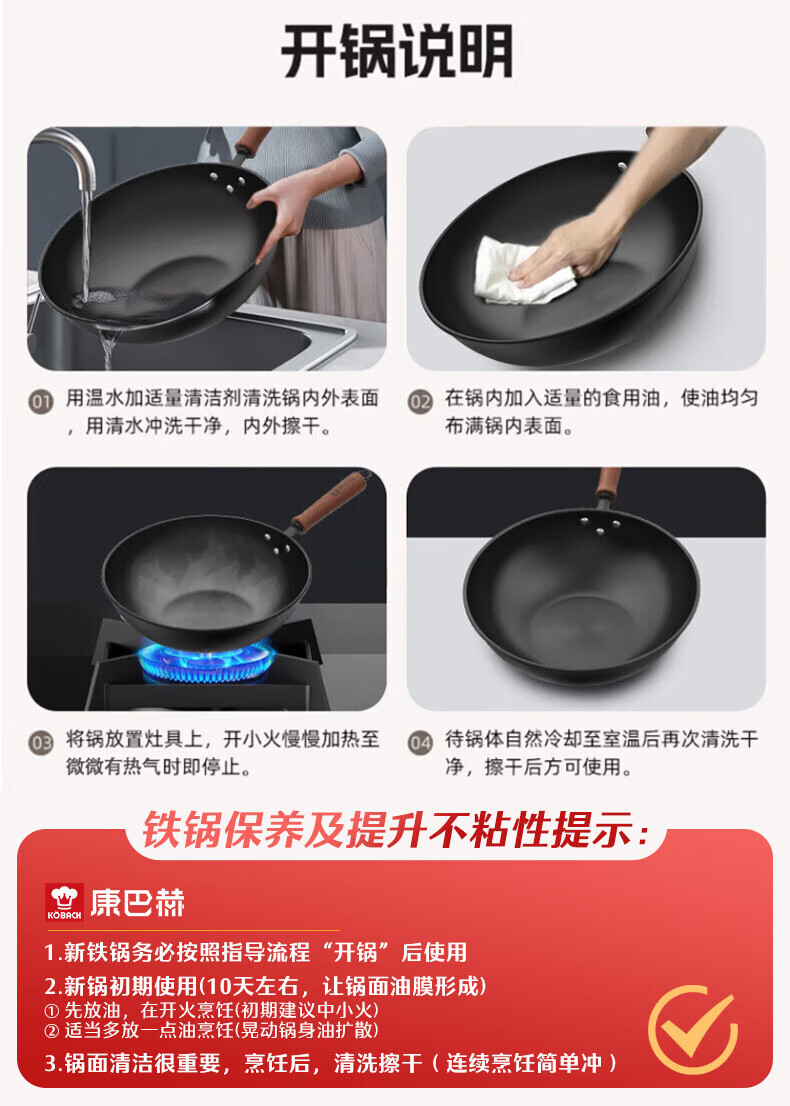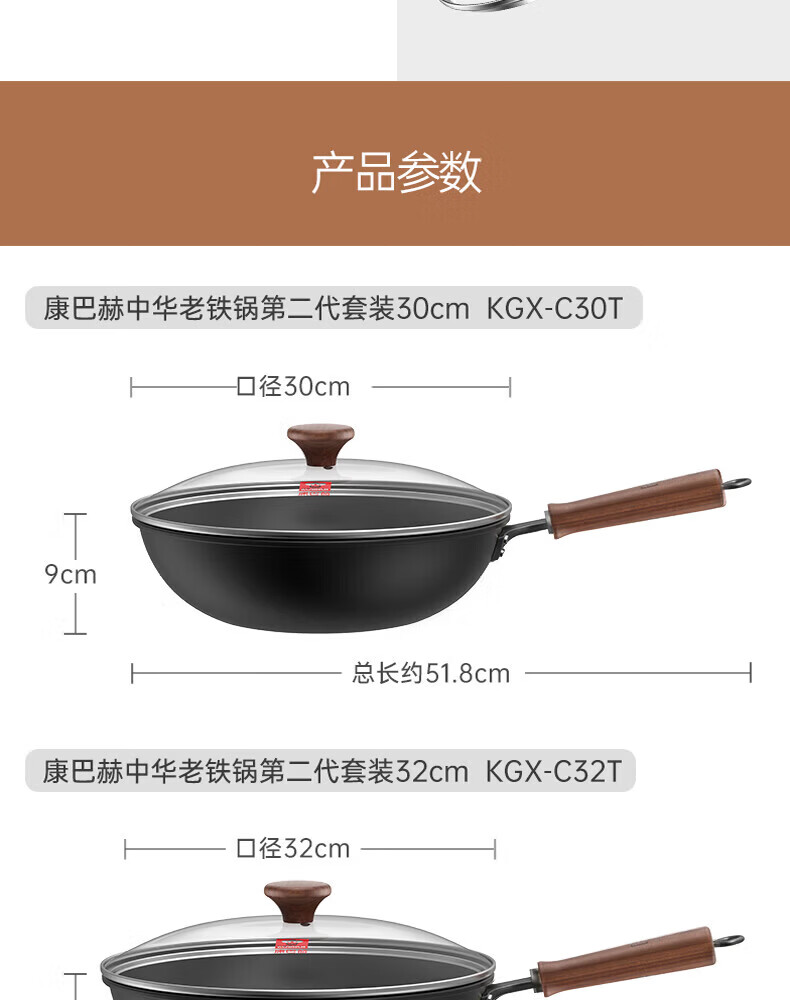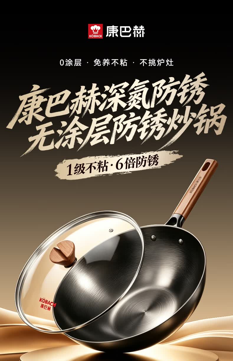 康巴赫(KOBACH)炒锅铁锅防锈0无涂层炒菜锅电磁炉燃气通用轻量化炒锅 高倍防锈轻量铁锅+锅盖 32cm