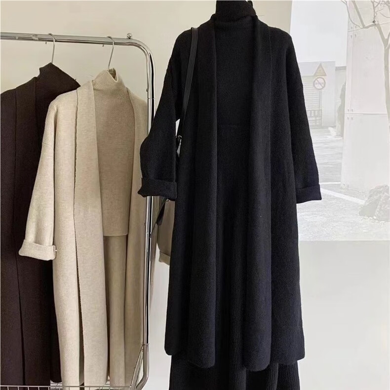 秋冬慵懒宽松时尚套装女针织长款披肩开衫+高领毛衣+半身裙三件套 咖色【三件套】 3XL 建议145-155斤