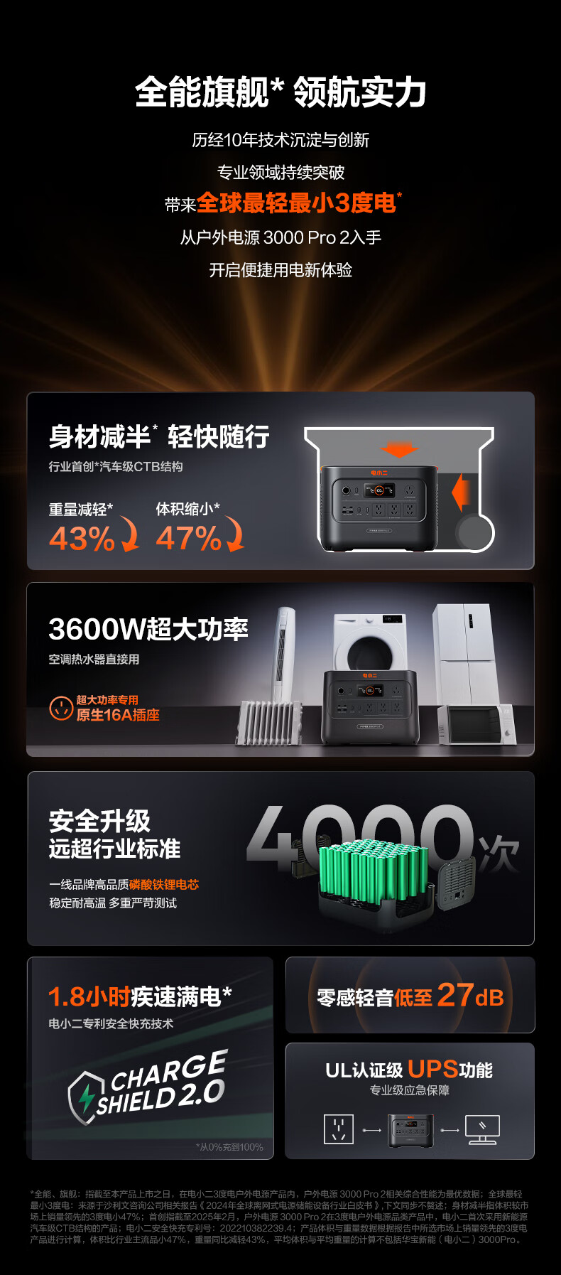 电小二【3度电新品3600W大功率】大容量快充户外电源220V移动电源户外作业停电应急备用储能电源3000Pro2