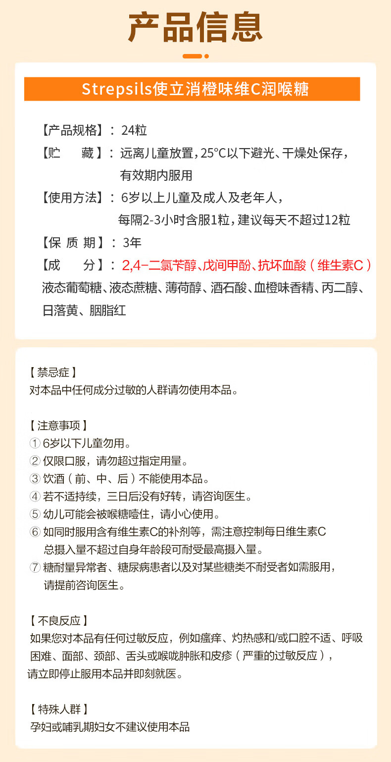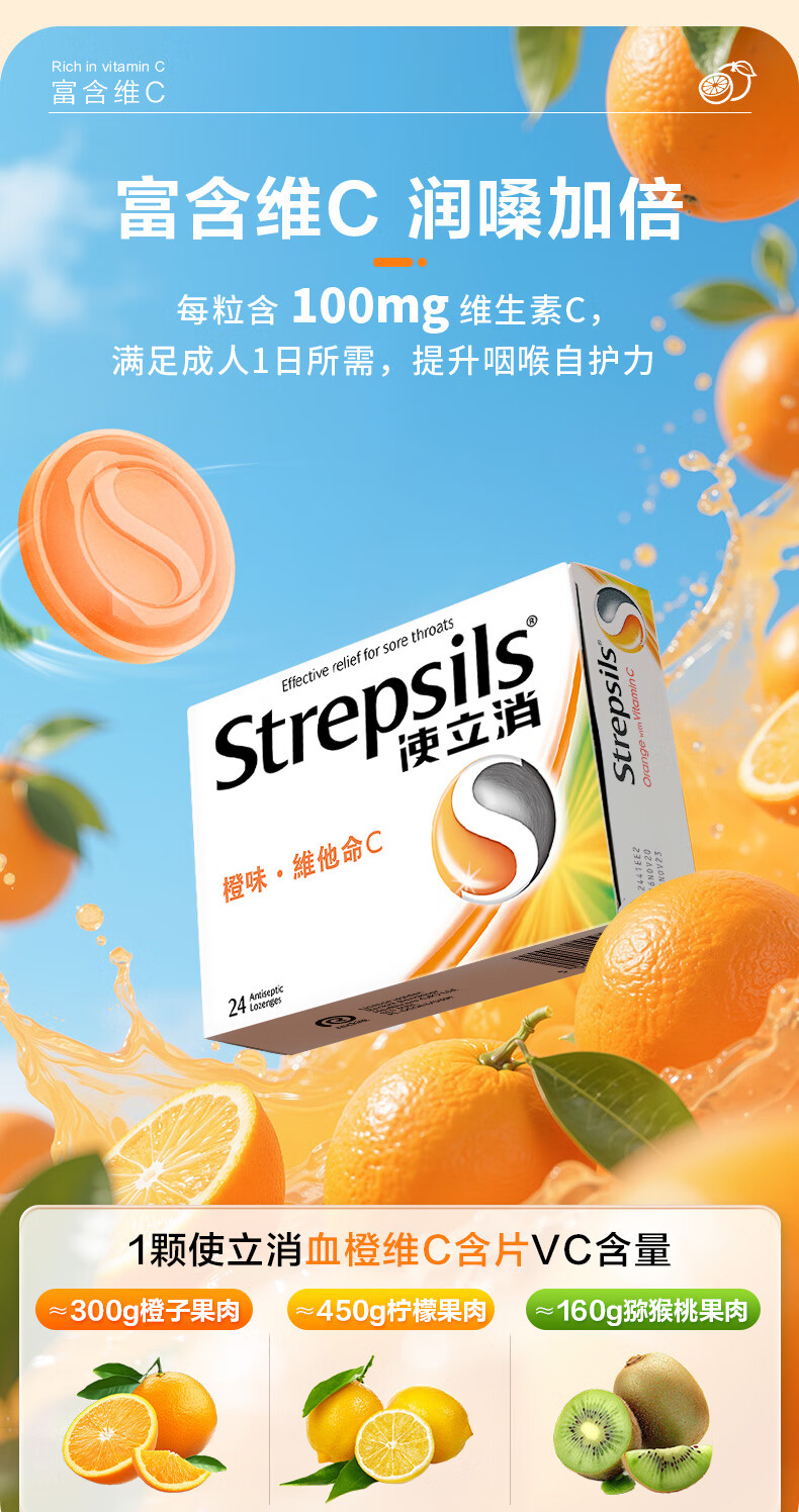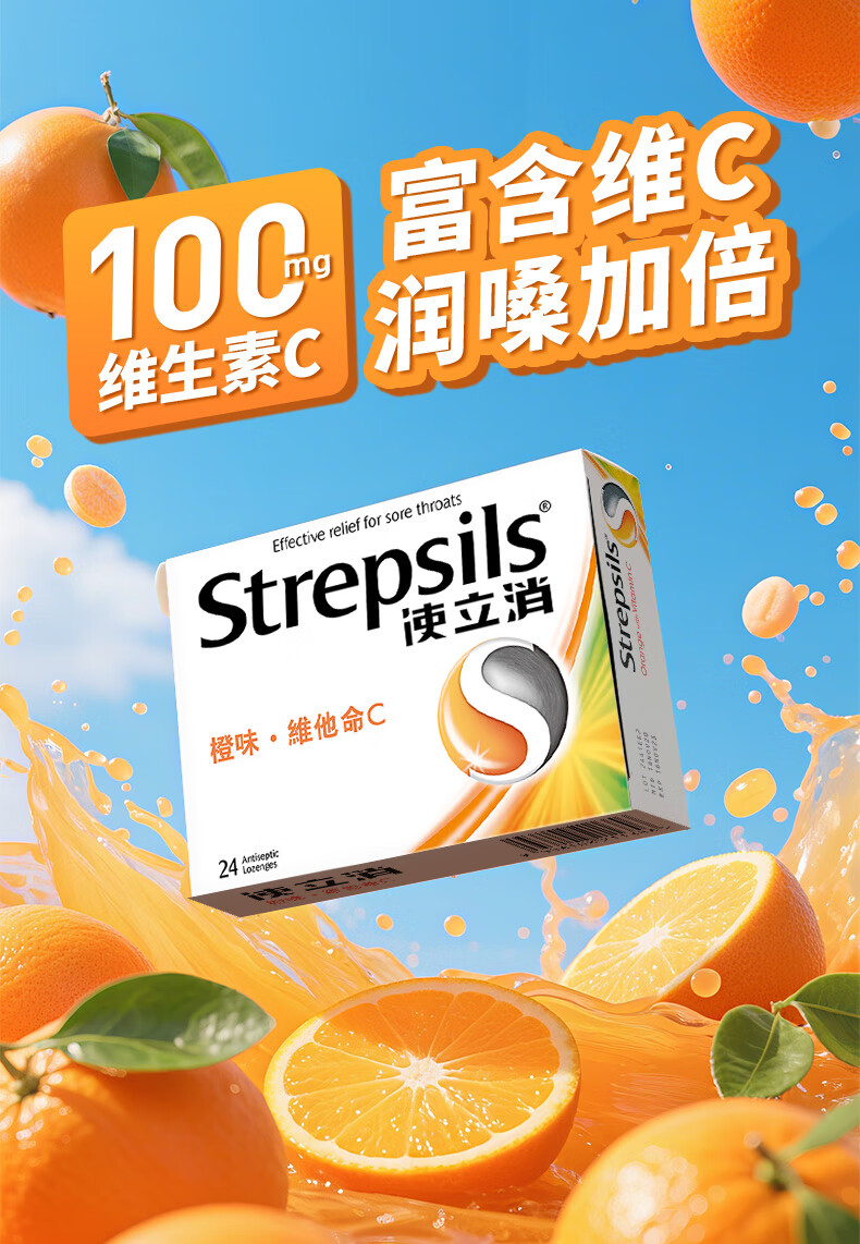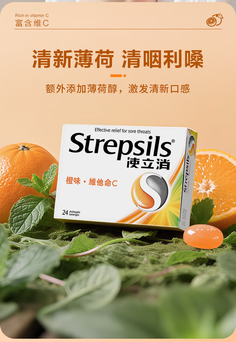 使立消Strepsils润喉糖喉咙痛含片血橙维C24粒 止咳嗽慢性咽炎喉炎流感冒护嗓子疼痒痛薄荷糖喉片儿童自营