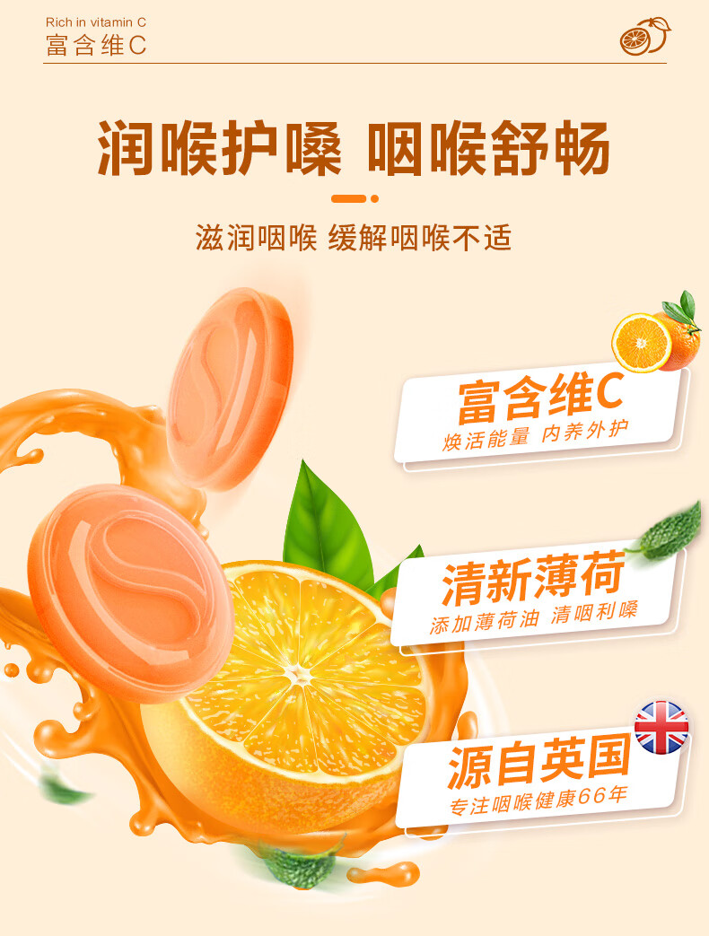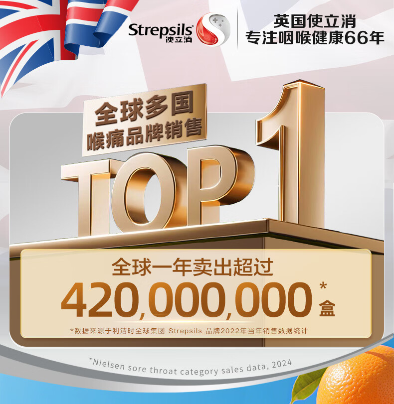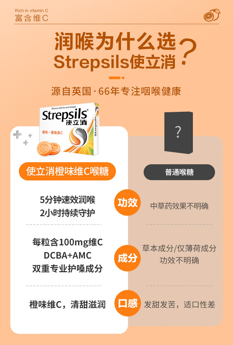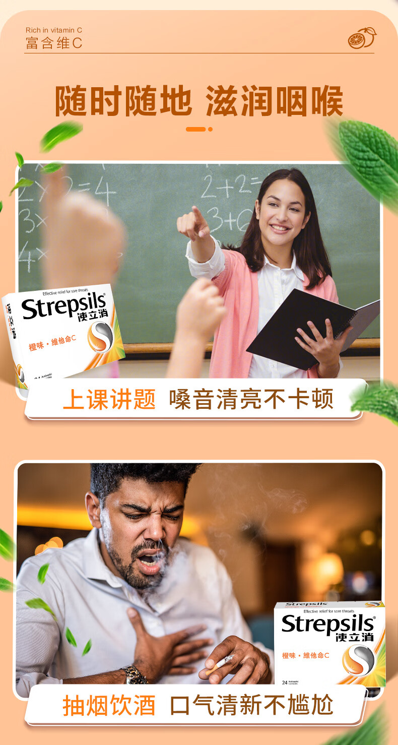 使立消Strepsils润喉糖喉咙痛含片血橙维C24粒 止咳嗽慢性咽炎喉炎流感冒护嗓子疼痒痛薄荷糖喉片儿童自营